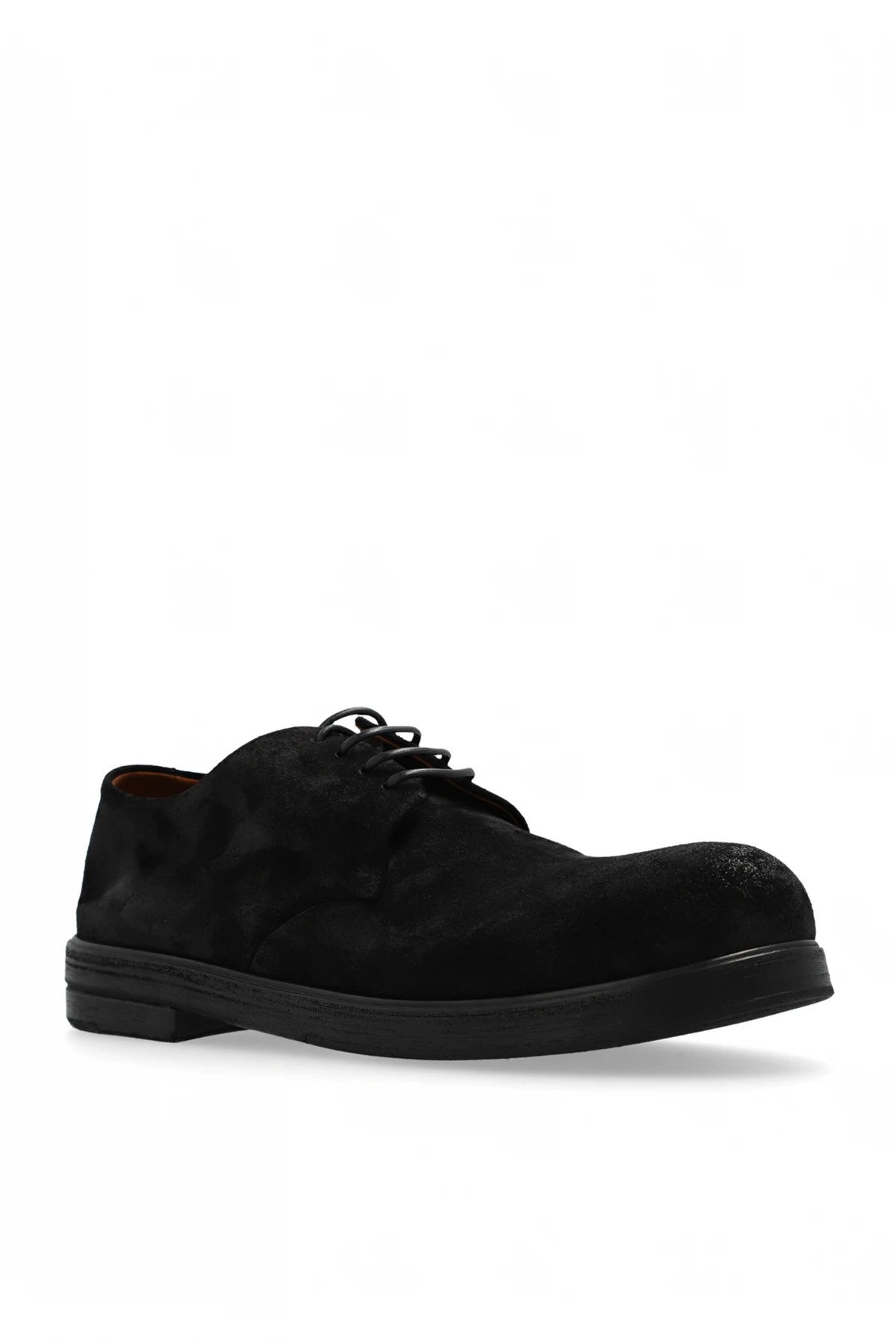 Introducing the ‘Zucca Zeppa’ Leather Shoes by Marsell, a testament to the venerable tradition of exquisite shoemaking. These shoes are the epitome of classic elegance, designed for the discerning gentleman who appreciates the fine balance between traditional aesthetics and modern sophistication. Crafted from premium suede leather, the ‘Zucca Zeppa’ boasts a texture and appearance that exude understated luxury. The black hue of the shoes, complemented by matching laces, creates a seamless and polished look, perfect for a variety of occasions. The interior reveals a contrasting finish in a warm beige or brown shade, adding an unexpected twist to its design. The robust leather and rubber sole ensures stability and longevity, while the decorative stitching adds a touch of elegance. With a rounded toe shape, these shoes offer a comfortable fit without compromising on style. Notably, the absence of an external designer logo speaks to Marsell’s commitment to subtlety and quality over overt branding. Adorned with a unique distressed effect, these shoes are not only a pair of footwear but a piece of artistry, demonstrating the meticulous craftsmanship Marsell is renowned for. Why Purchase This Product? Exquisite suede leather construction for luxury and durability. Elegant black color with a contrasting interior finish for a distinctive look. Stable and comfortable leather and rubber sole with anti-slip inserts. Subtle design with no external branding, focusing on quality and craftsmanship. Unique distressed effect, adding character and style.