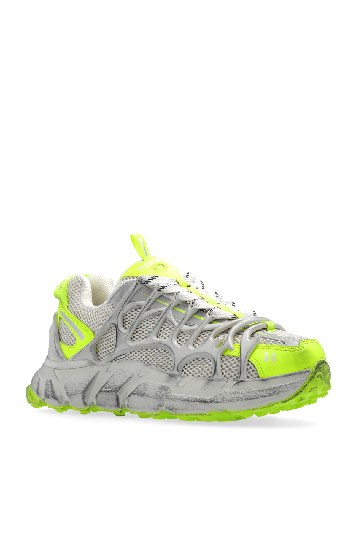 Introducing the Symbiont 2 by 44 Label Group, a pinnacle of athletic elegance and engineering precision. Crafted for those who refuse to compromise on performance or style, these sneakers boast a sophisticated grey palette with vibrant neon green accents, ensuring visibility and vitality in every step. Constructed with a robust, multi-layered assembly that combines rubber and high-quality fabric, the Symbiont 2 promises durability and breathability. Its meticulously designed mesh allows for optimal ventilation, while reinforced areas offer increased stability and longevity. The sneaker\'s substantial sole features advanced cushioning and traction segments, highlighted in neon green for an extra pop of color, enhancing both its aesthetic appeal and functional prowess. Flat, white laces provide a striking contrast, ensuring a snug fit, while branded inscriptions on the tongue subtly nod to its prestigious lineage. The interior is lined with a soft material, including a branded insole, to deliver unparalleled comfort during the most rigorous activities. Why Purchase the Symbiont 2? Exceptional Craftsmanship: A testament to 44 Label Group\'s commitment to quality, combining rubber and premium fabric for supreme endurance. Advanced Comfort and Stability: Thoughtful reinforcements and a state-of-the-art sole design ensure both comfort and support. Striking Design: The grey and neon green color scheme offers a dynamic look that stands out both on and off the track. Optimal Ventilation: The breathable mesh keeps feet cool, making it perfect for any activity or weather condition.