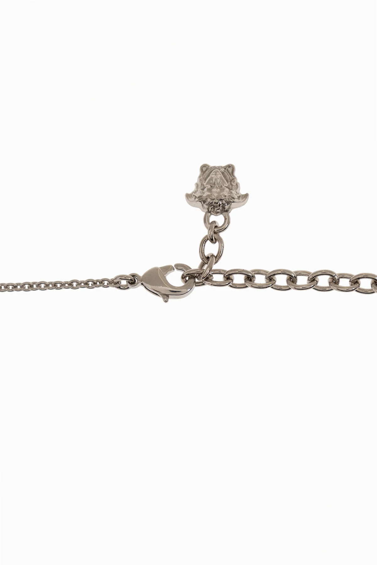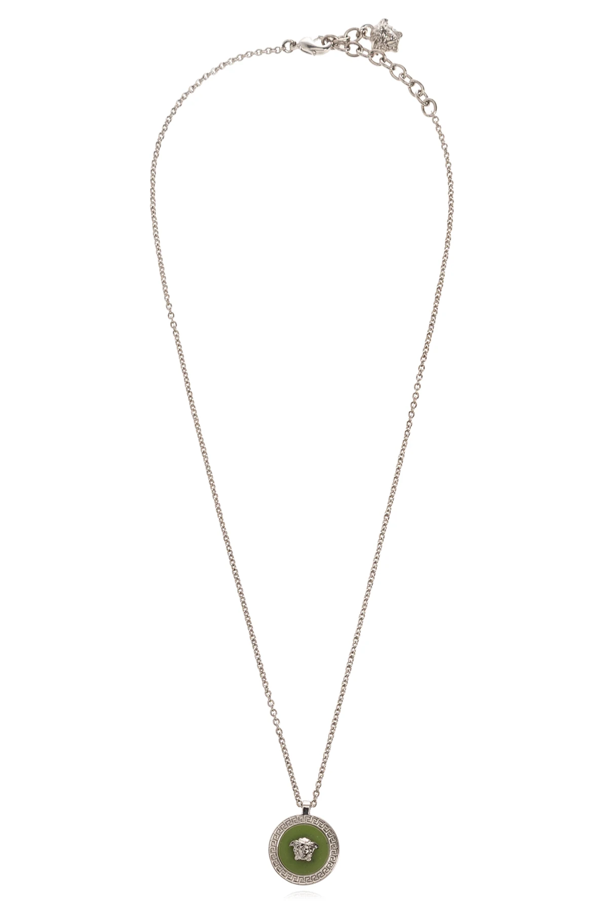 Silver-tone necklace from Versace. Fastened with a carabiner closure, this item features a decorative round pendant with green enamel and the brand’s signature Medusa head.