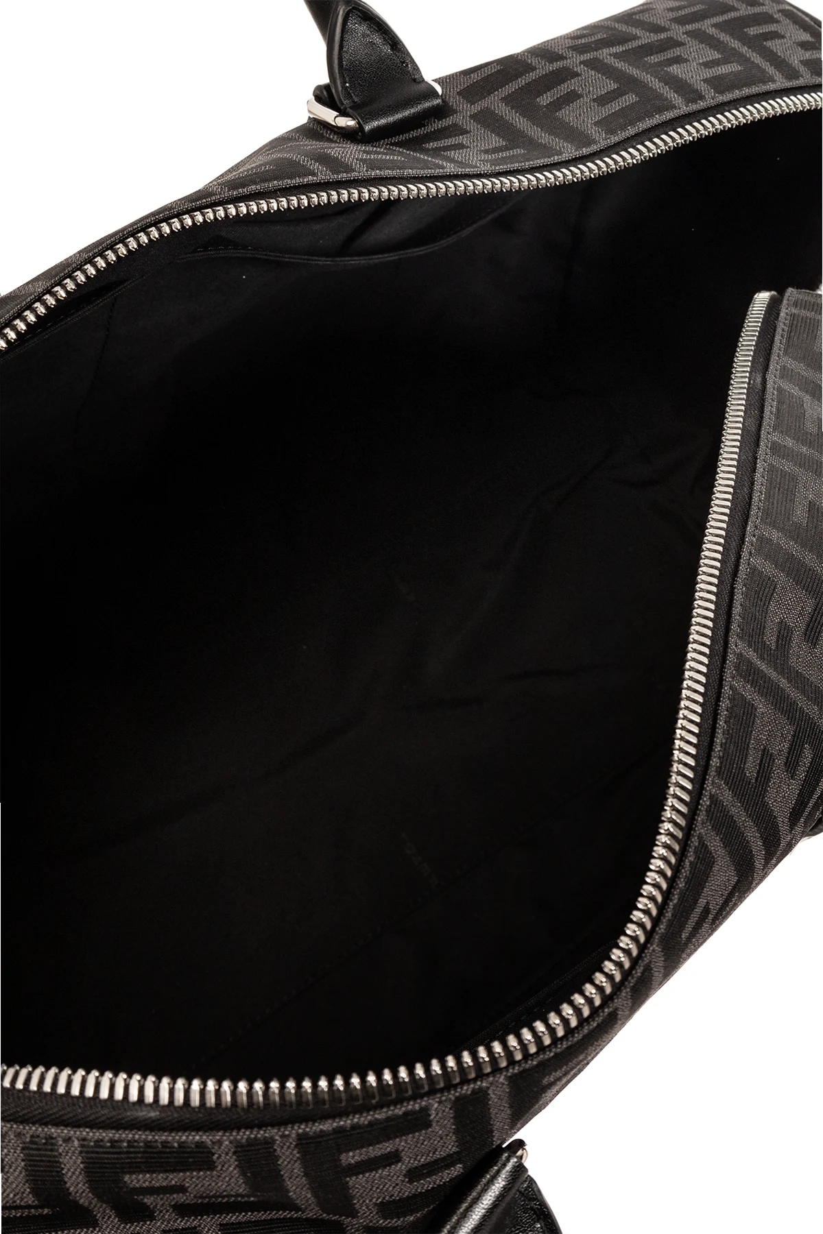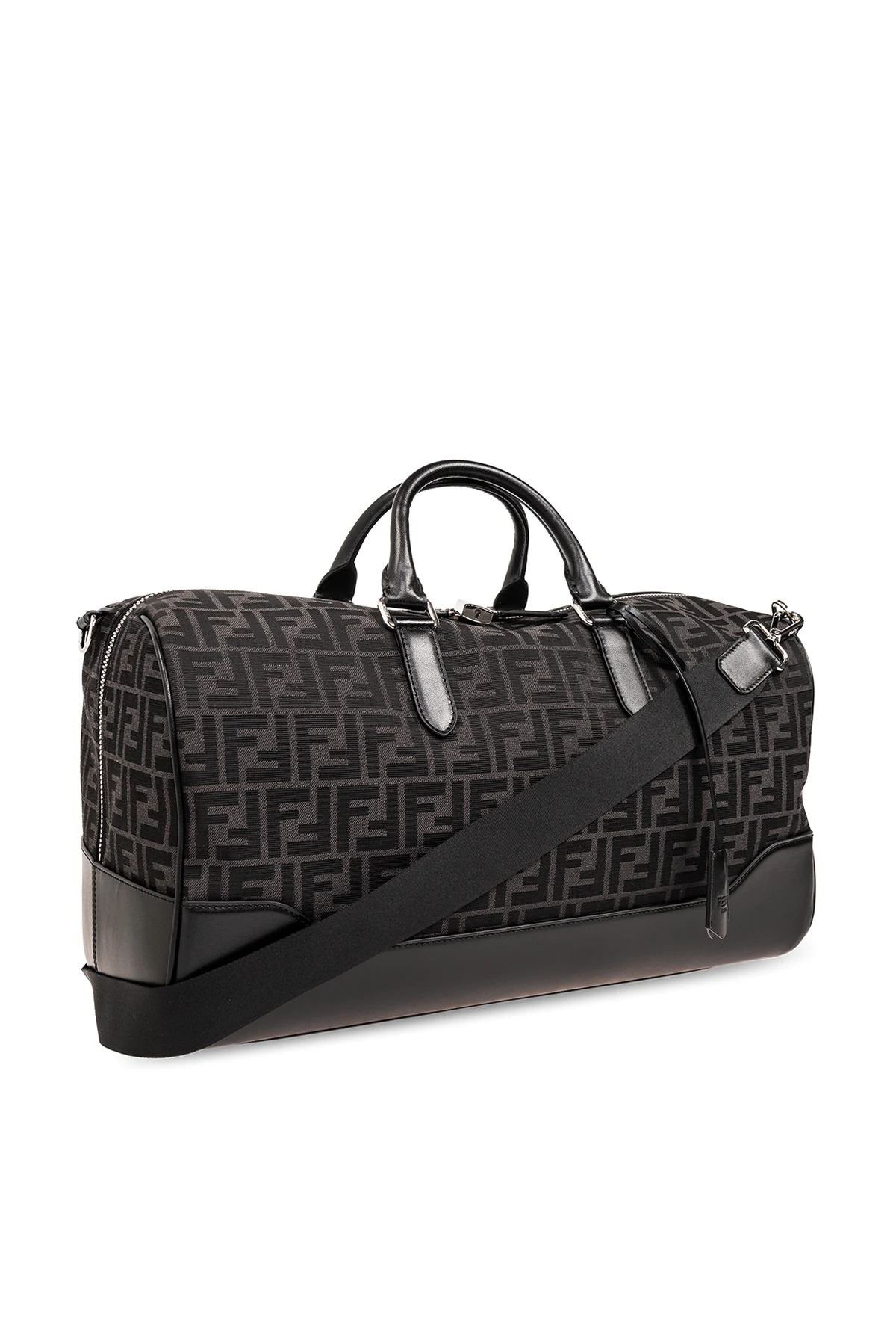 Grey and black jacquard duffel bag from Fendi. Made from material, this design showcases the ‘FF’ monogram pattern, two half-round handles, silver-tone metal hardware as well as a detachable shoulder strap and one internal compartment with four slip pockets.