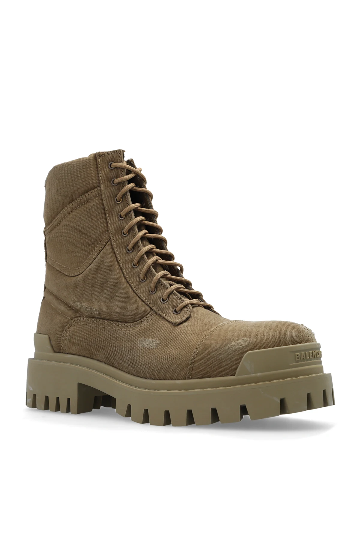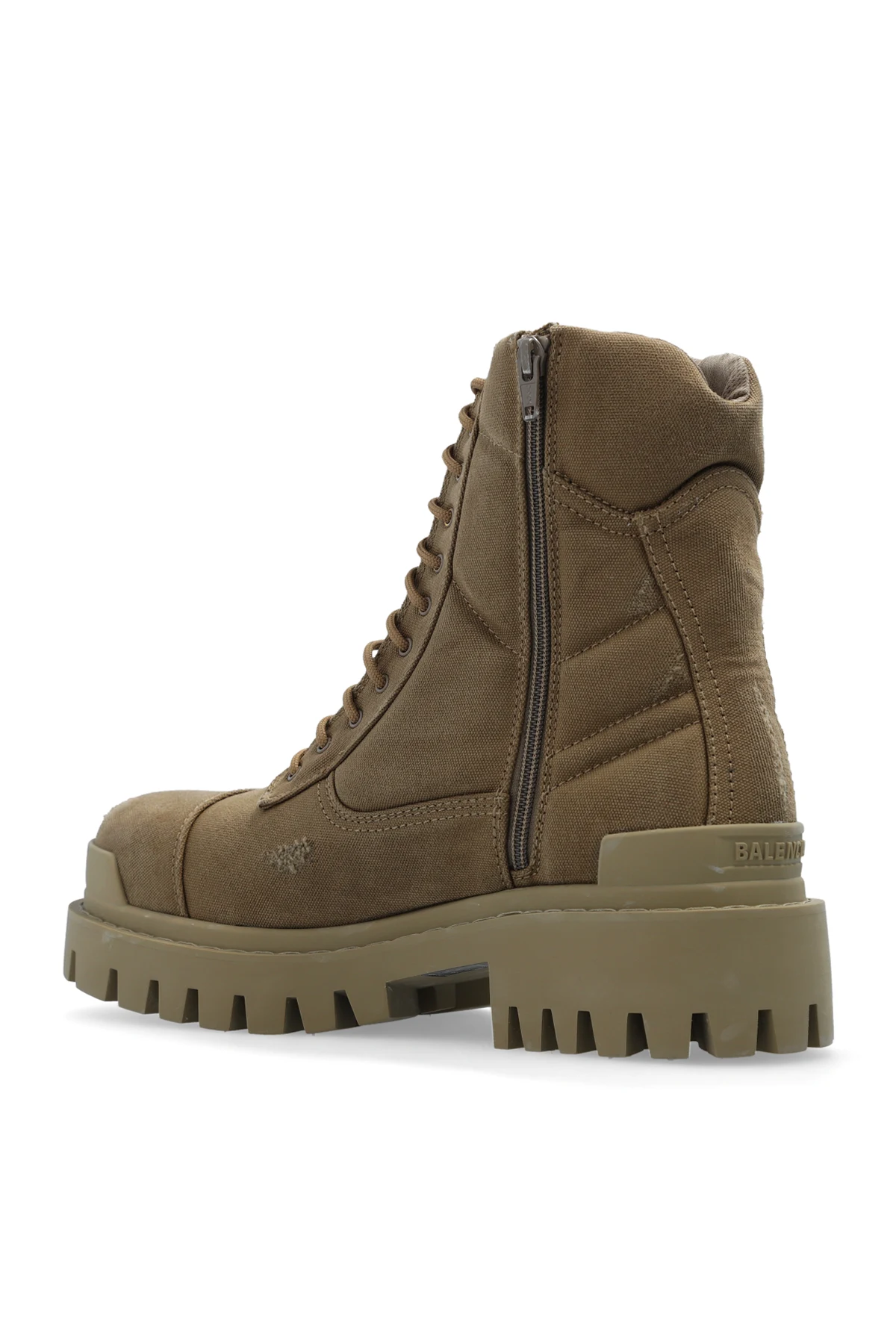 Khaki \'Strike\' combat boots from Balenciaga. Made from cotton canvas, this lace-up model sits on a khaki rubber sole and showcases a side zipper, distressed detailing, round toe and tactile logo detailing on the front and back.