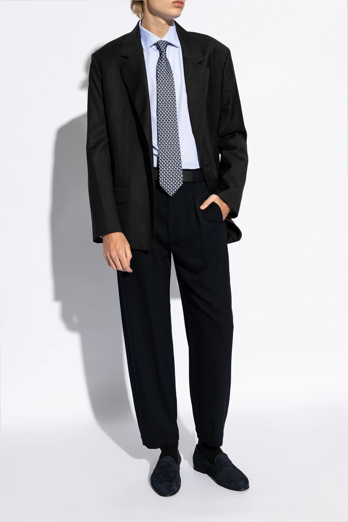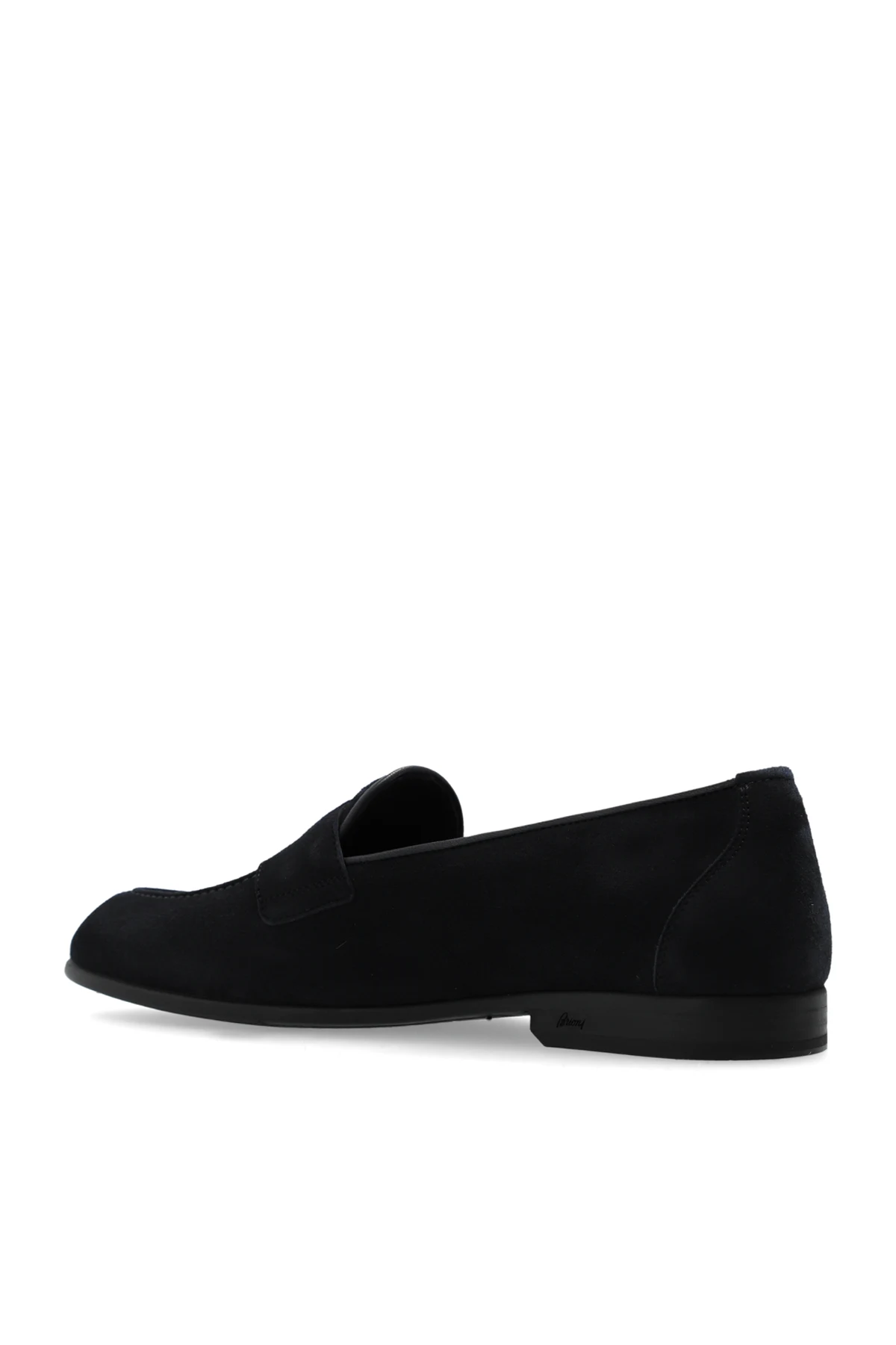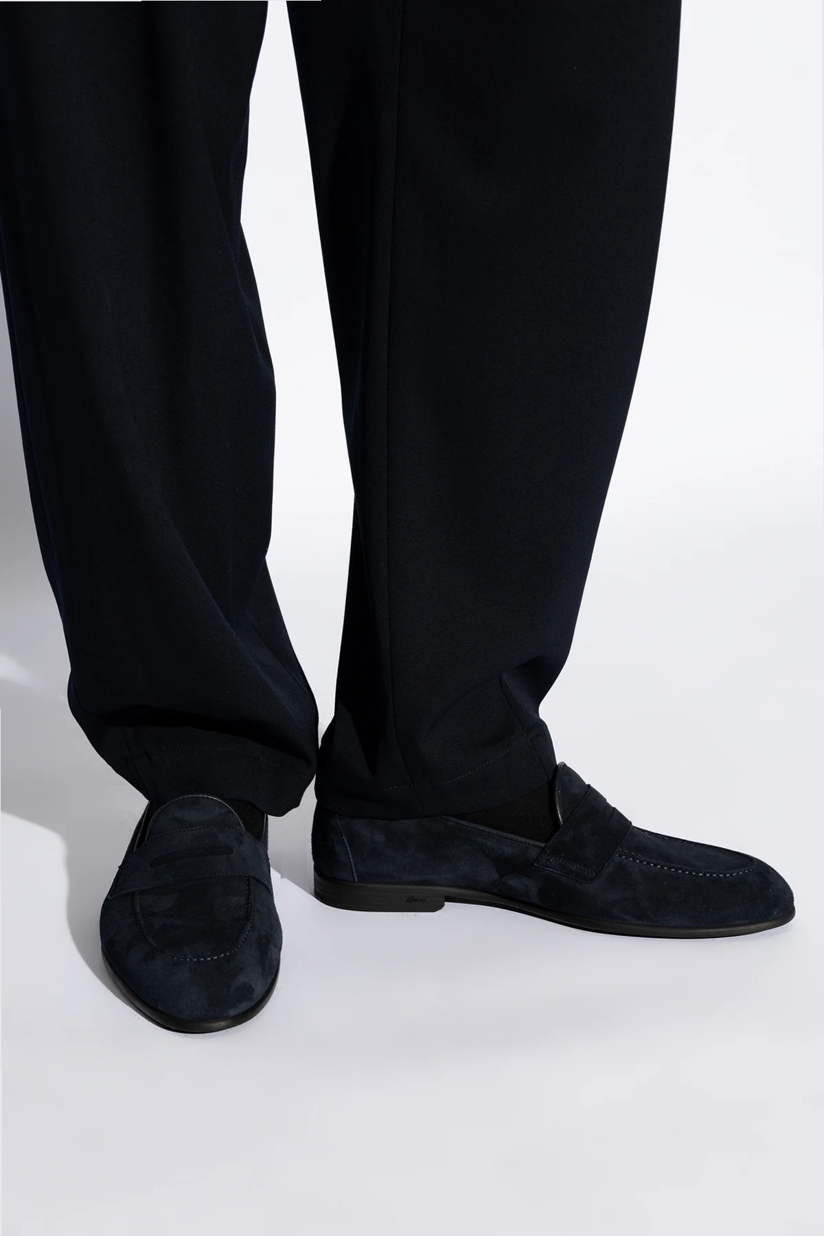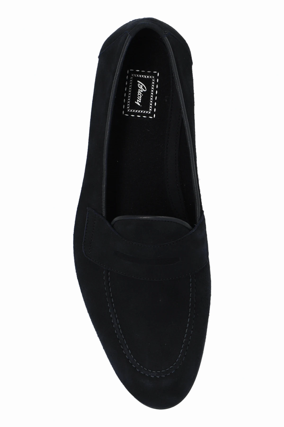 Introducing the exclusive Penny Loafers from the esteemed Brioni collection, crafted for the discerning individual who values both elegance and superior craftsmanship. These loafers are a testament to timeless style and refined luxury. With a classic silhouette, the Penny Loafers feature an elegant, rounded line and slip-on design that epitomizes sophistication. The exterior is meticulously crafted from high-quality suede, offering a subtle yet opulent appearance that is both stylish and versatile. The loafers come in a striking navy blue color, providing a polished and universal appeal, suitable for a variety of ensembles. A characteristic strap adorns the front, embodying the quintessential penny loafer charm. The brand\'s signature label inside the shoe attests to its authenticity and exclusivity. Designed with a low, flat sole in matching navy, these loafers ensure a cohesive and streamlined look. One of the images showcases the loafers paired with elegant trousers and a blazer, demonstrating their suitability for both formal and semi-formal occasions. Why Choose This Product? Exquisite Craftsmanship: Made from 100% premium leather for both the outer and inner layers, with a durable rubber sole. Timeless Design: Classic penny loafer shape with a sophisticated, rounded line. Authentic Luxury: Featuring the renowned Brioni brand mark for guaranteed exclusivity. Versatile Elegance: Perfectly complements both formal and semi-formal attire. Stylish Consistency: The uniform navy blue color ensures a seamless look.