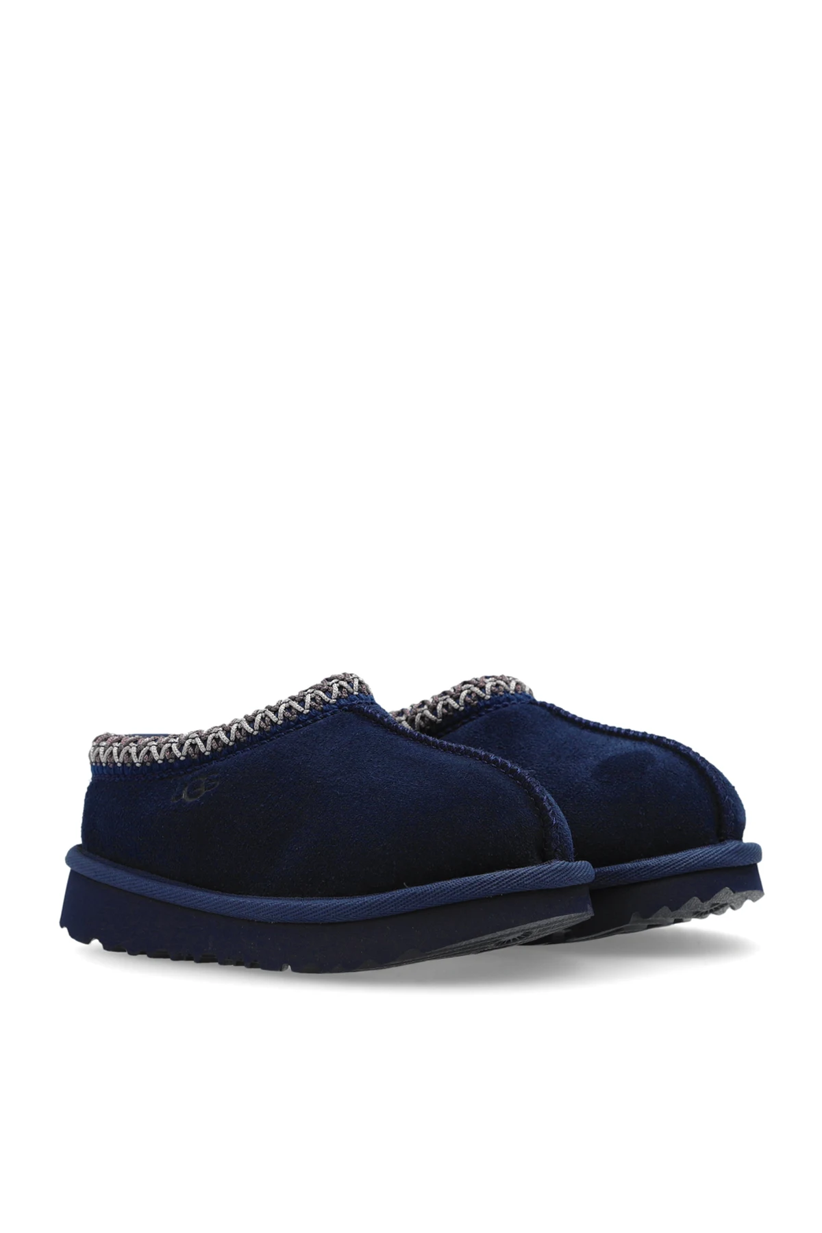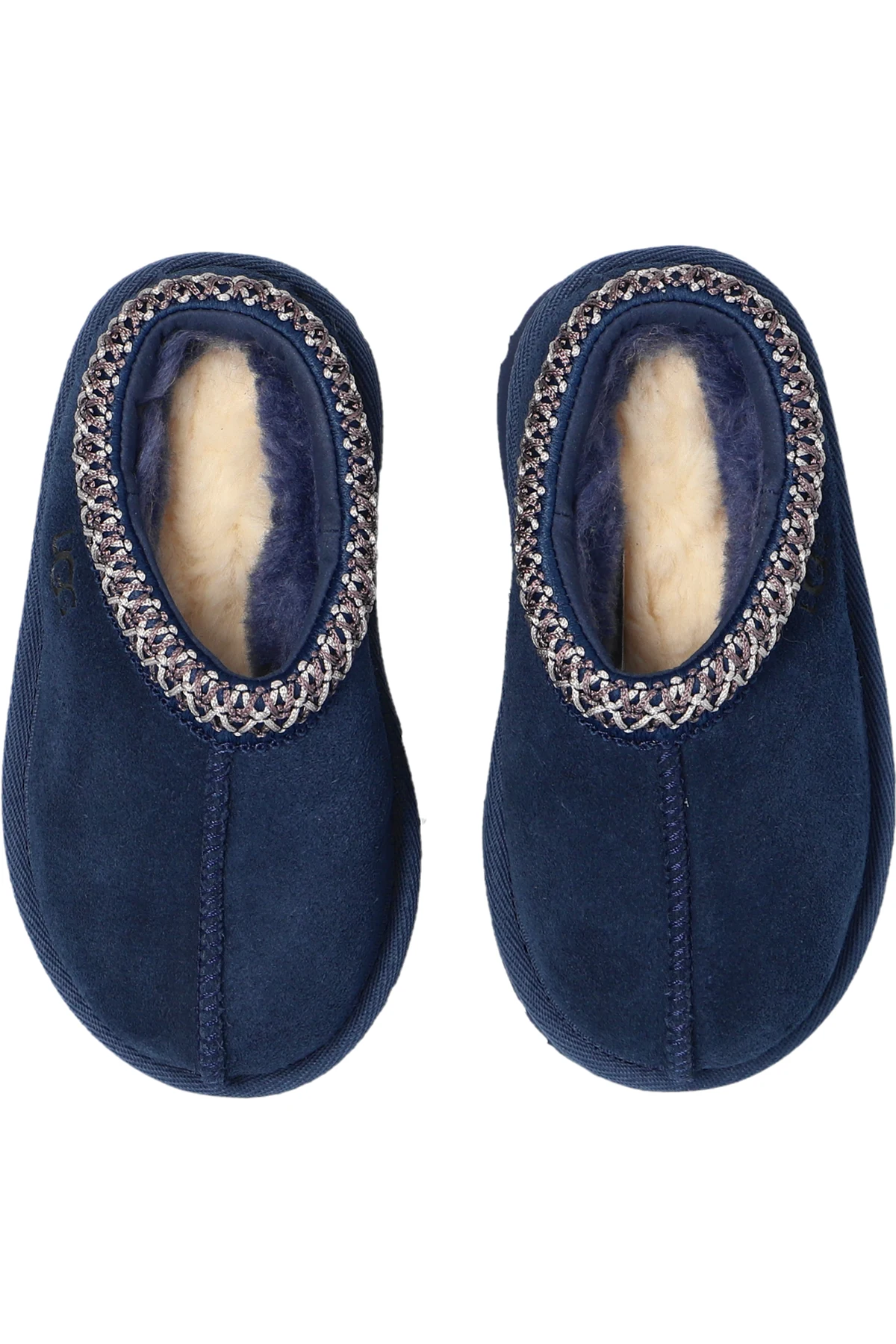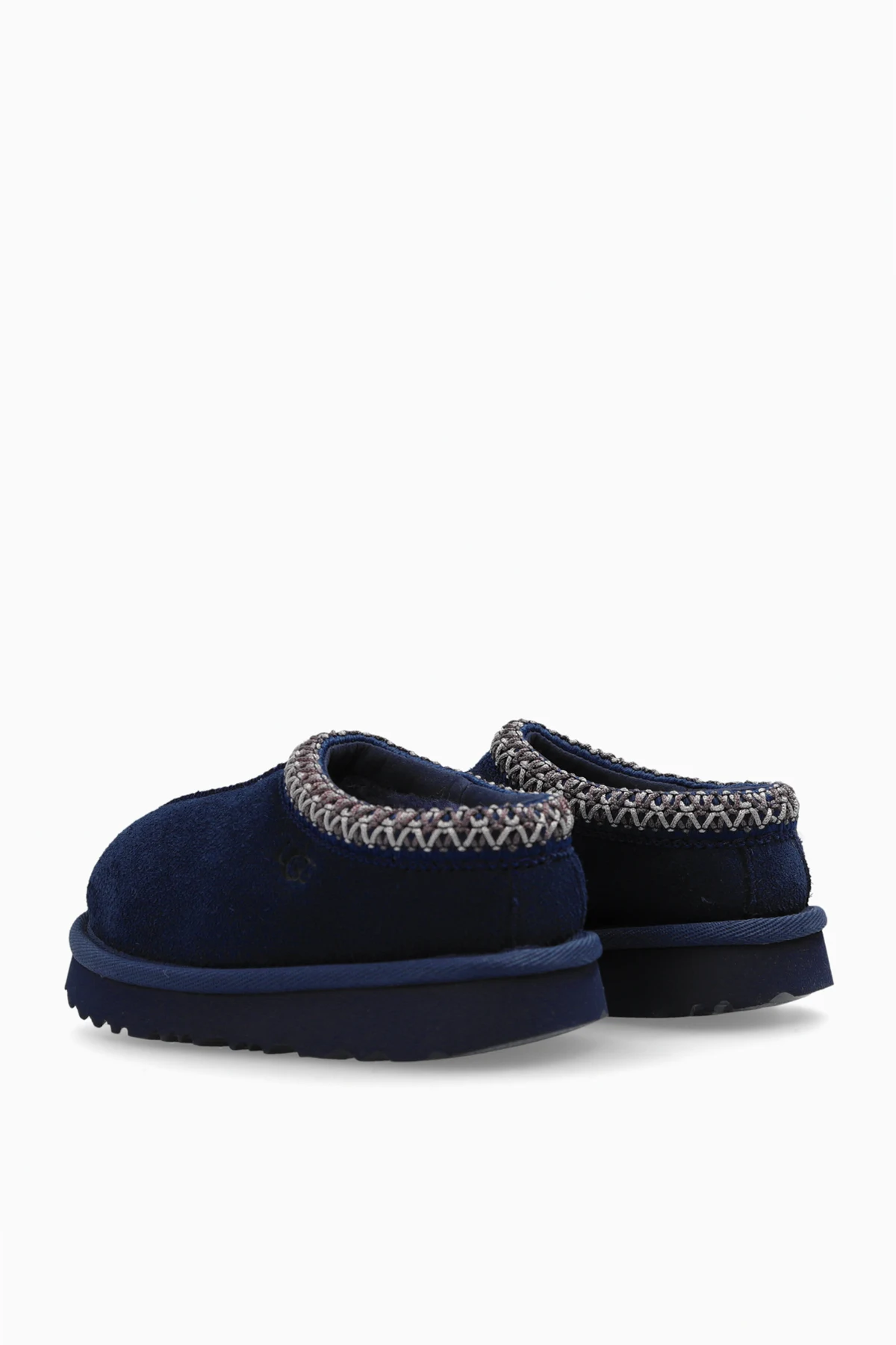 Introducing the exquisite UGG Kids \'T Tasman II\', a masterpiece of children\'s footwear that embodies elegance and comfort. These navy blue slippers are crafted from luxurious suede, offering a refined appearance while the interior is lined with plush fur to ensure warmth and coziness. The slippers feature a simple, rounded shape complemented by an intricate braided trim along the upper edge, adding a touch of sophistication and character. The robust rubber sole guarantees excellent grip and durability, making these slippers perfect for active children. Subtly embossed with the designer\'s logo on the side, these slippers affirm their authenticity and quality. Easy to slip on, they provide unparalleled comfort and warmth, ideal for colder days. Why Choose This Product? Elegant Design: Navy blue suede with a stylish braided trim. Supreme Comfort: Lined with soft fur for warmth and coziness. Durable Construction: Solid rubber sole for excellent grip and longevity. Authentic Branding: Subtle embossed UGG logo confirming genuine quality. Easy to Wear: Perfect for kids, ensuring hassle-free use.