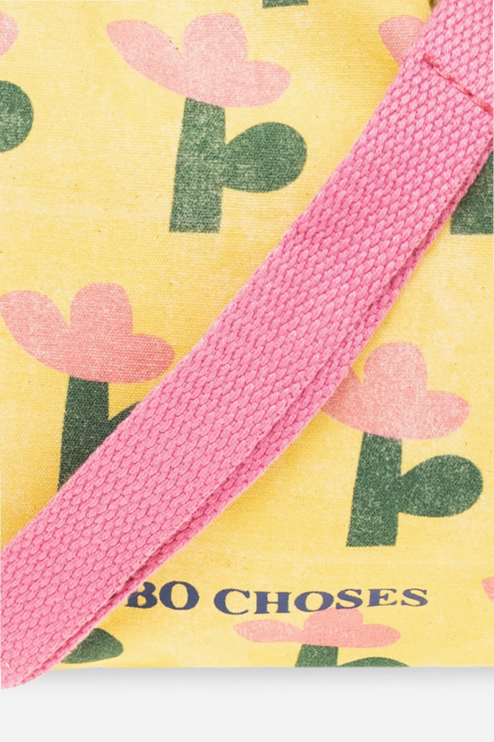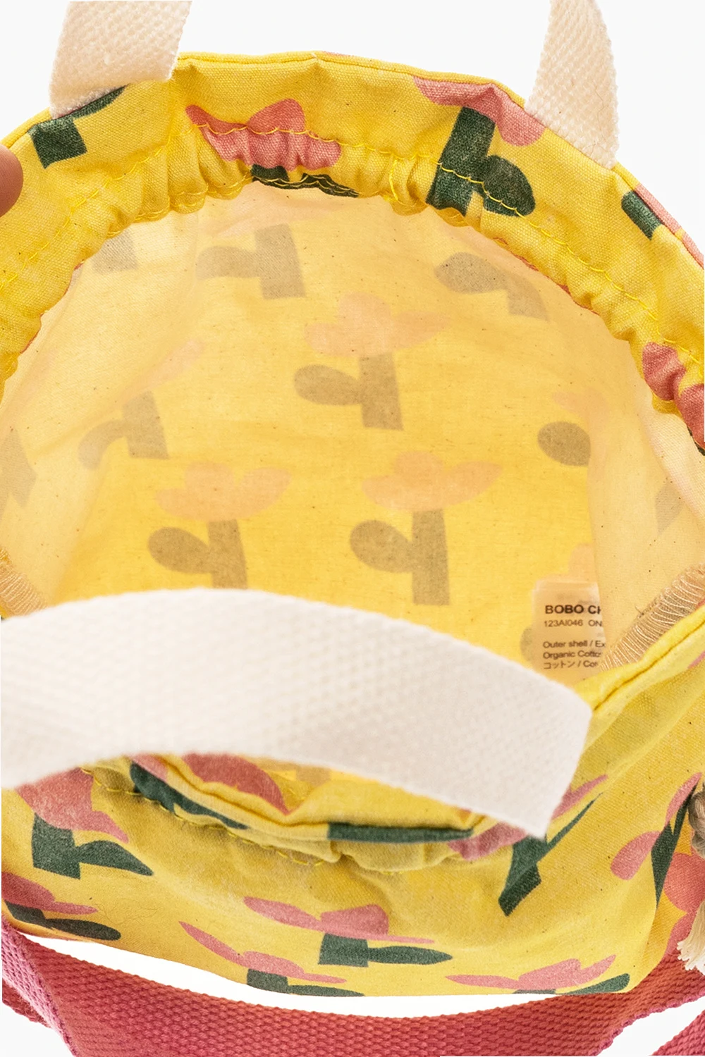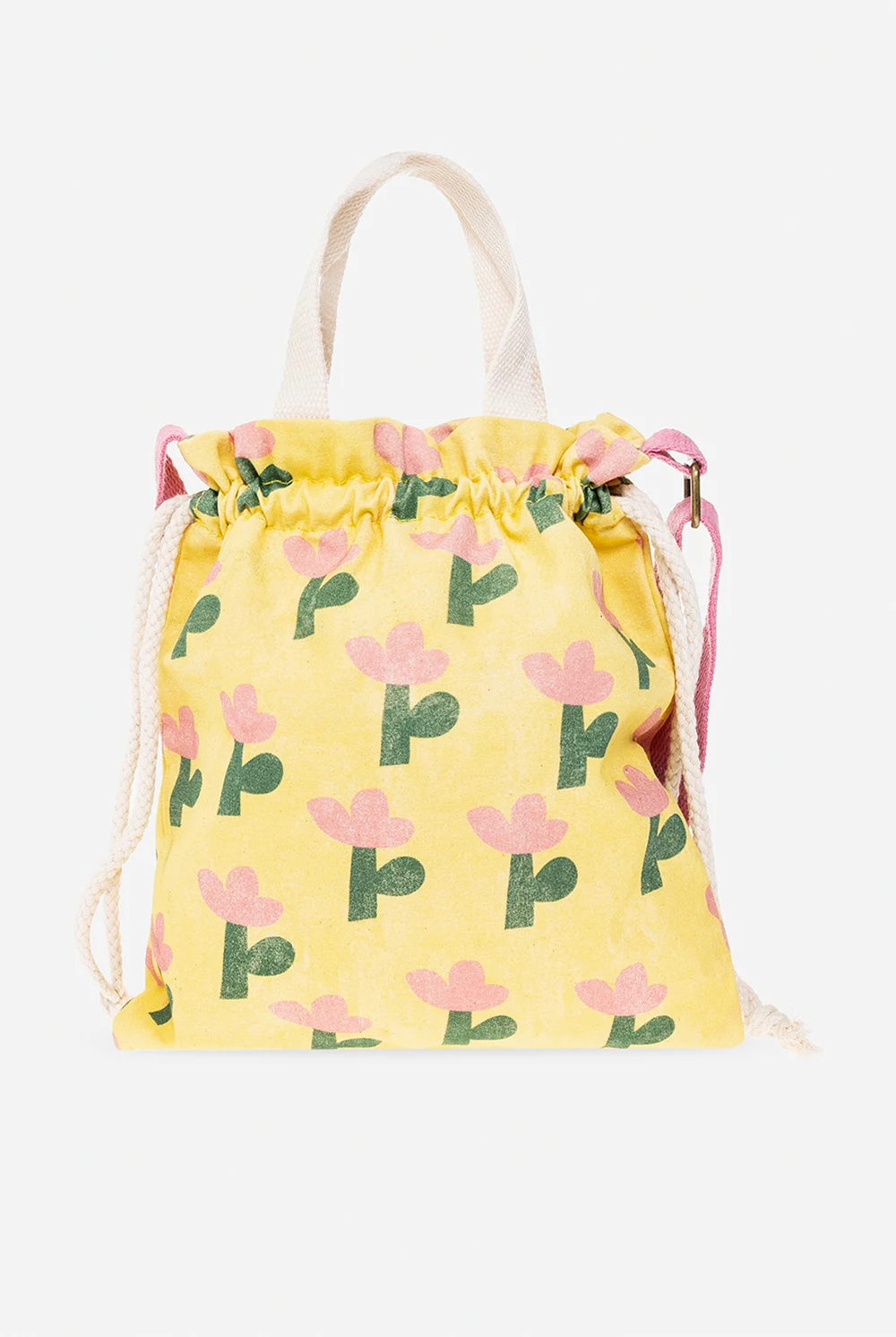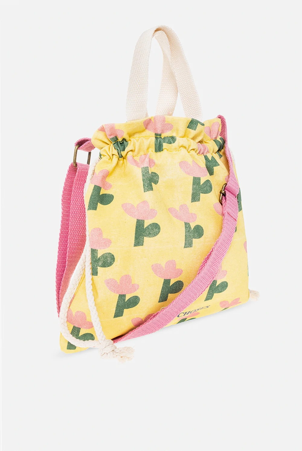 Yellow and pink shoulder bag from Bobo Choses. Crafted from cotton, this item cinches closed with drawstrings on the sides and showcases a pink and green floral print, two half-round handles, an adjustable strap and one internal compartment.