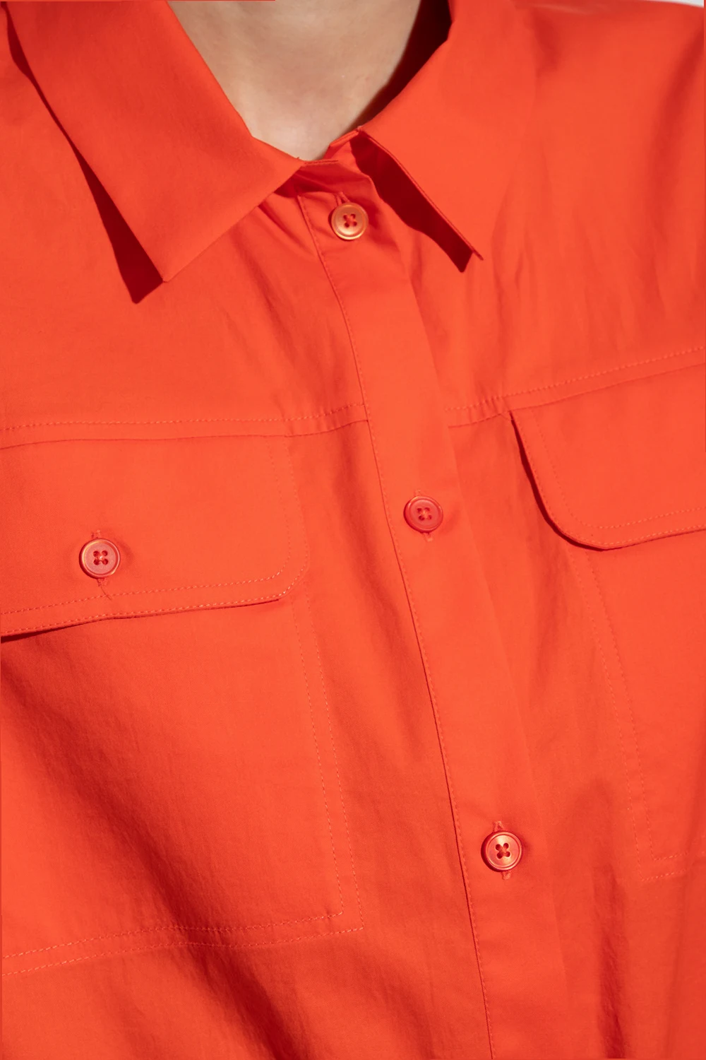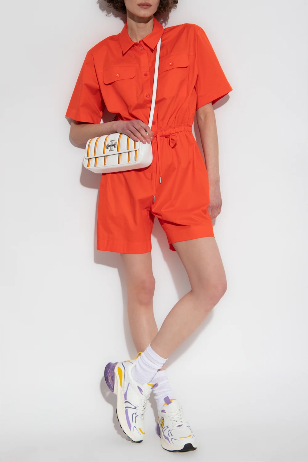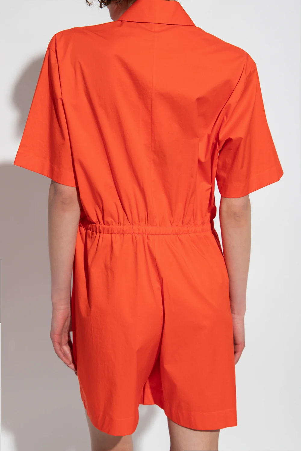 Orange jumpsuit from PS Paul Smith. Made of cotton, this design features button fastenings, two buttoned flap pockets, drawstring waist, collar as well as short sleeves and legs.