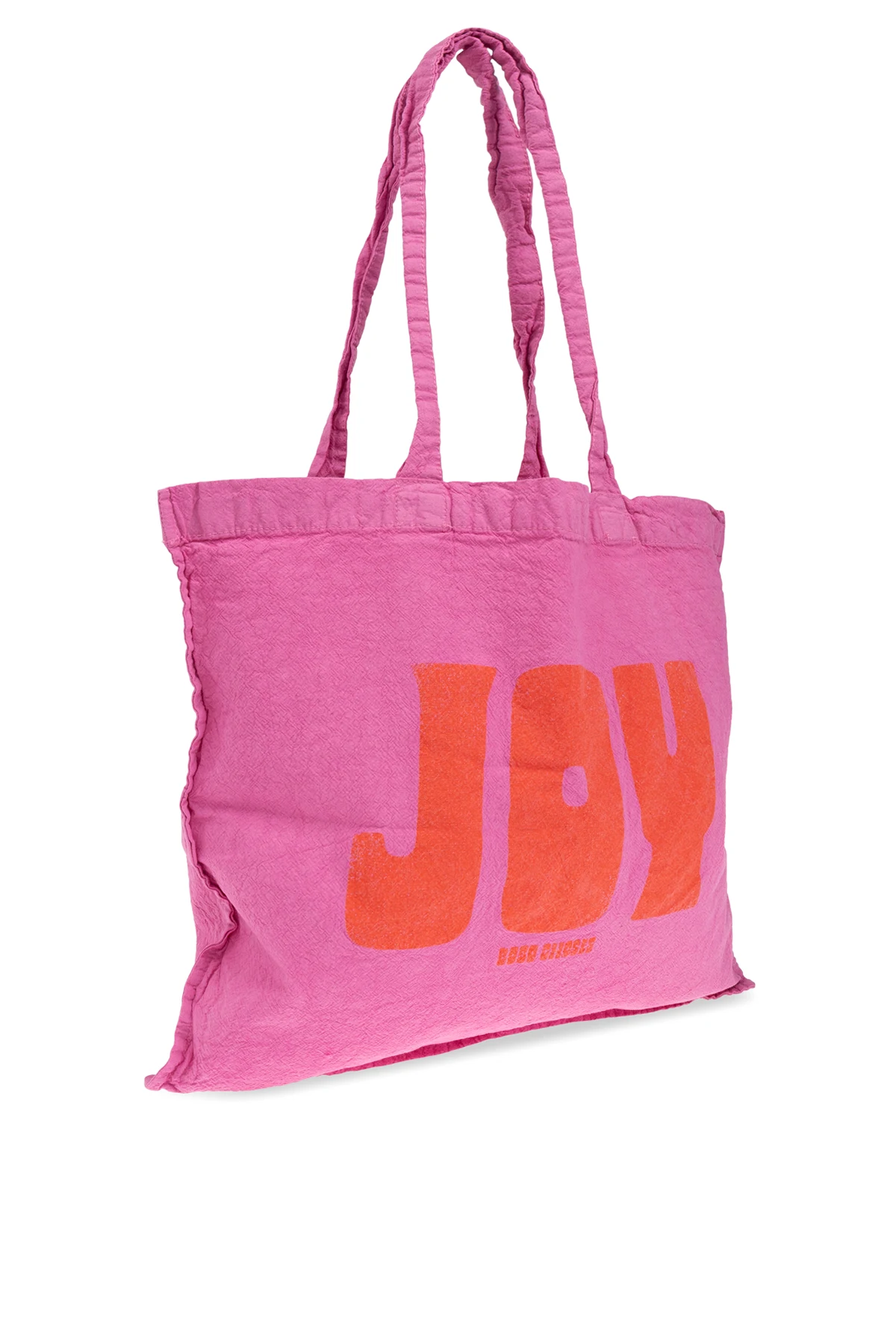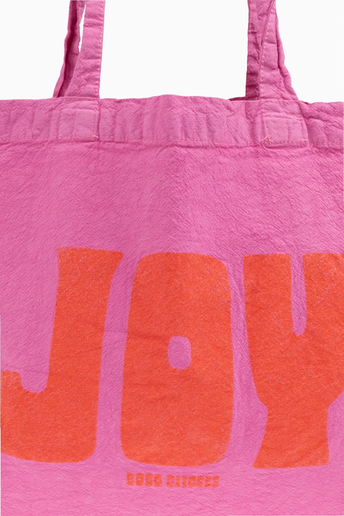 Introducing the Pink Shoulder Bag from the exclusive fashion collection of Bobo Choses, a brand renowned for its imaginative and environmentally-conscious creations. This exquisite bag, designed for the young and spirited, is crafted from soft cotton, offering both comfort and style. The bag\'s vibrant pink hue is beautifully complemented by a bold orange \"JOY\" emblazoned across the front, a testament to the brand\'s playful aesthetic. Below this joyful declaration lies the subtle touch of the designer\'s logo, \"BOBO CHOSES\". Its rectangular shape and long, soft handles provide practical elegance, making it a delightful addition to any child\'s accessory collection. Inside, the bag boasts a spacious interior, perfect for carrying a child\'s cherished belongings, with no compartments to limit its use. Why Choose This Product? Crafted from soft, durable cotton Playful design with bold \"JOY\" statement Spacious interior for versatile use Designed by the esteemed Bobo Choses