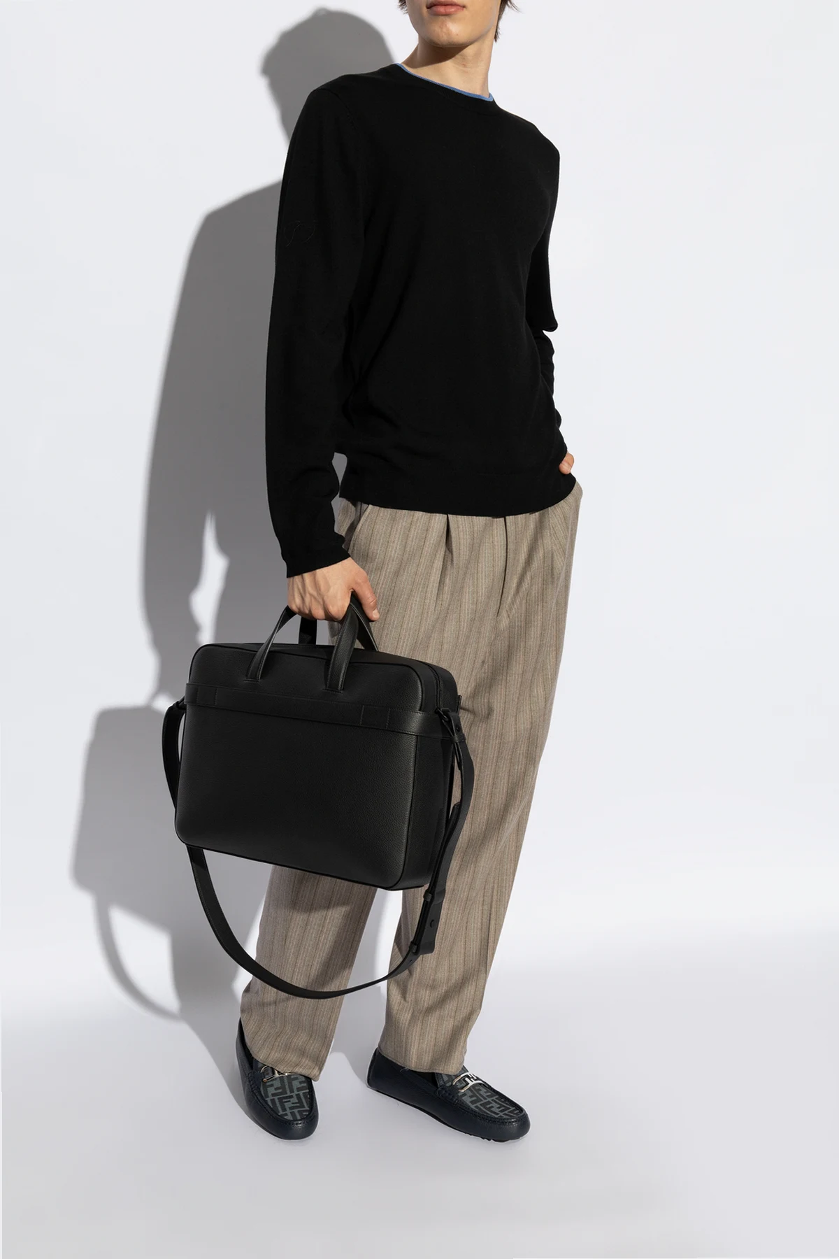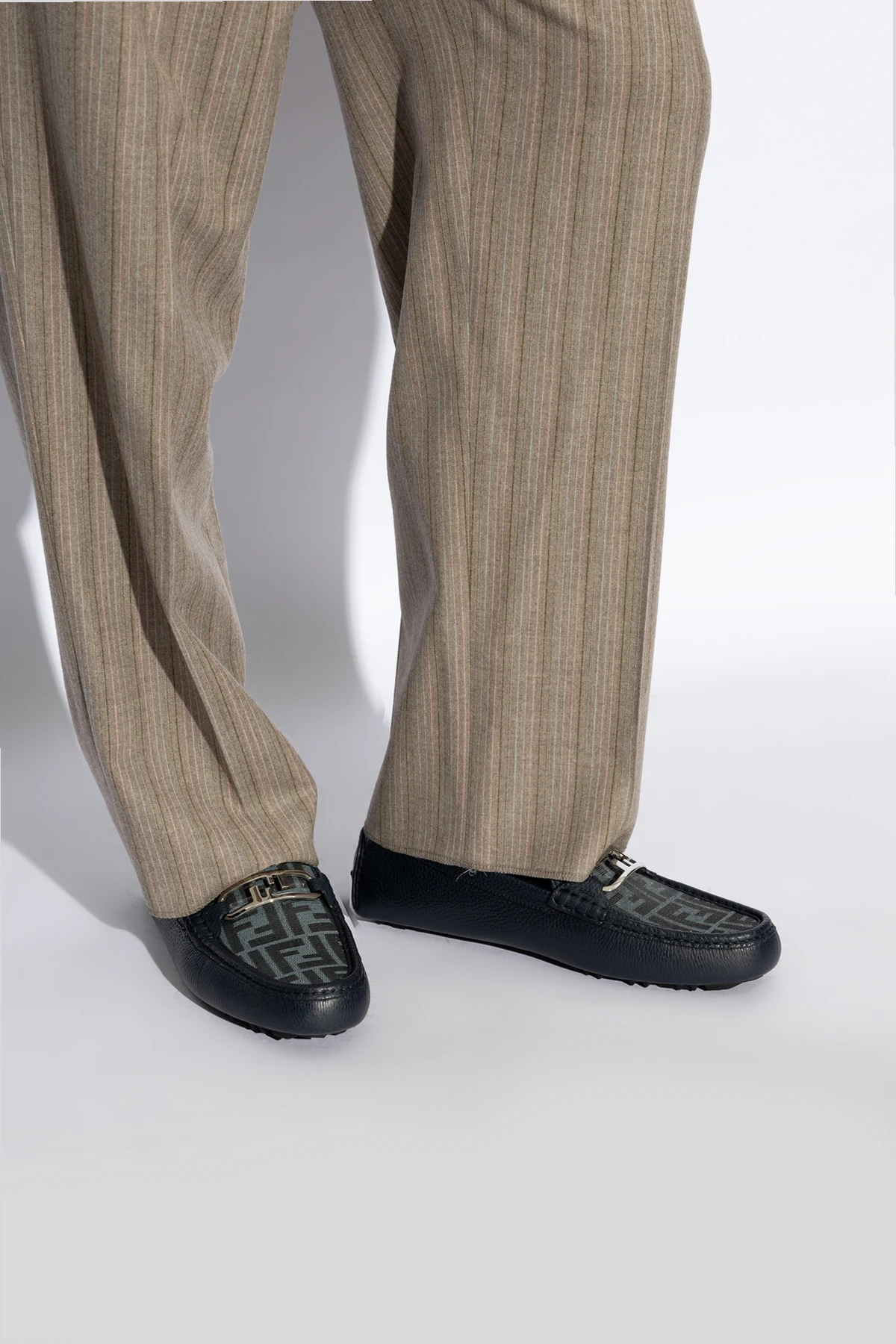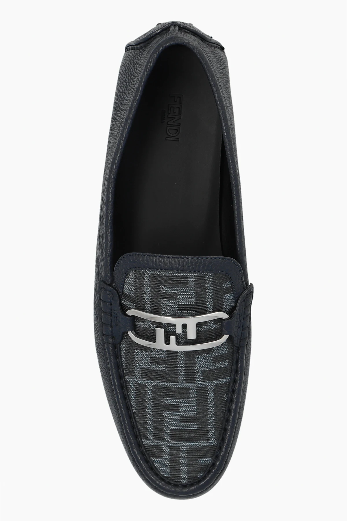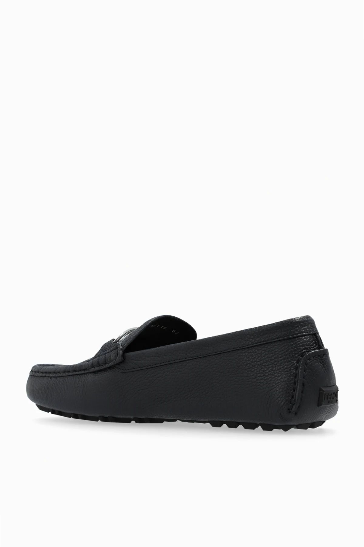 Introducing the ‘Olock’ Leather Moccasins by Fendi, a quintessence of luxurious footwear. Crafted with precision, these navy-blue moccasins exude a natural sheen and a textured finish that only high-quality leather can provide. The classic, elegant silhouette is accentuated by a low, flat heel, cleverly hidden to elevate the shoe\'s high-heel category grace. A distinguishing feature of these moccasins is the metal buckle atop, which not only adds a touch of elegance but also serves as a hallmark of the brand\'s exquisite craftsmanship. The thick, rubber sole ensures durability and flexibility, promising unparalleled comfort with every step. The interior, lined with material bearing the designer\'s logo, speaks volumes of the meticulous attention to detail and the prestige associated with Fendi\'s creations. Why Purchase This Product? Exclusive Design: The metal buckle serves as a stylish, recognizable emblem of the Fendi brand. Premium Materials: Crafted from superior leather with a rubber sole for lasting wear. Comfort & Durability: The thick, flexible sole coupled with a luxurious interior ensures comfort without compromising on durability. Elegant Silhouette: The timeless design of the moccasins offers versatility and elegance, suitable for any occasion.
