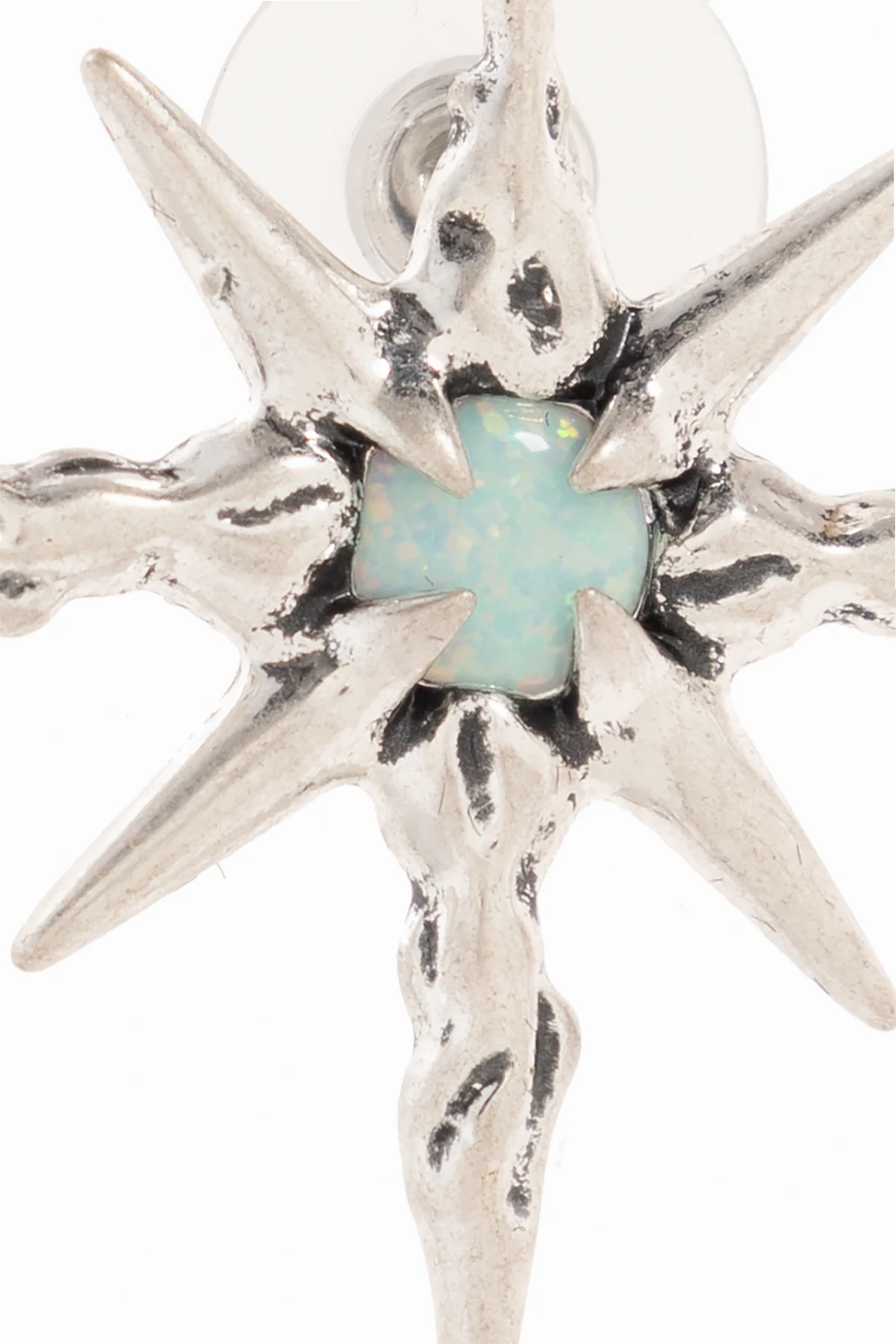 Silver-tone star-shaped earrings from MISBHV. Made of brass, they secure via snaps and showcase opal appliqués.