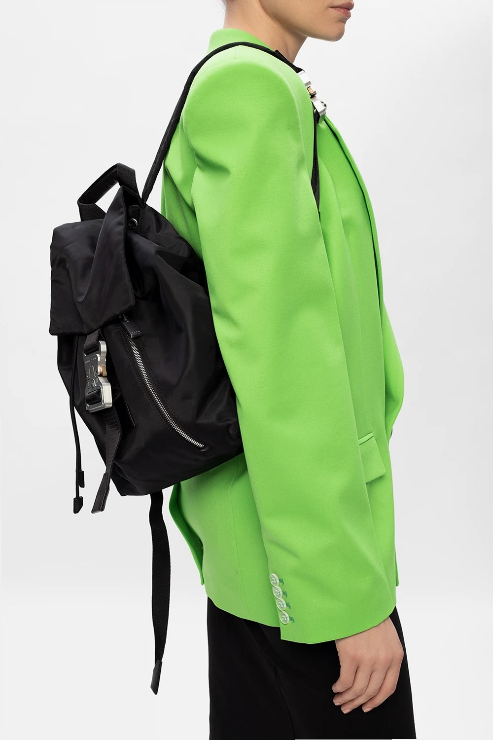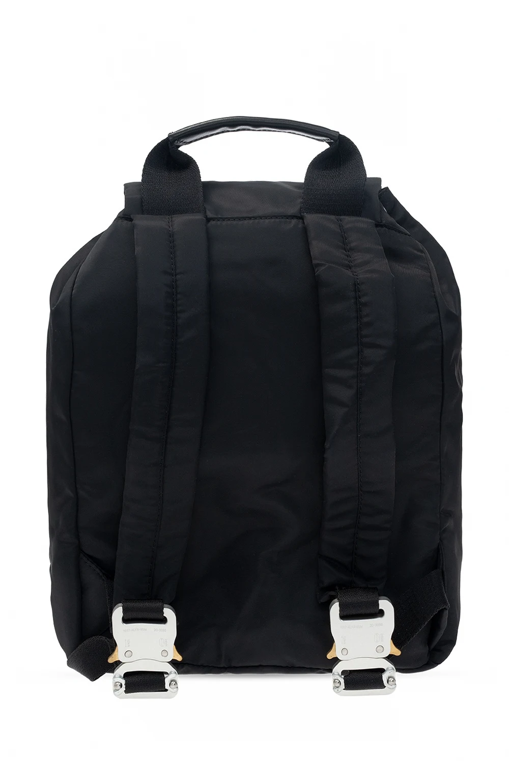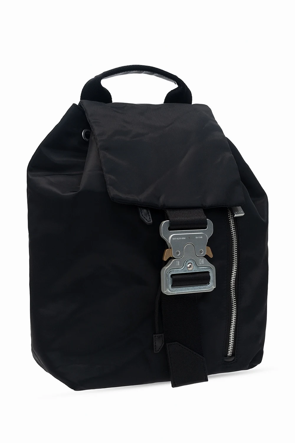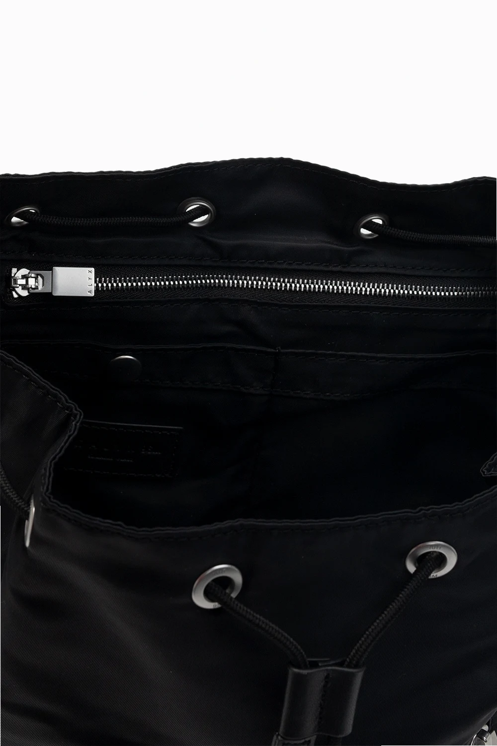 Black backpack from 1017 ALYX 9SM. Fastened with drawstrings, this design features a metal closure in silver-tone and gold-tone, front zip pocket, half-round handle, adjustable shoulder straps, detachable strap and one internal compartment with one zip pocket, one snap pocket and one slip pocket.