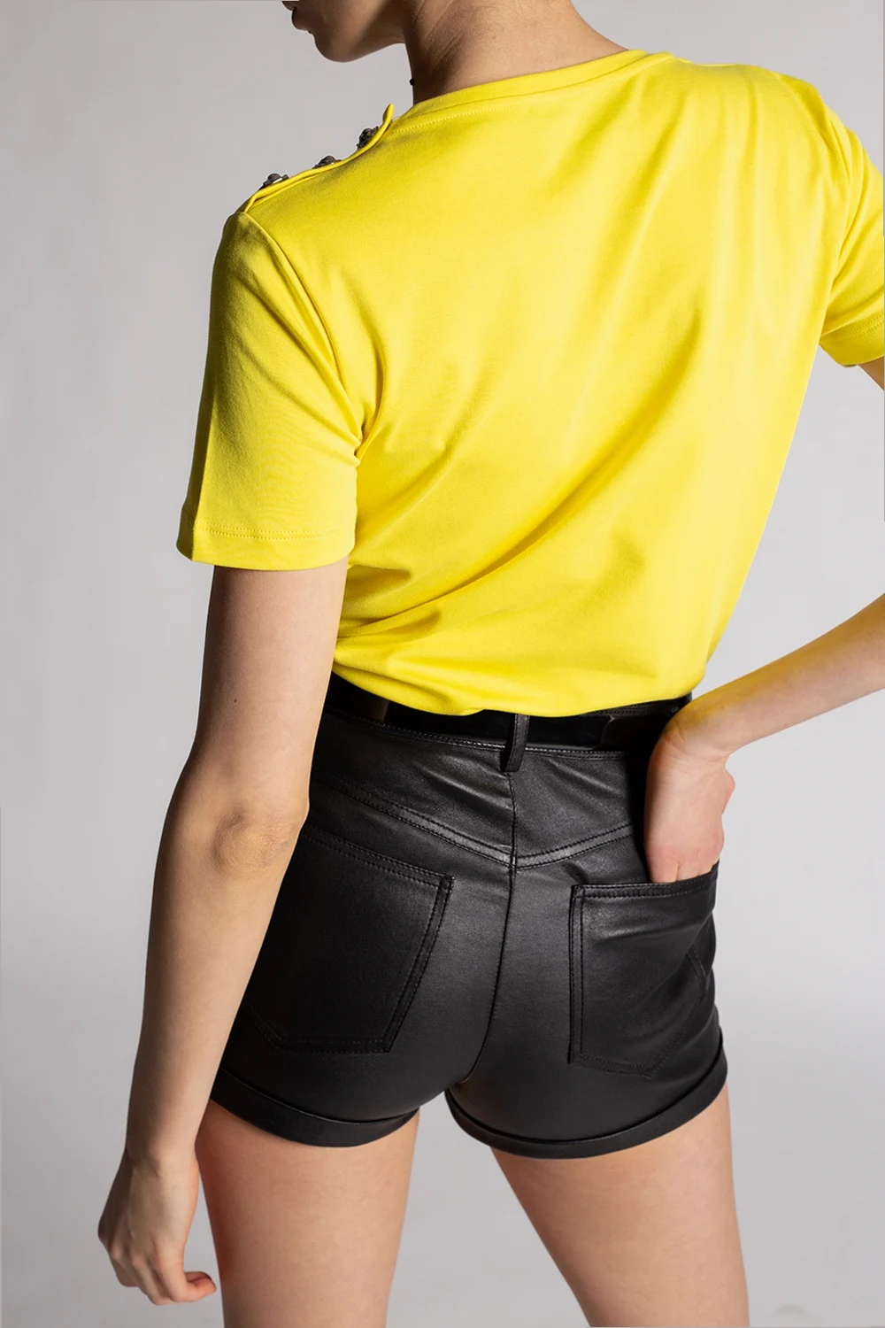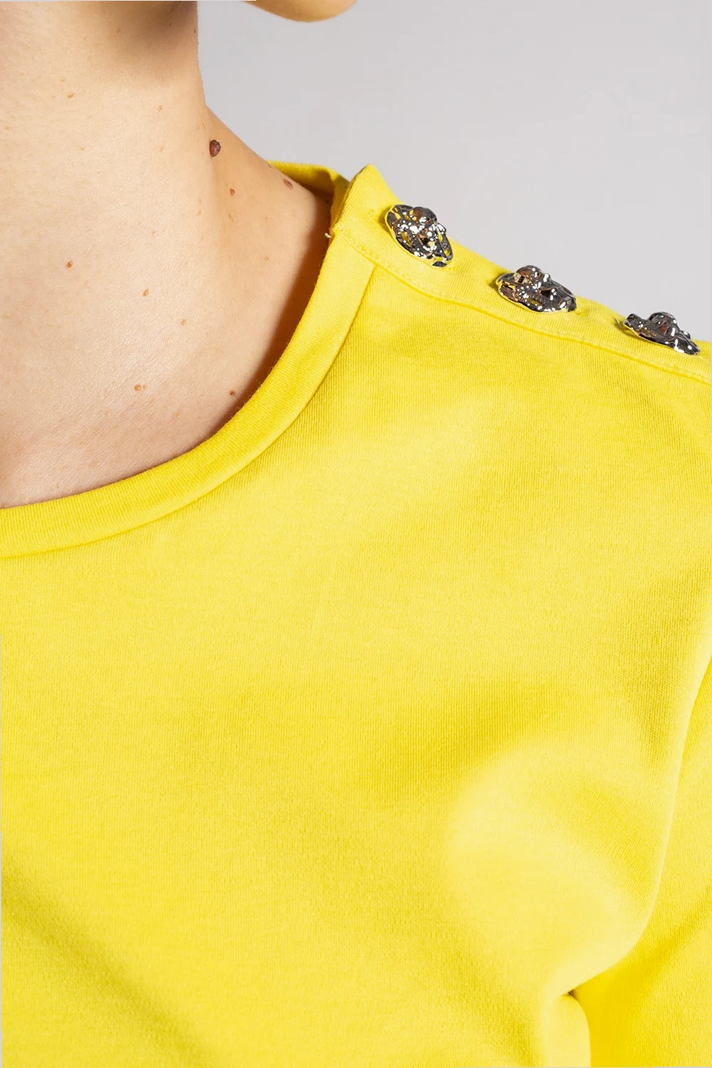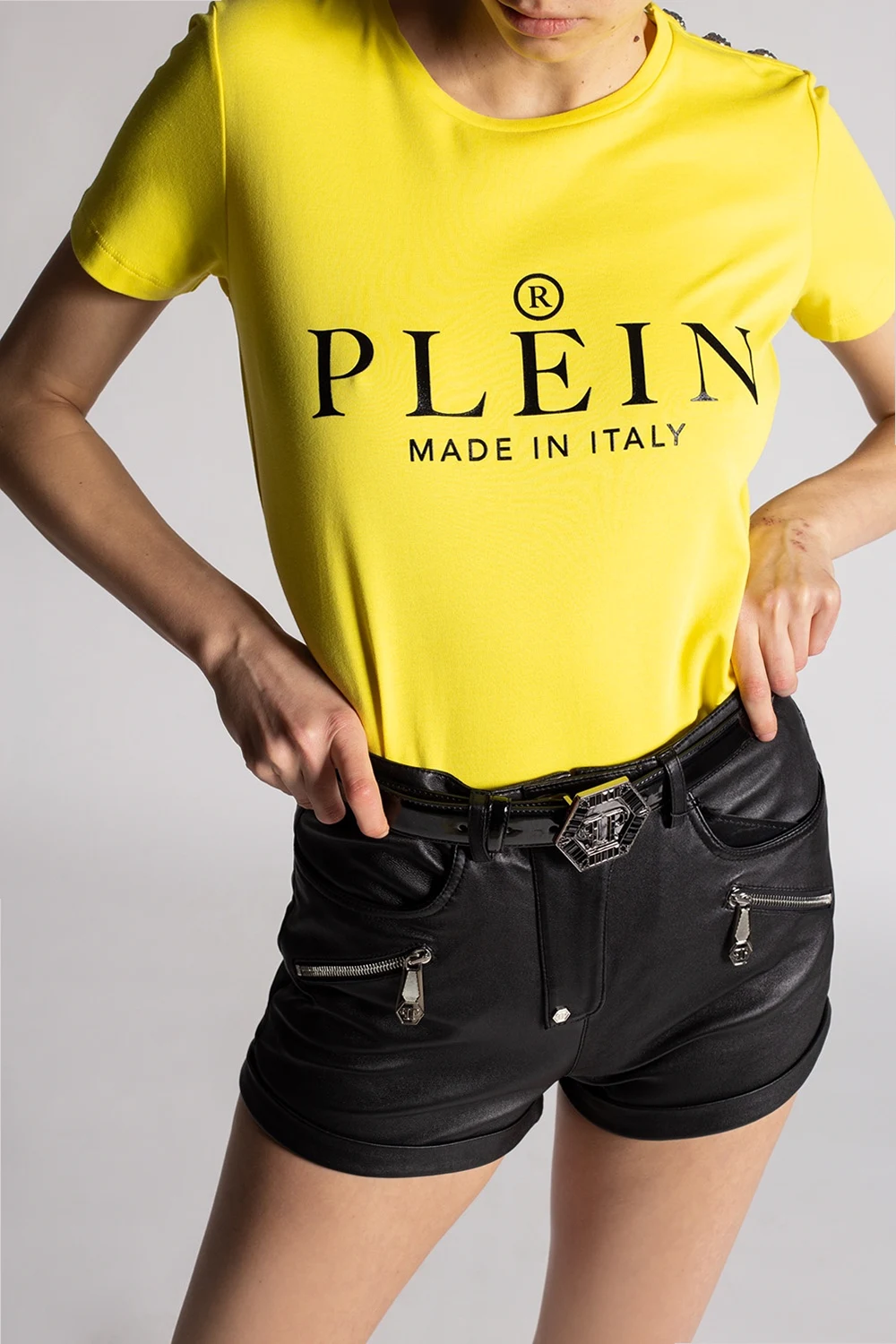 Yellow crewneck T-shirt from Philipp Plein. Crafted from cotton, this item features a black graphic print with the brand\'s logo and decorative silver-tone buttons on the sleeve.