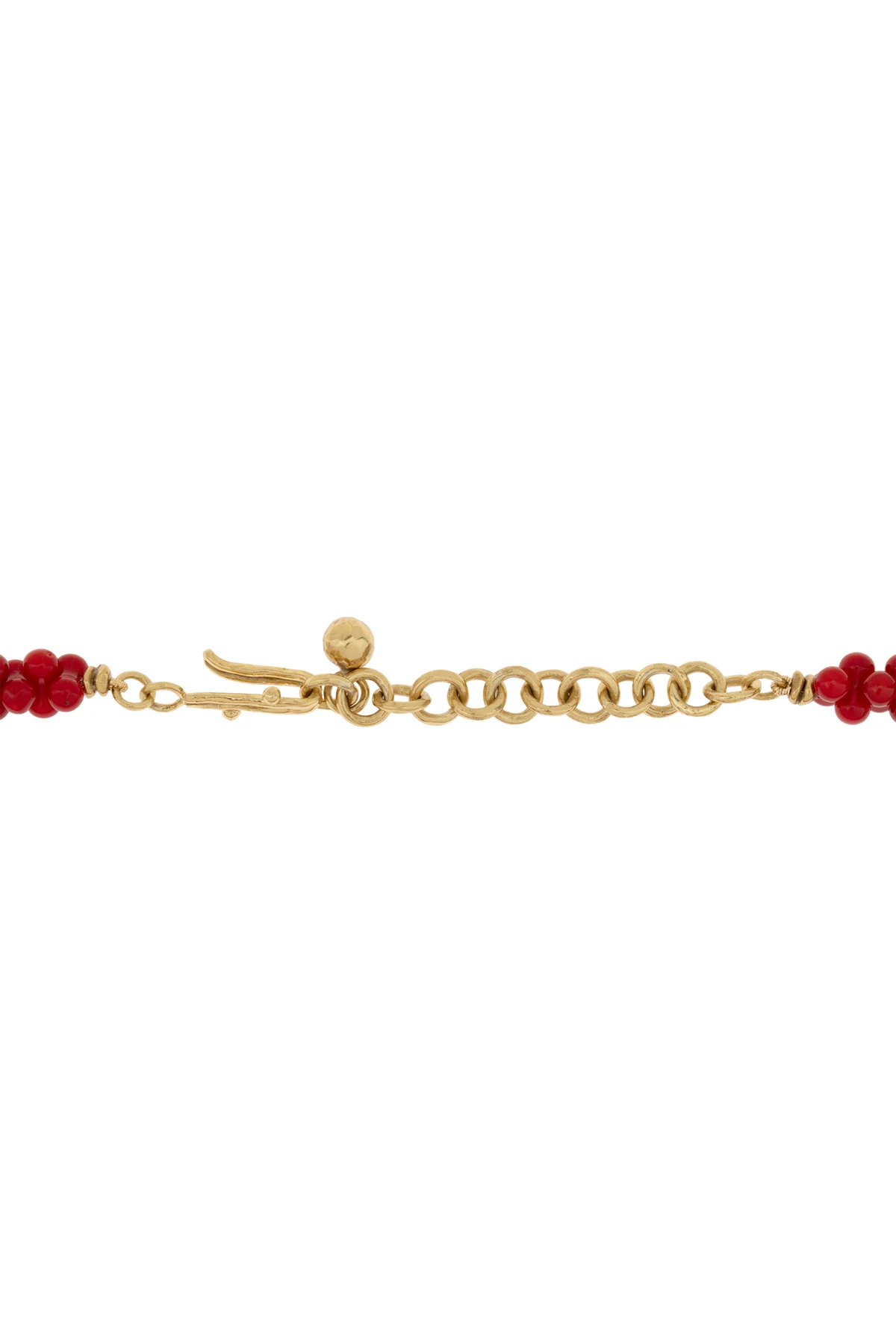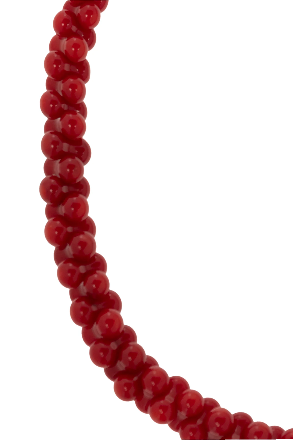 Introducing the \"Coral Necklace ‘Bubble’\" by the distinguished designer Ulla Johnson, a piece of jewelry that redefines elegance and sophistication. Crafted with meticulous attention to detail, this necklace features an array of shining, red beads, uniformly sized and shaped, creating a cohesive and harmonious aesthetic that gracefully adorns the neck. The necklace is ingeniously designed with a gold-toned metal clasp, complemented by a decorative chain that allows for adjustable length, ensuring a perfect fit for any wearer. An ornamental gold plate near the clasp, potentially bearing the designer\'s logo, adds a touch of exclusivity and charm to this exquisite piece. While the precise material of the beads is not specified, their luster suggests the use of high-quality synthetic or glass, making the dominant red color pop with vibrancy and allure. Displayed on a model, the \"Coral Necklace ‘Bubble’\" effortlessly highlights the neckline, serving as a statement piece that can transform any outfit. With its ability to comfortably encircle the neck and stand out regardless of clothing style, this necklace is not just an accessory but a centerpiece that brings together any ensemble with grace and flair. Why Purchase This Product? Exquisite Craftsmanship: Precision-made with high-quality materials, ensuring durability and a luxurious feel. Versatile Elegance: The adjustable length feature makes it suitable for various styles and occasions, from casual to formal. Striking Color Palette: The vibrant red beads, set against gold-toned metal, create an eye-catching contrast that is sure to turn heads. Designer Prestige: Designed by Ulla Johnson, a name synonymous with high-end fashion and unparalleled quality.