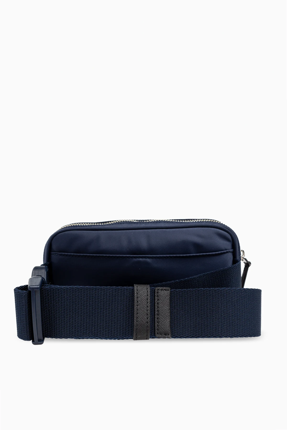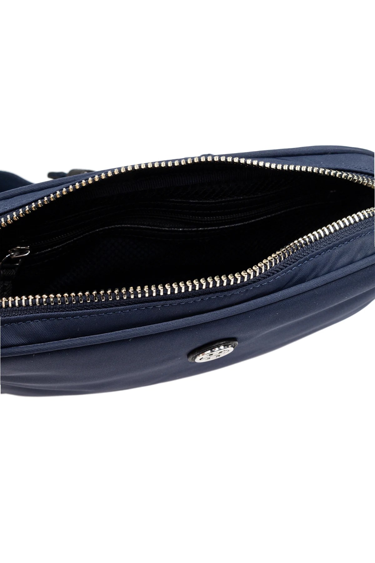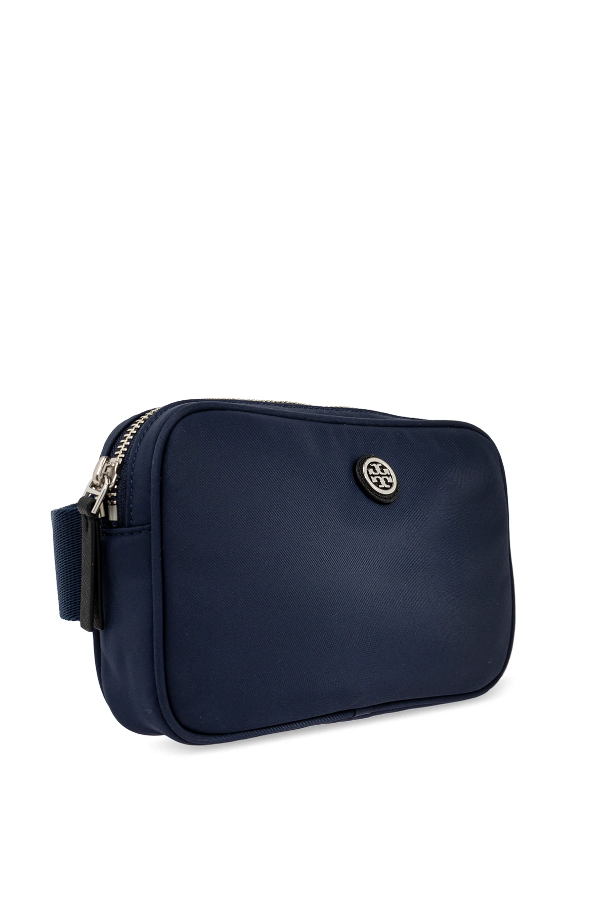 Introducing the Virginia Waist Bag by Tory Burch, a masterpiece of refined elegance and functionality. This navy-hued accessory, with its sleek, rectangular design and softly rounded corners, encapsulates sophistication. Crafted from what appears to be exquisite, smooth leather, the bag exudes luxury. The bag\'s front panel proudly displays a round, metallic logo, adding a touch of designer allure. A zip closure with a metallic slider secures the main compartment, ensuring your essentials are safely stowed. The Virginia is as versatile as it is stylish, equipped with an adjustable strap crafted from a durable, mesh-like fabric, allowing for comfortable wear around the waist or across the body. Its interior reveals a thoughtful design, with a lining and an additional zippered pocket for organizing your belongings. Photographs showcasing the bag from various angles and in different stylings highlight its shape and the ease with which it integrates into diverse fashion ensembles. Why Purchase the Virginia Waist Bag? Elegant Design: Simple yet sophisticated aesthetic with a subtle designer logo. Premium Material: Crafted from high-quality, smooth (likely leather) material for durability and elegance. Functional: Equipped with a secure zip closure, adjustable strap, and internal pocket for organized storage. Versatile: Can be stylishly worn around the waist or across the body, complementing various outfits.