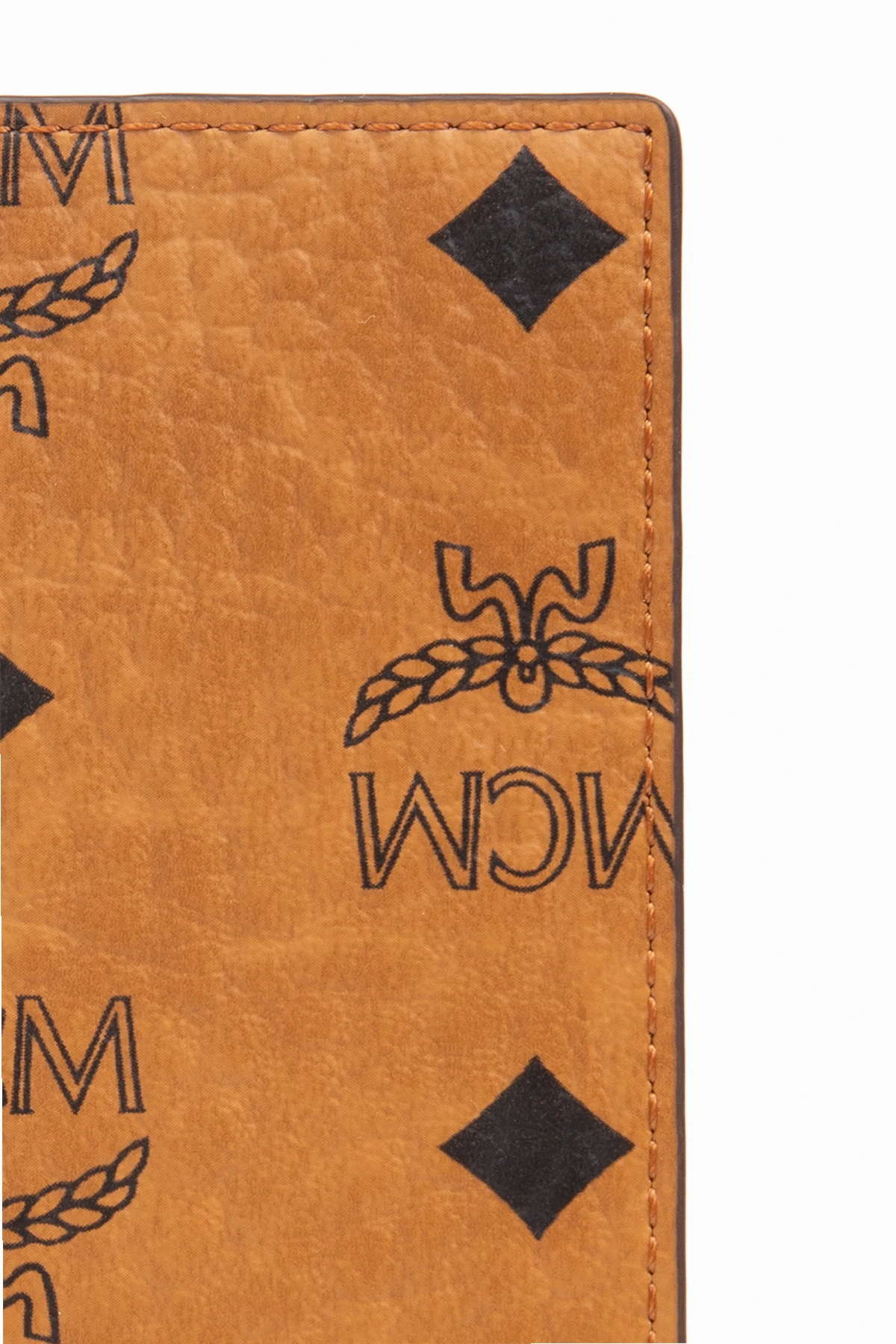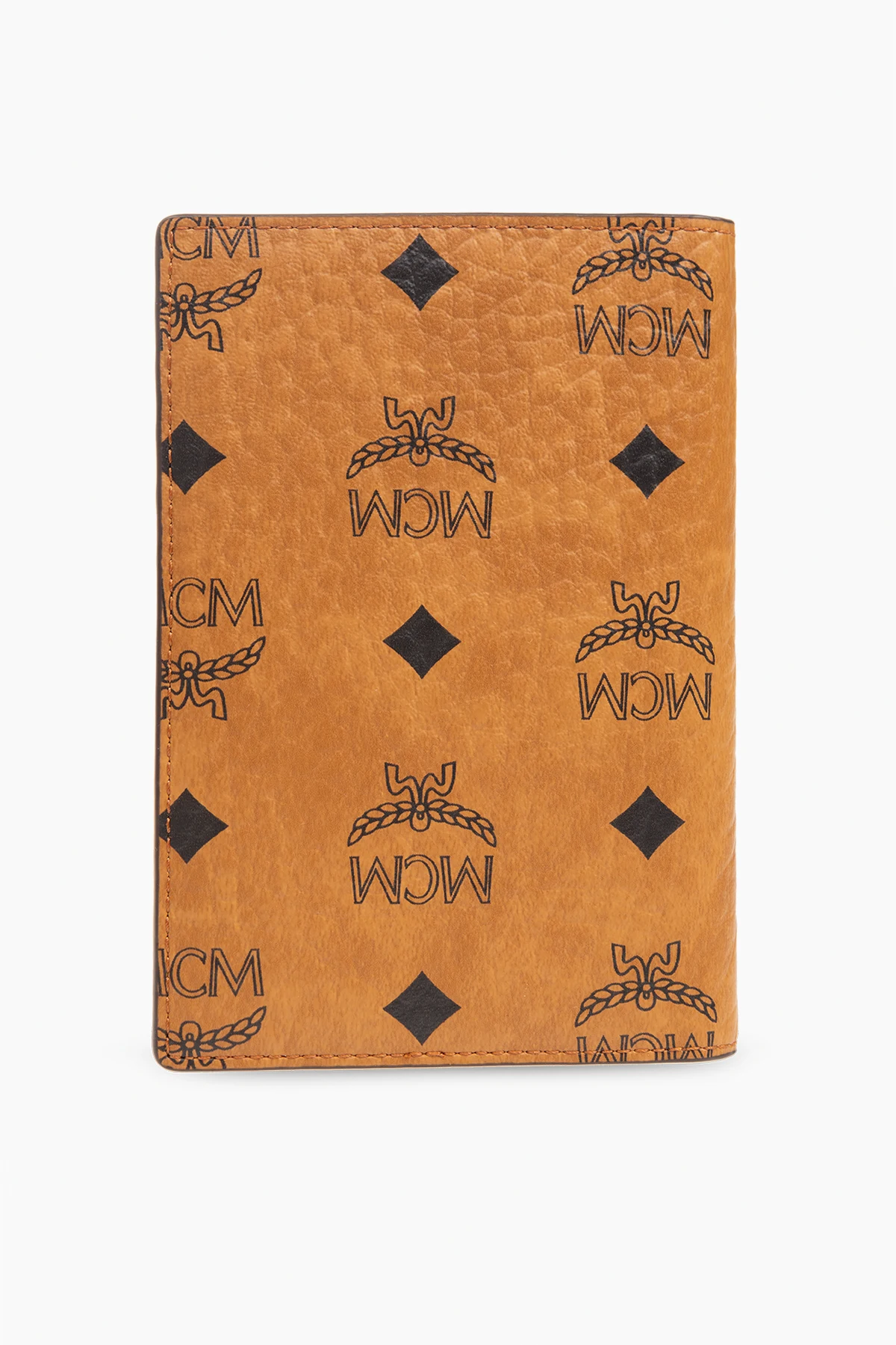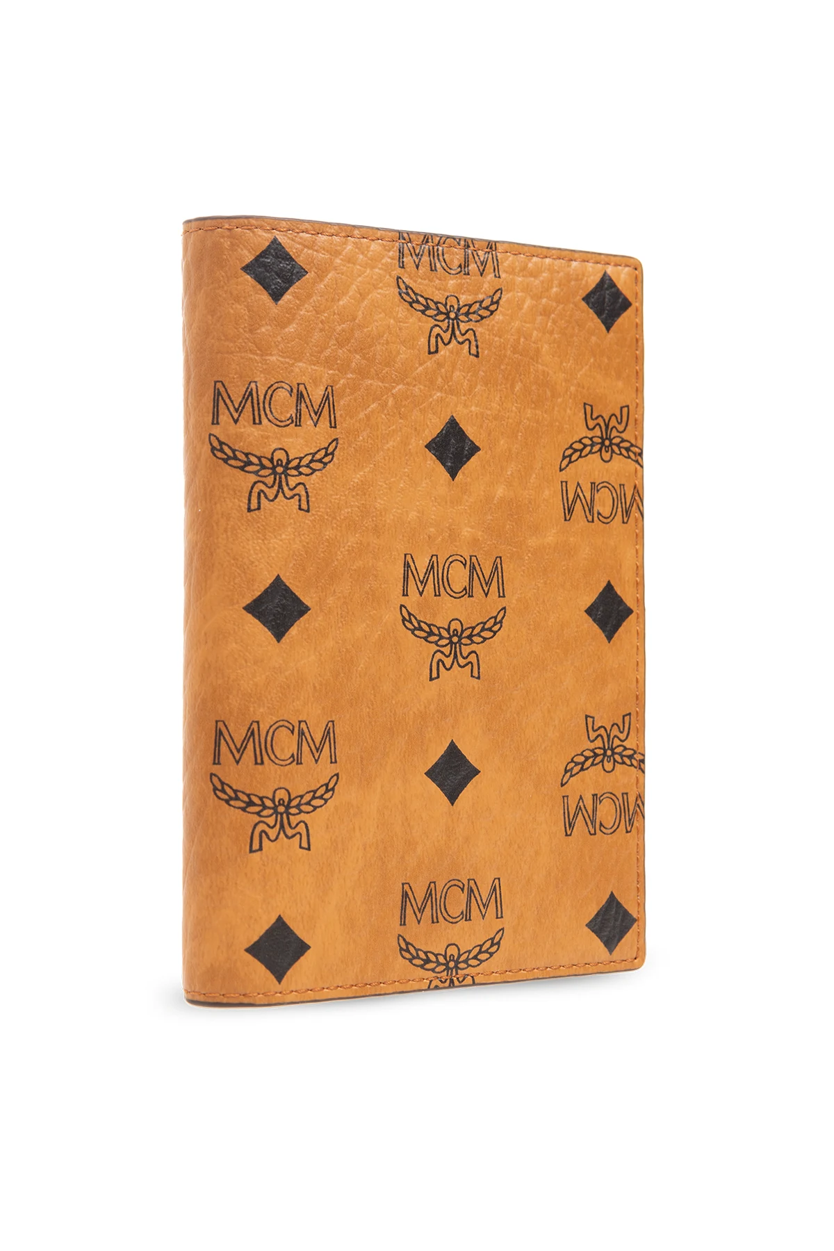 Brown passport holder from MCM. Made of canvas faux leather, this item features a black logo pattern as well as five card slots and one passport compartment inside.