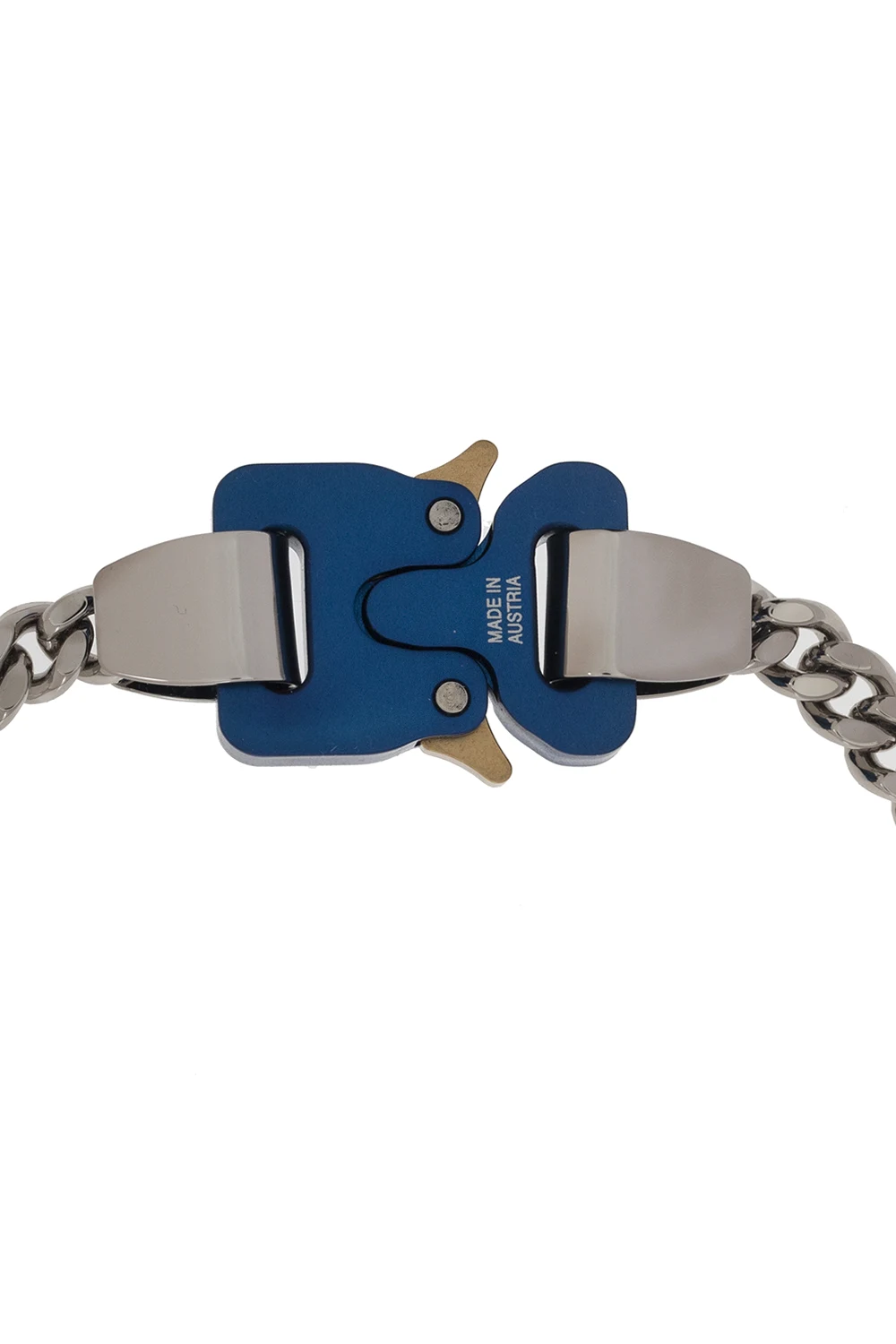 Silver-tone necklace from 1017 ALYX 9SM. Made of brass, this item secures with a blue and gold-tone anodised aluminium buckle with a laser-cut logo.