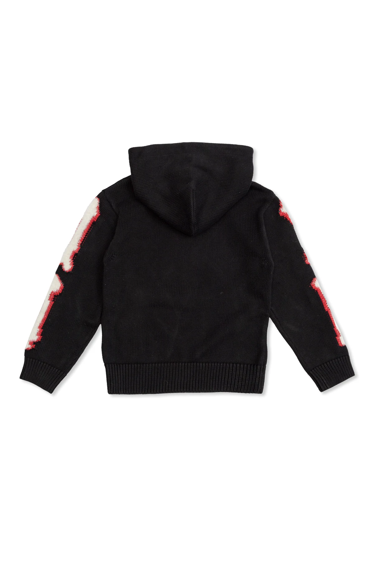 Introducing the Amiri Kids Hooded Sweater, a masterpiece of exclusive apparel that blends classic tailoring with a modern aesthetic. Crafted from a luxurious blend of cotton and polyamide, this sweater promises warmth and durability, making it a perfect choice for cooler days. Its dense weave not only offers comfort but also showcases the hallmark of high-quality craftsmanship. The sweater\'s distinctive design features striking red stripes on the sleeves, creating a unique style signature that is instantly recognizable as an Amiri creation. These bands, with their slightly \'blurred\' appearance, introduce an artistic effect or a special dyeing technique, elevating the garment\'s exclusivity. The black fabric serves as a canvas to the vibrant red embroidered logo above the kangaroo pocket, highlighting the designer\'s brand with elegance and an edge of sophistication. Meticulously designed with a chunky, elastic hem and sleeve cuffs, it ensures a snug fit while enhancing the wearer\'s comfort. This hooded sweater is not only a testament to timeless style but also to the innovative spirit of the Amiri brand. Why Purchase This Product? Exclusive Amiri Kids design with a modern twist. Luxurious material composition for ultimate comfort and durability. Unique red stripes and logo embroidery for distinctive brand recognition. Perfect blend of classic craftsmanship and contemporary aesthetics.