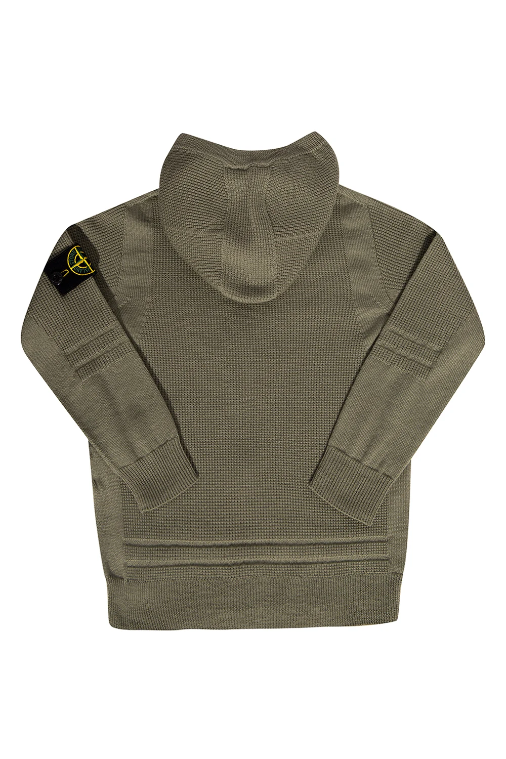 Green hooded cardigan from Stone Island Kids. Made of wool, this garment features a black zip, black detachable sleeve appliqué with a logo in yellow and green as well as ribbed trims at the hood, hem and cuffs.