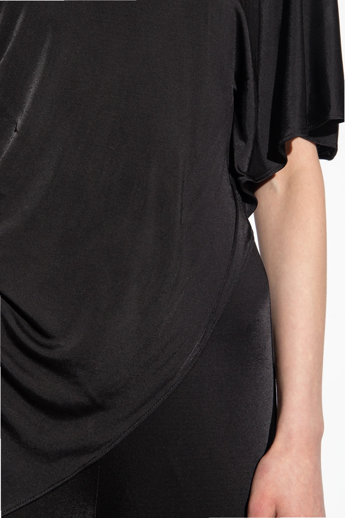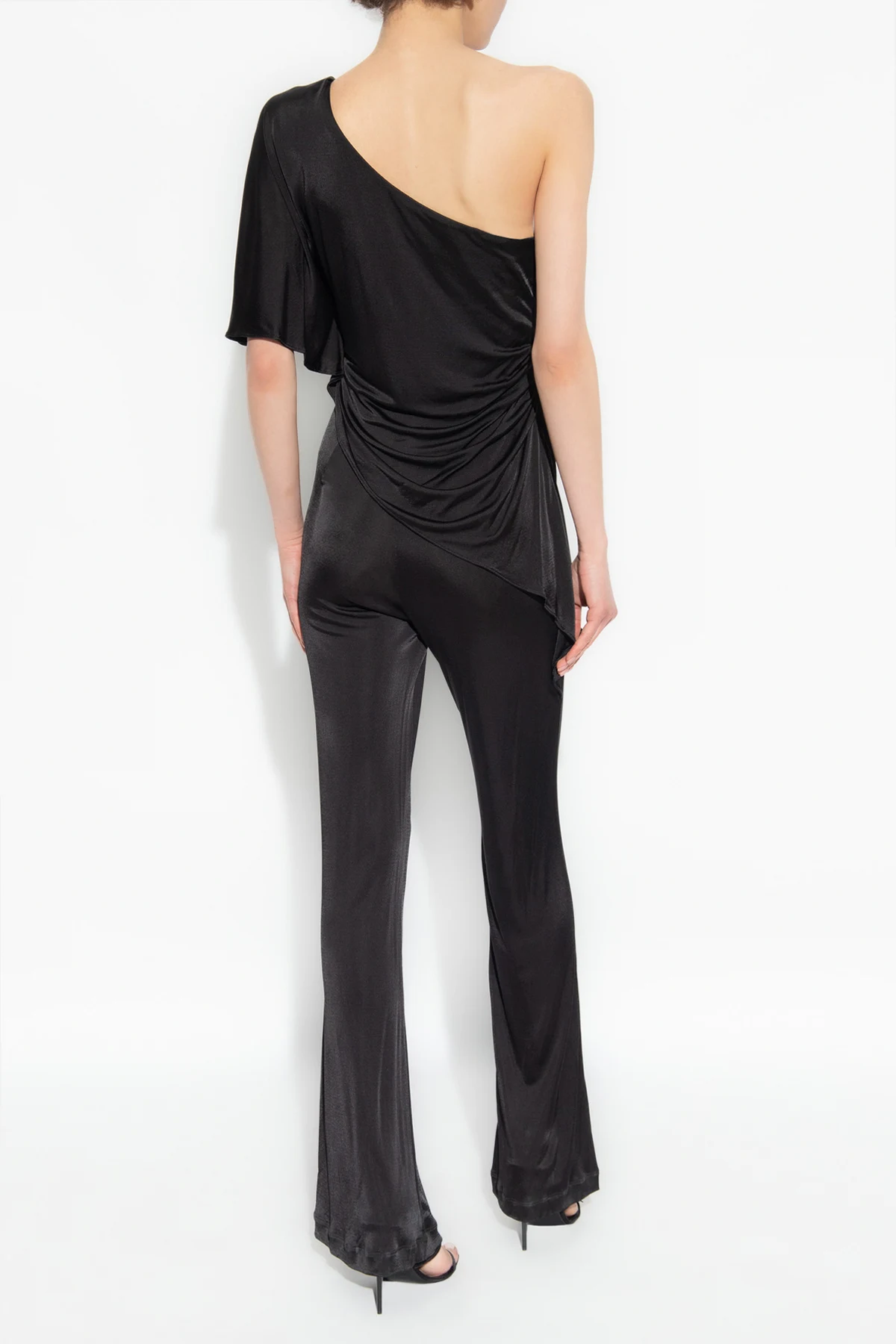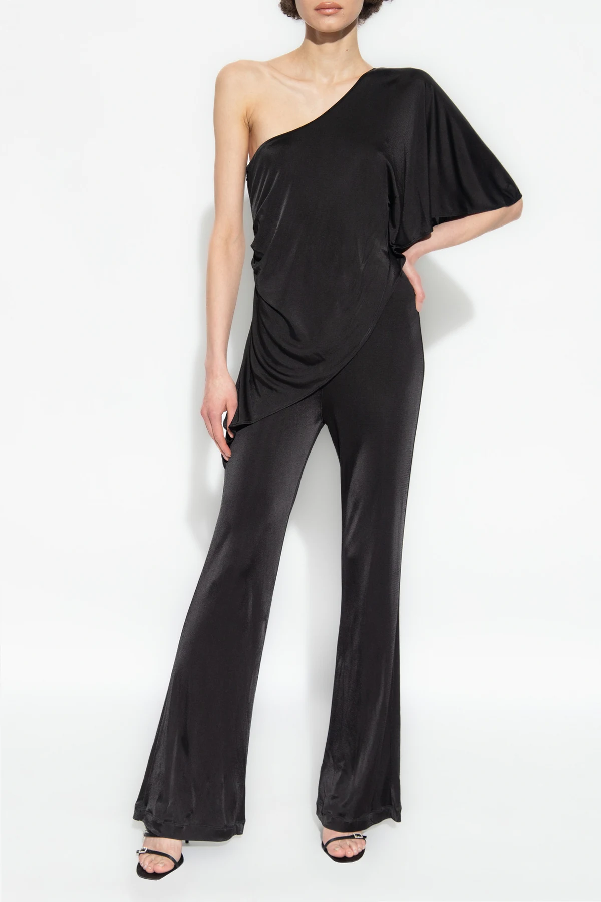 Black ‘Talia’ jumpsuit from Diane Von Furstenberg. Fastened with a hidden side zipper and hook & eye closure, this style features short sleeves and fluid inserts.