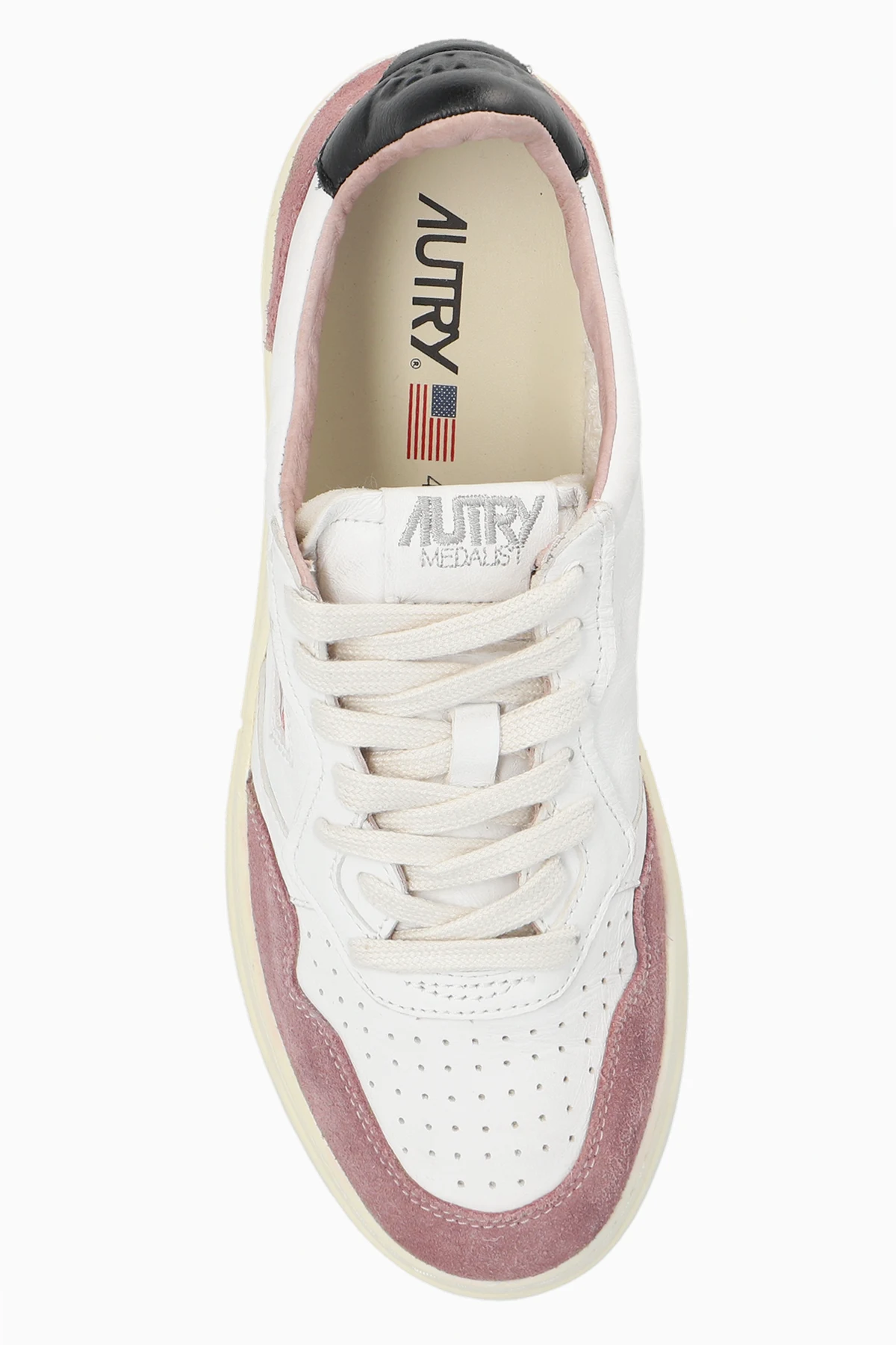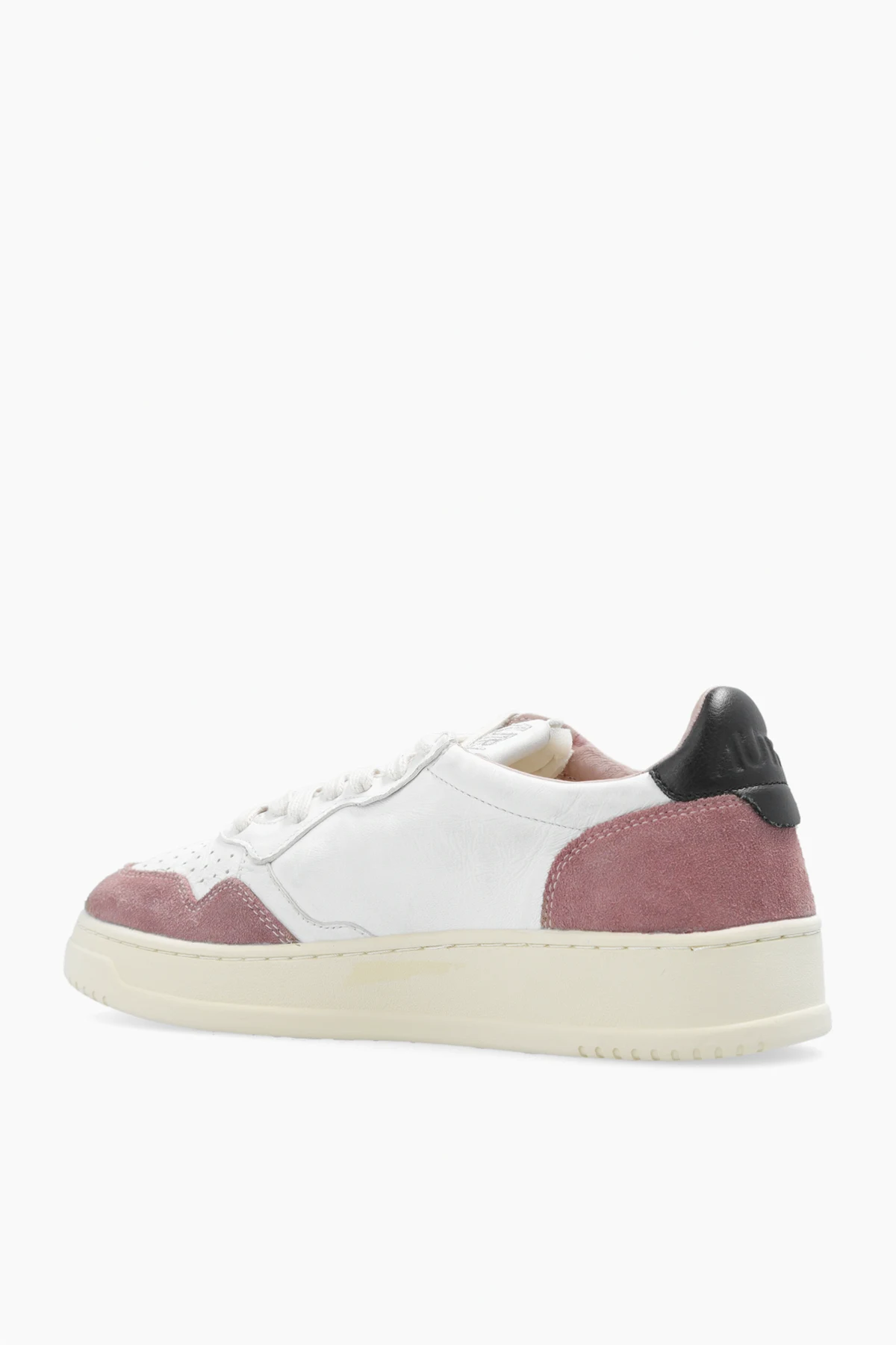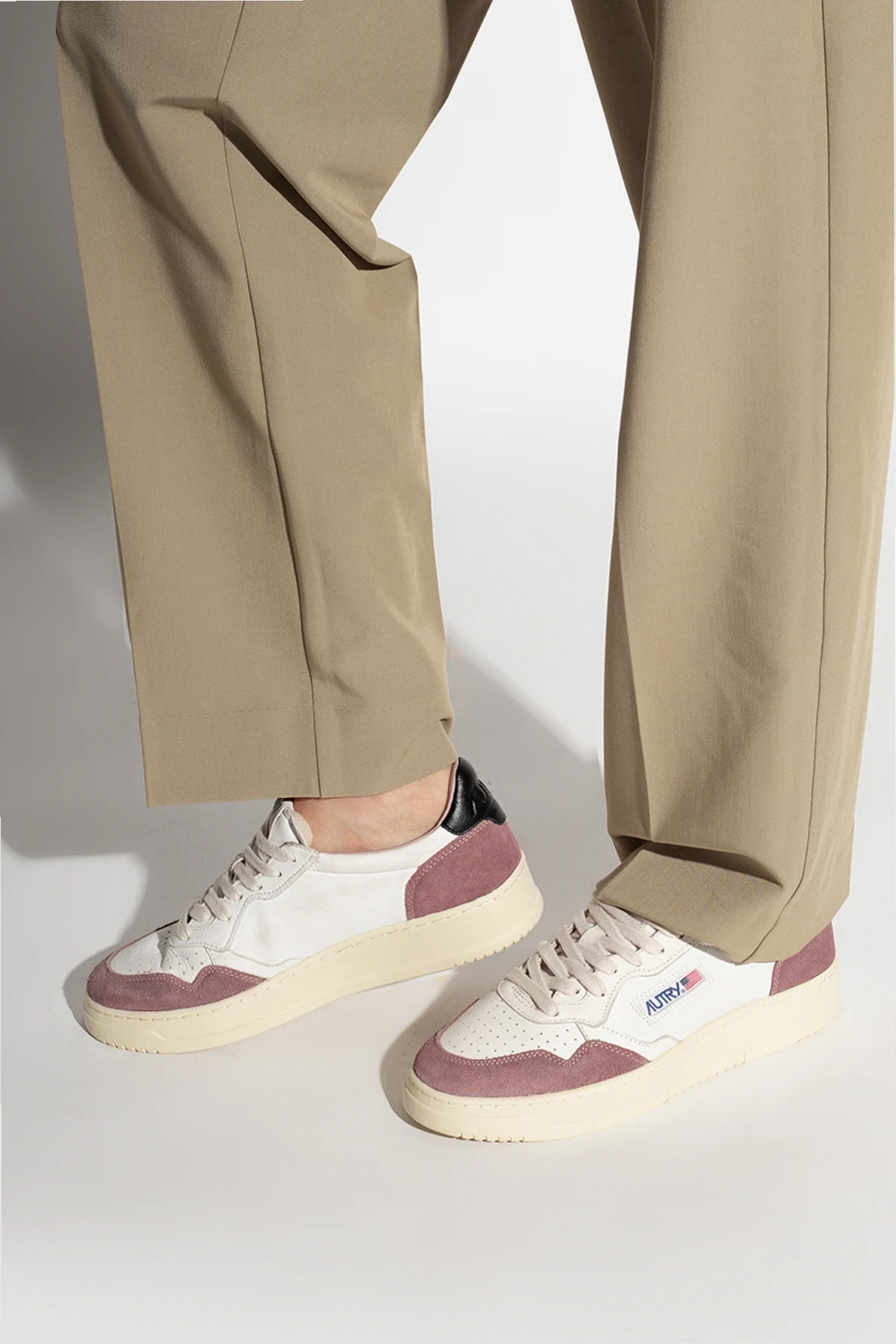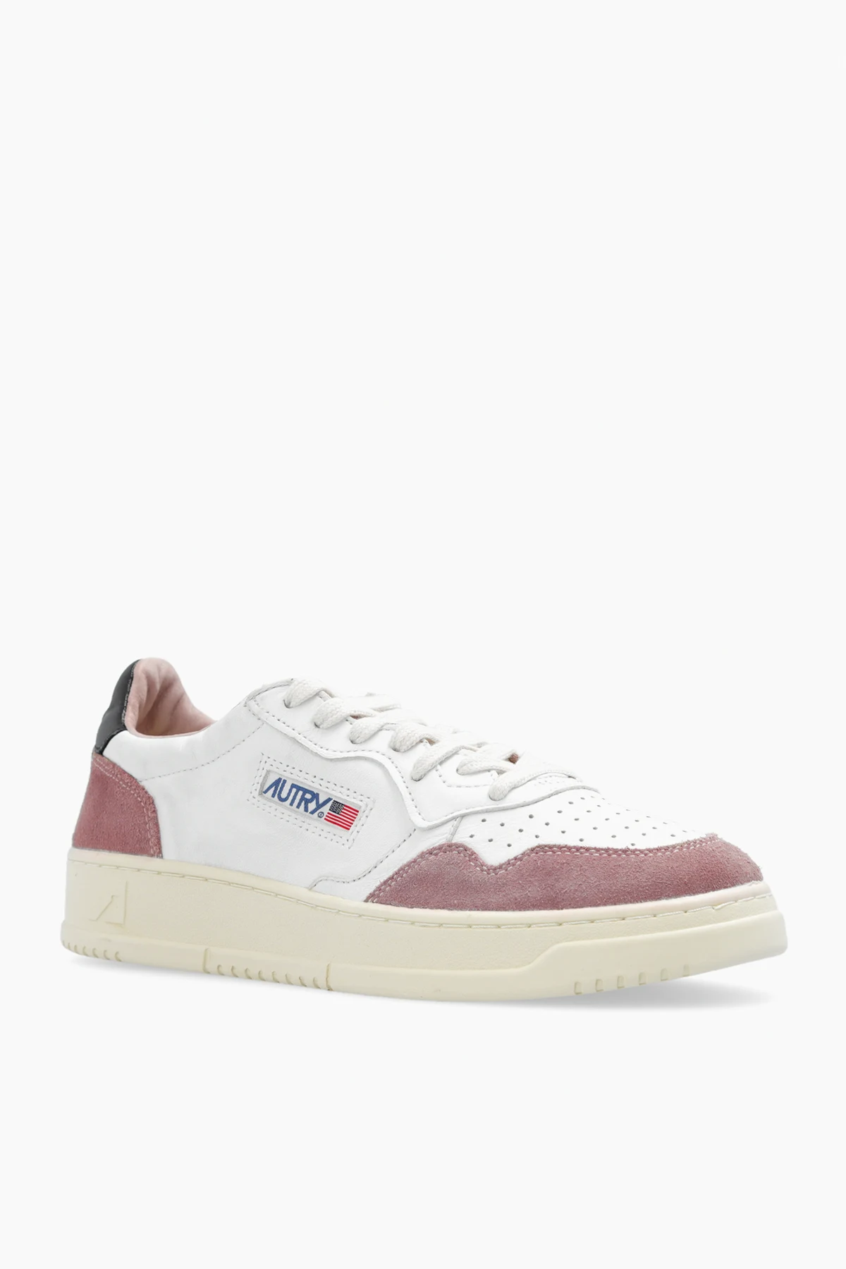 The ‘Aulw’ sneakers by Autry encapsulate the essence of iconic sportswear heritage and modern sophistication. Expertly crafted with a low-top silhouette, these shoes boast a classic, rounded toe and a wide, supportive upper that ensures unrivaled comfort. The pristine white, smooth leather is artfully contrasted by soft suede panels in muted blush at the toe and heel, lending the sneakers a distinct and fashion-forward appeal. Thoughtfully perforated at the front for breathability, each pair is completed with a refined cream-hued rubber sole that evokes a timeless aesthetic. The exterior side features an embroidered AUTRY designer logo in deep navy, a subtle yet sophisticated testament to its Dallas roots and storied American sporting legacy. Indulge in the incomparable blend of premium leathers, exceptional fit, and understated elegance it offers. Why choose this product? Exquisite combination of smooth leather and plush suede accents Signature embroidered logo for a unique designer touch Perforated detailing promotes enduring freshness Classic design updated with luxe materials for modern lifestyles Exceptional comfort and support for all-day wear