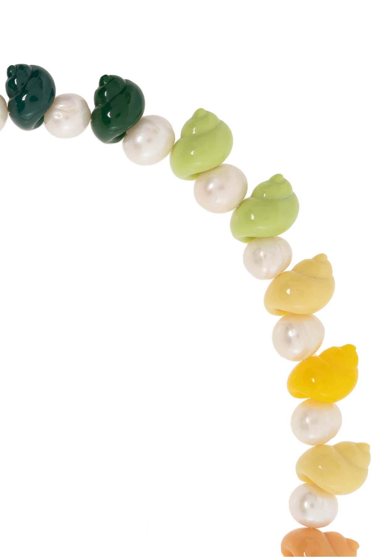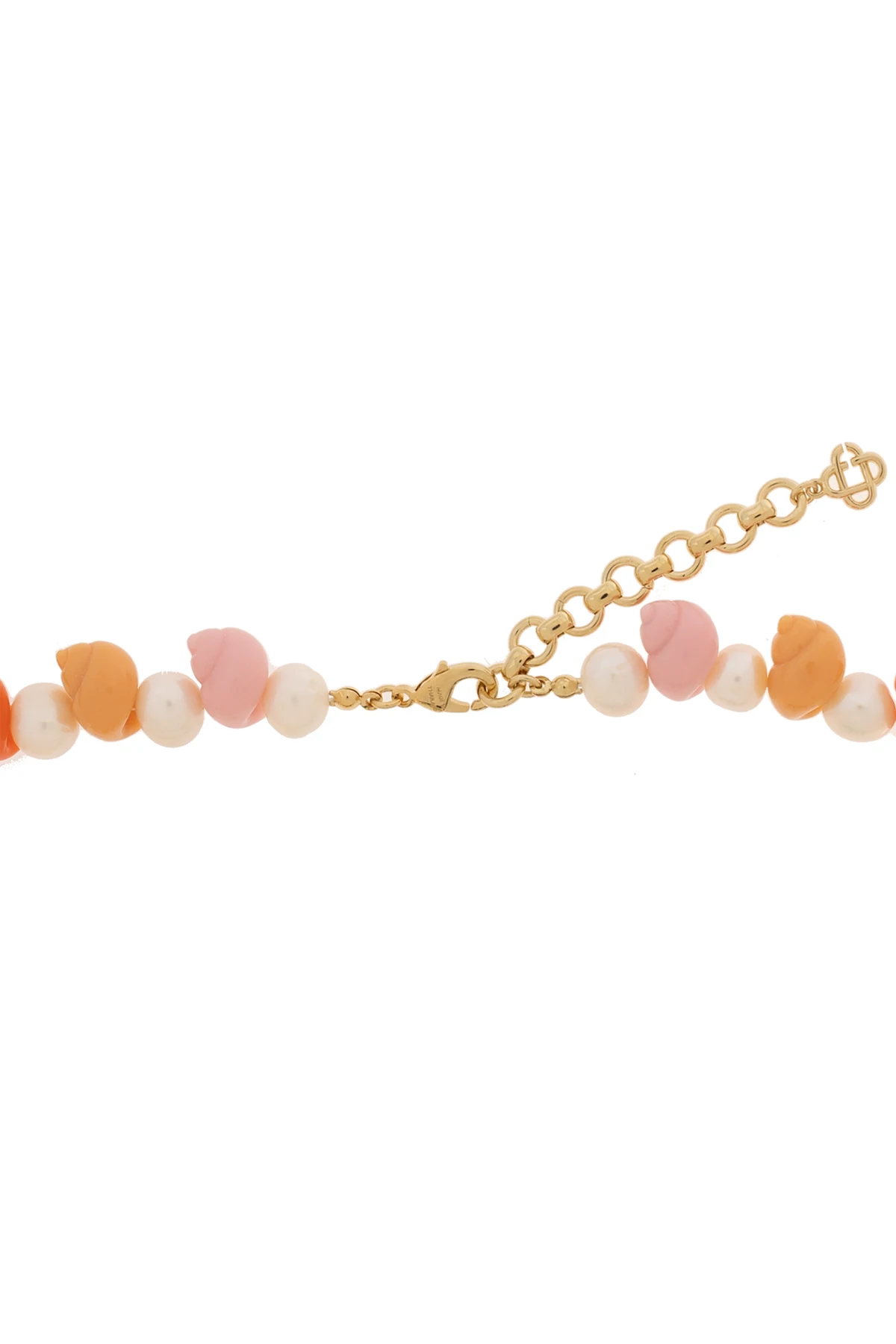 Introducing the Casablanca Shell Motif Necklace, a symphony of multi-colored elements that evoke the serene beauty of the ocean. This exquisite piece seamlessly blends artificial pearl accents with a vibrant array of resin-crafted seashells, meticulously arranged to create a mesmerizing gradient of hues. From the soft whispers of white and pastel tones to the deep, lush greens, each element is a testament to the artistry and elegance that define the Casablanca brand. The centerpiece, a delicately gold-plated shell pendant, adds a touch of opulence, while the adjustable, gold-plated brass clasp ensures a perfect fit, allowing this versatile piece to be worn in various configurations. The thoughtful gradation of colors, from the lighter shades at the top to the darker ones at the bottom, along with the thematic coherence of the shell design, make this necklace not just an accessory, but a statement. Why Purchase This Product? Exclusivity: Crafted with an eye for detail, this necklace is a unique blend of artificial pearls and colorful, shell-like elements, offering an exclusive addition to any jewelry collection. Versatility: Its dual-part design allows for multiple wearing styles, making it a flexible choice for various occasions. Luxury: The gold-plated shell pendant and closure elevate the piece, infusing your ensemble with a touch of sophistication. Adjustability: Featuring a user-friendly lobster clasp, the necklace can be easily adjusted to suit your preference, ensuring both comfort and a flawless fit.