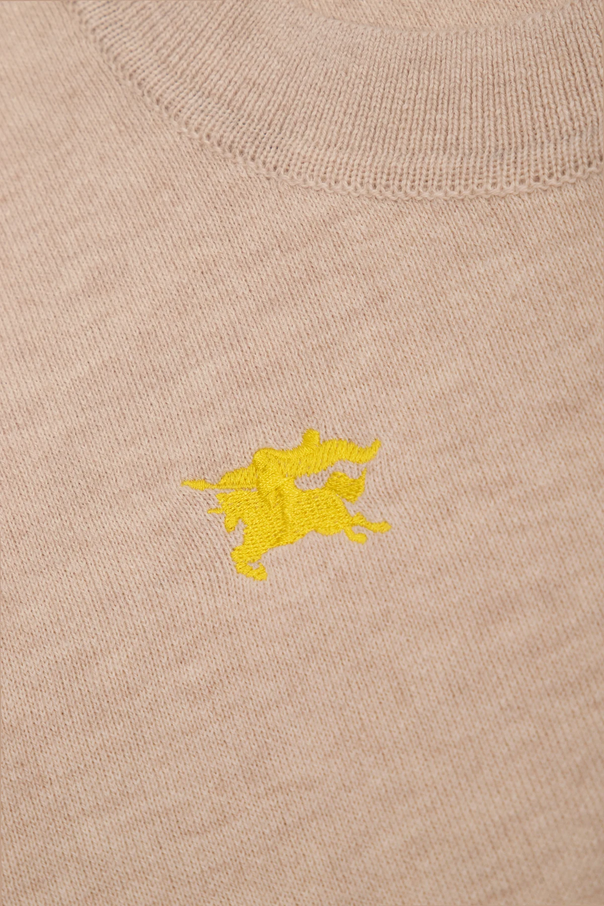Beige cardigan from Burberry Kids. Made from a cotton and cashmere blend, this style fastens via buttons and showcases colourful ‘Equestrian Knight’ embroidery, long sleeves and ribbed trims on the round neck, bottom hem and cuffs.