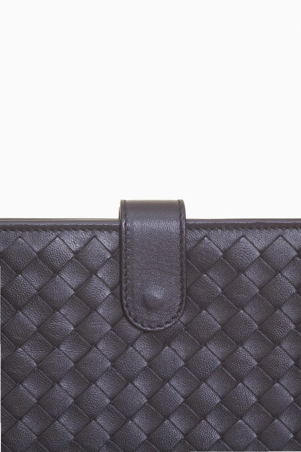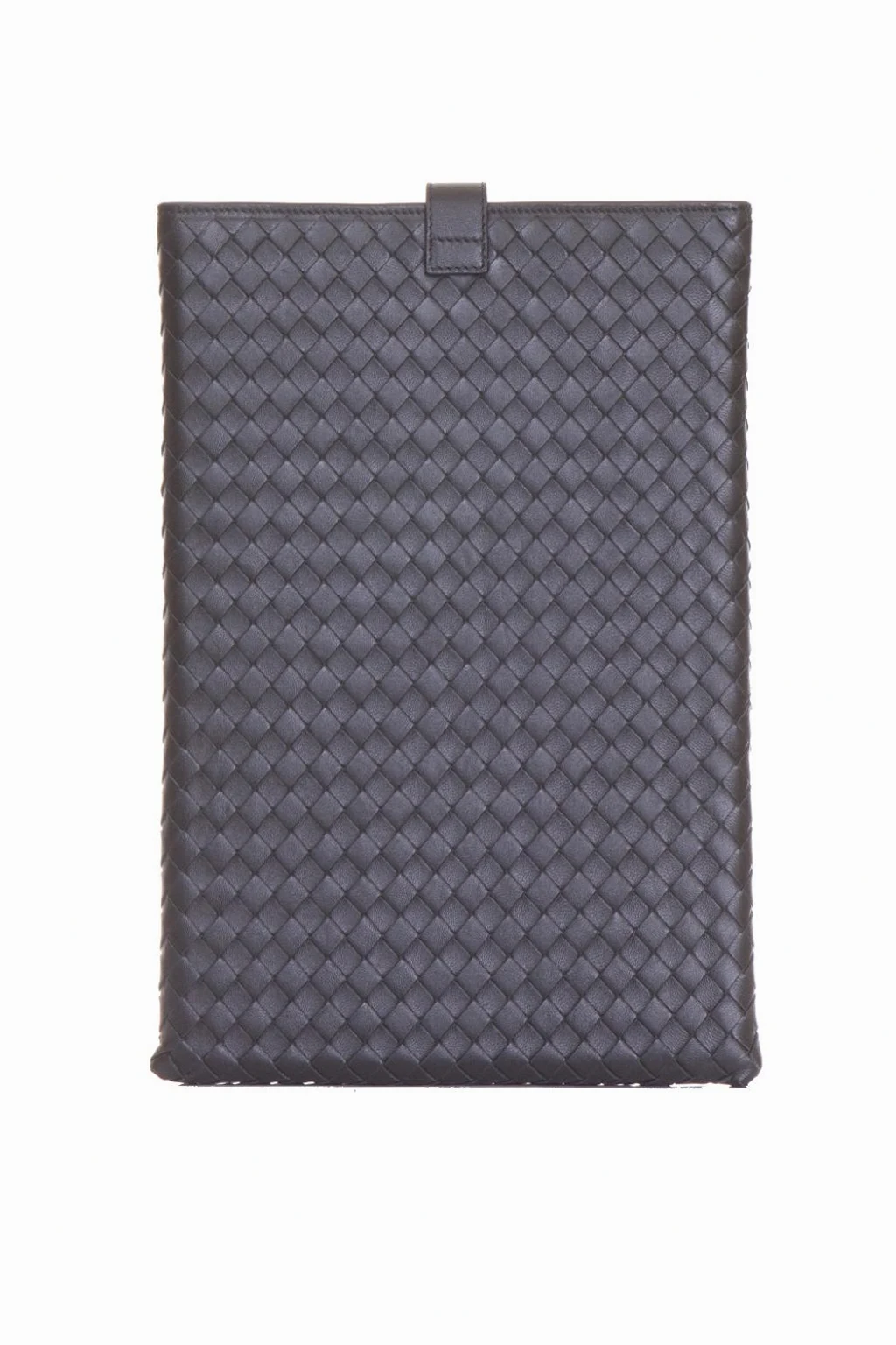 Black lamb leather iPad case from Bottega Veneta. Top snap fastening.
