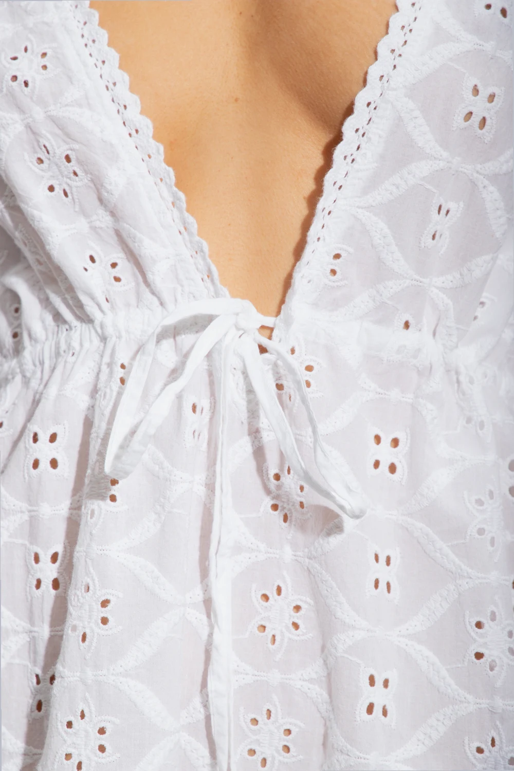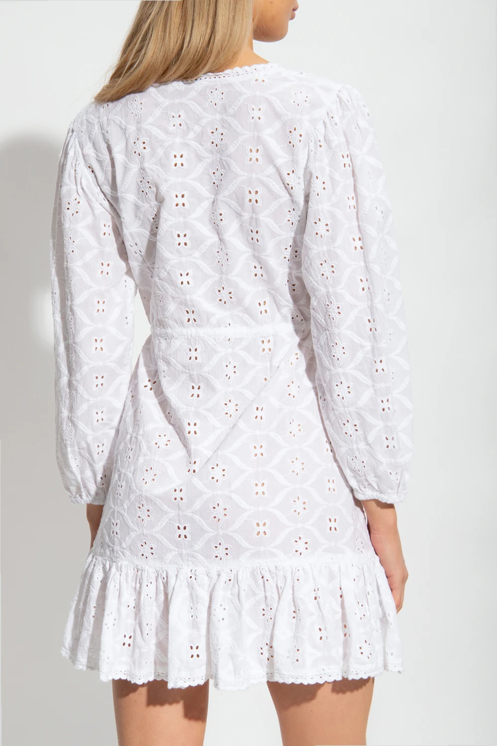 White dress from Melissa Odabash. Crafted from cotton, this design features openwork floral cut-outs and long puff sleeves with elasticated cuffs.