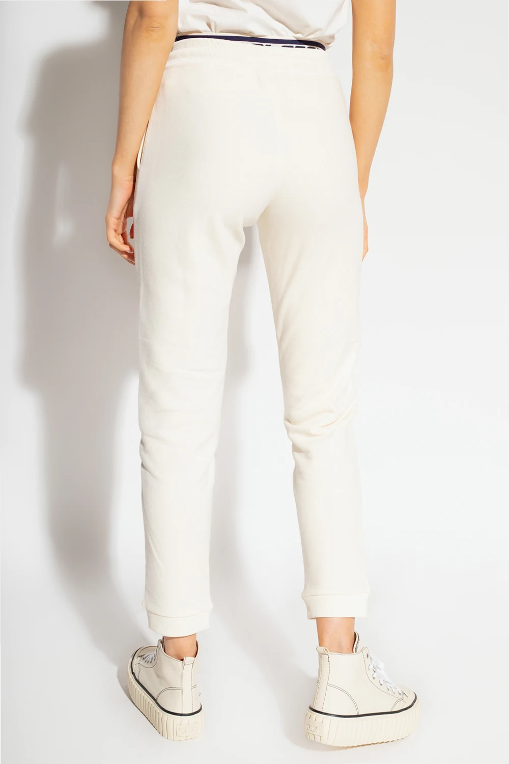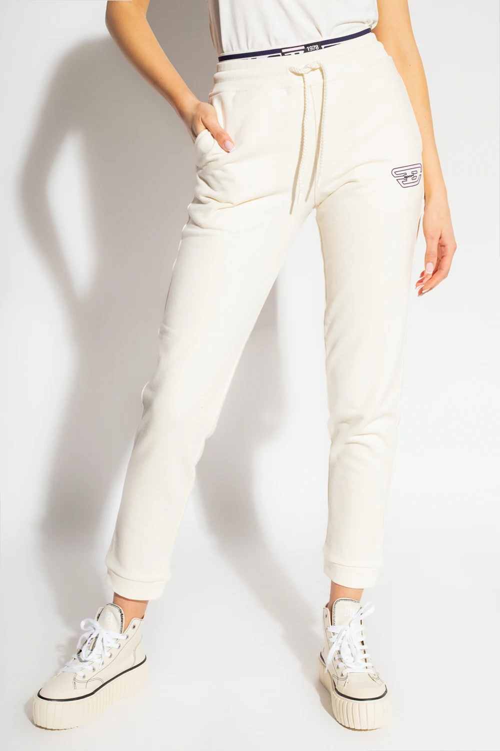Cream \'AWSB-ORYANN\' sweatpants from Diesel, the ‘Diesel Sport’ collection. Made of moisture-wicking fabric that stays dry, this garment features a drawstring waist, elastic logo-embroidered waistband in cream, navy and pink, two front pockets, logo print, logo patch at the back and elasticated cuffs.