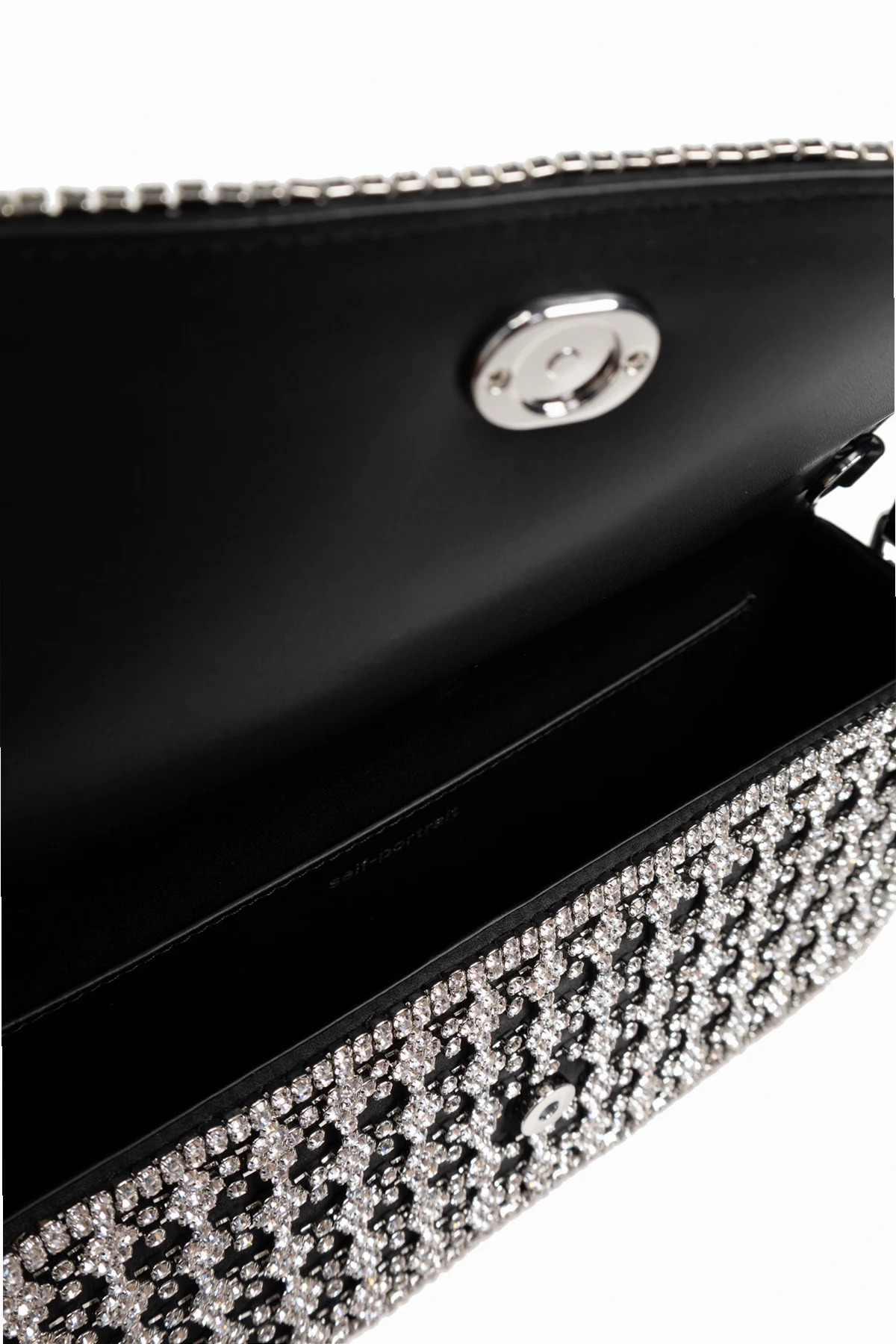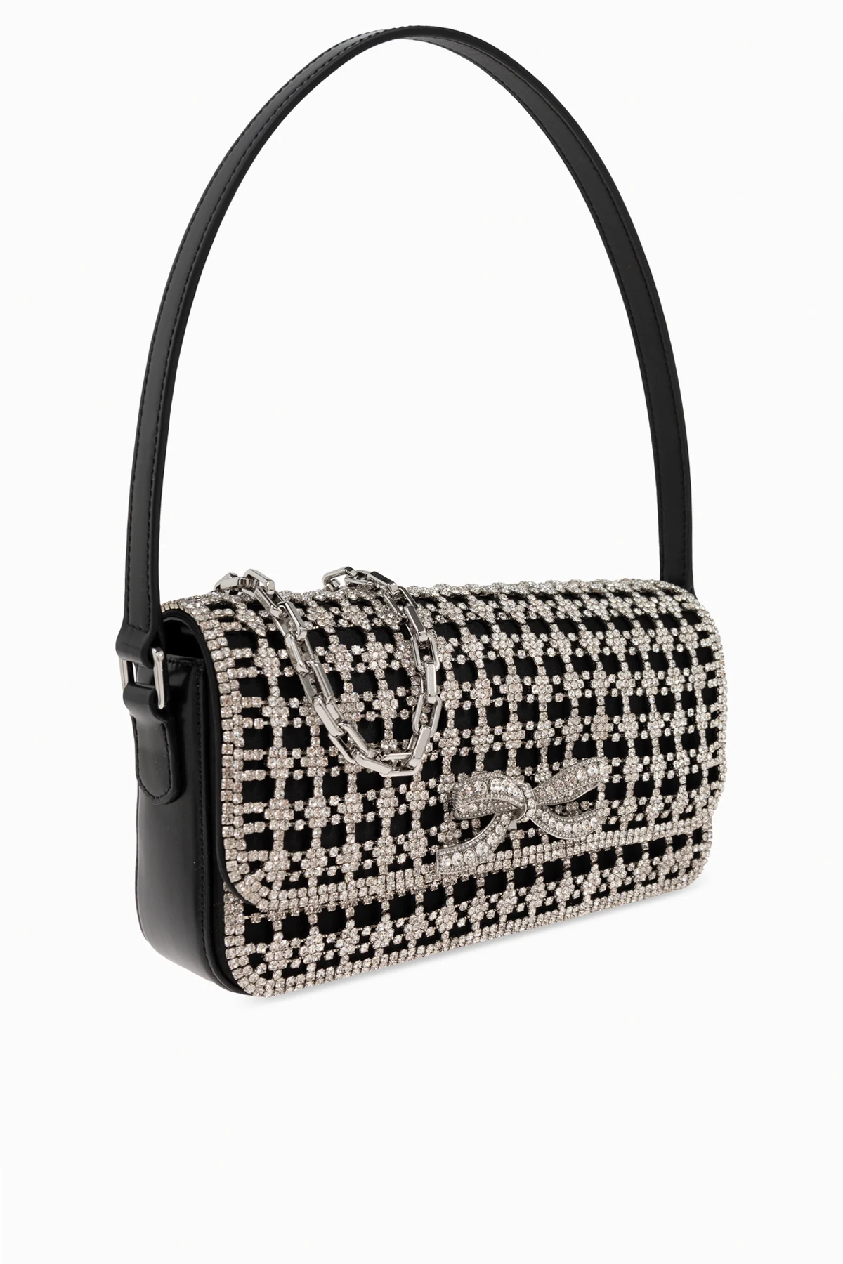 Introducing the Self-Portrait Shoulder Bag, a paragon of sophistication from the esteemed designer, Han Chong. This exquisite bag, part of an exclusive collection, embodies the essence of luxury and modern elegance. The bag showcases a rectangular shape with a flap closure, adorned with a resplendent crystal grid pattern that glistens against its black backdrop. The handle, crafted from smooth, black leather, and a metal chain strap offer versatile carrying options. A striking crystal bow embellishes the front, adding a touch of refined artistry. The magnetic snap closure ensures secure storage, revealing an interior lined with sleek black fabric and featuring a metal plate embossed with the designer\'s logo. This bag\'s primary color is a timeless black, accentuated by dazzling silver crystals, creating a look that is both luxurious and sophisticated. Why Choose This Product? Elegant rectangular design with a crystal grid pattern Crafted from premium black leather and synthetic materials Decorative crystal bow for added refinement Versatile metal chain strap Secure magnetic snap closure Luxurious black interior with designer logo plate