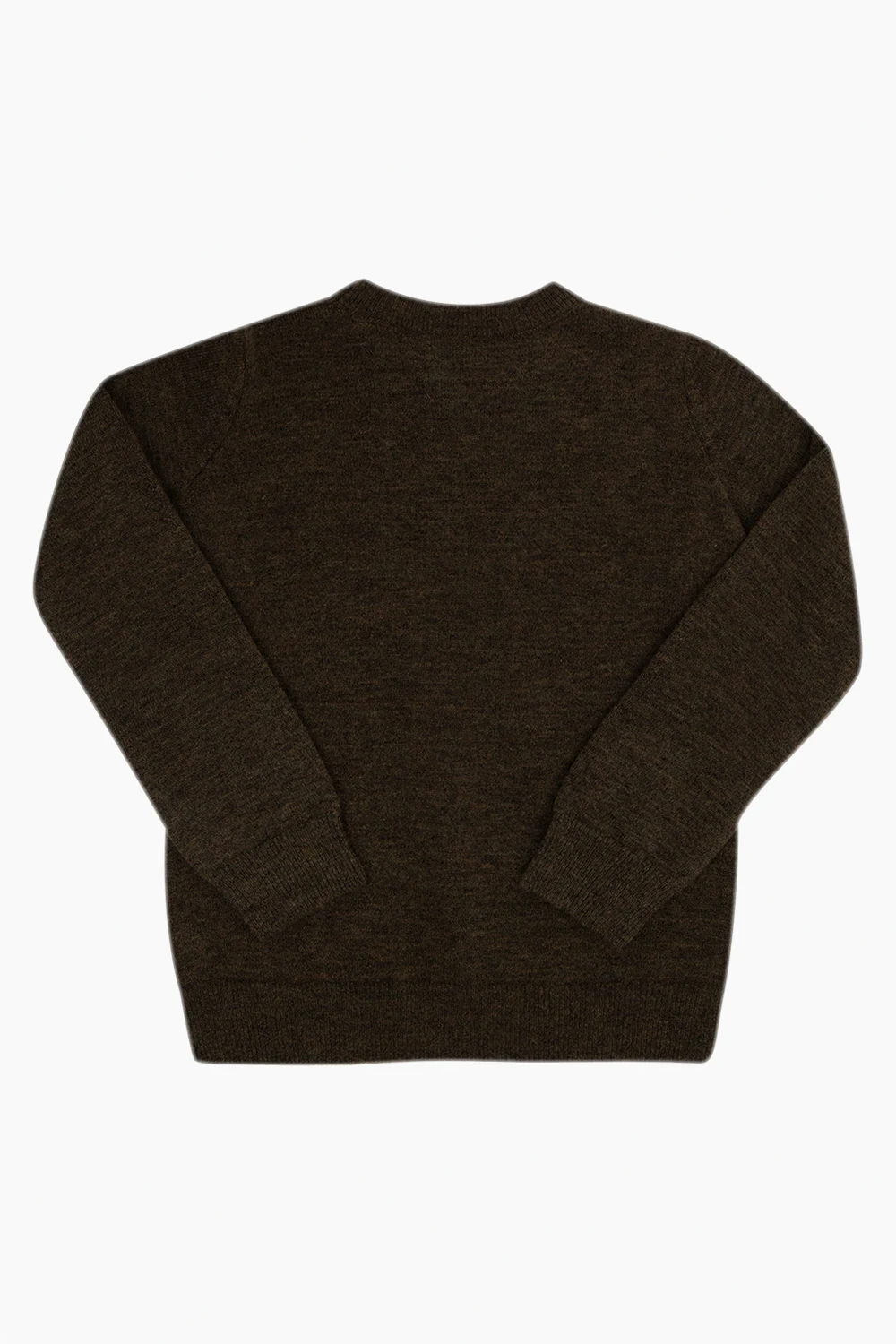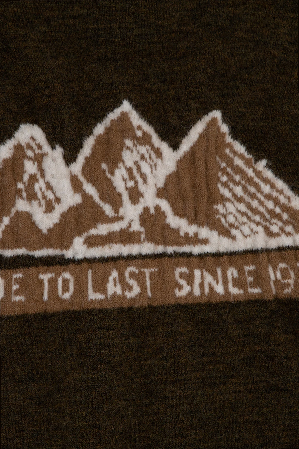 Dark green crewneck sweater from Bonpoint. Crafted from a fabric blend including alpaca wool, this style features a cream and brown intarsia pattern with an alpine motif on the front and ribbed trims on the collar, bottom hem and cuffs.