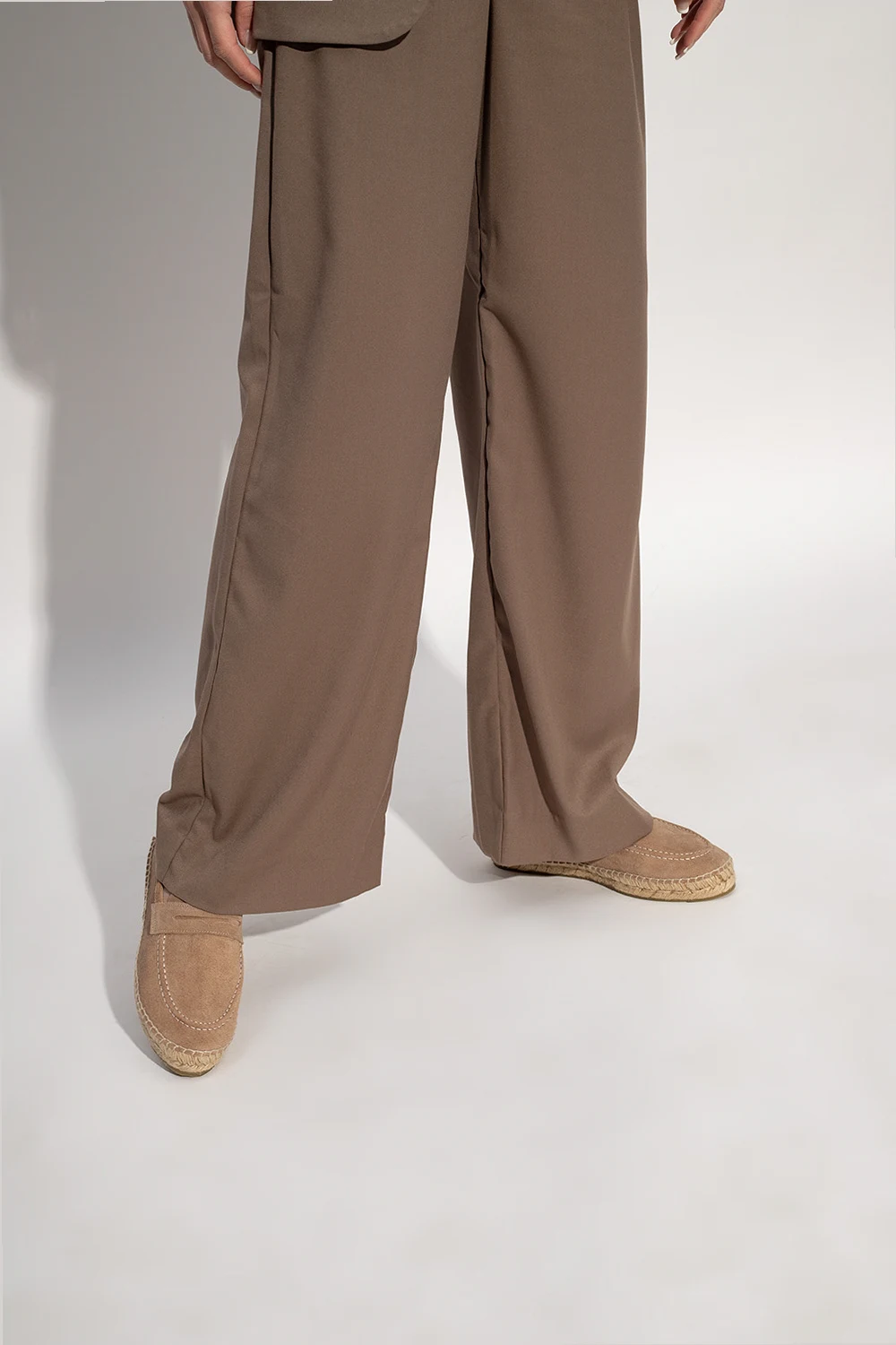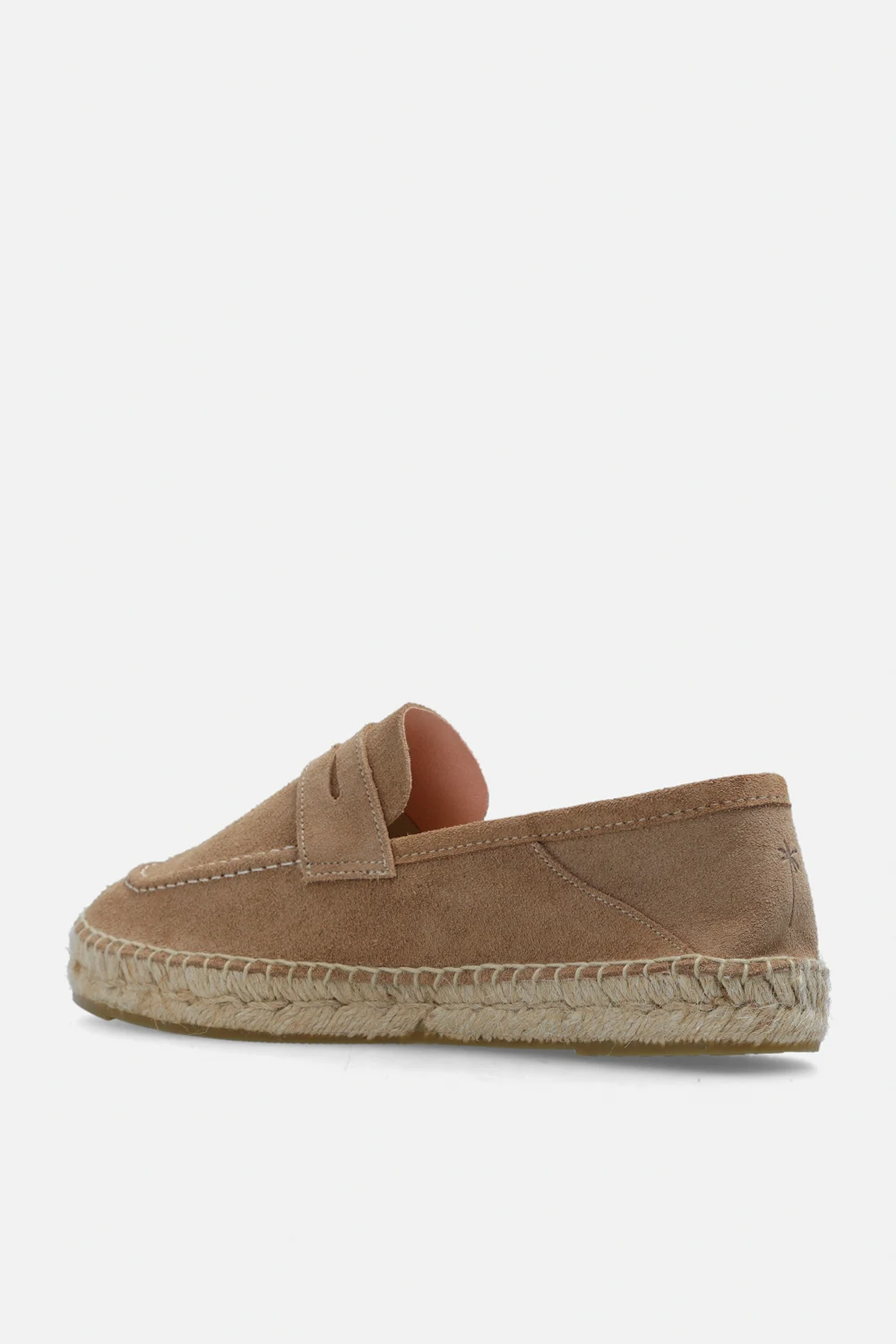 Greyish beige loafers from Manebi. Made of suede, this model sits on a natural jute sole with a thin layer of beige rubber and features an embossed logo at the back.