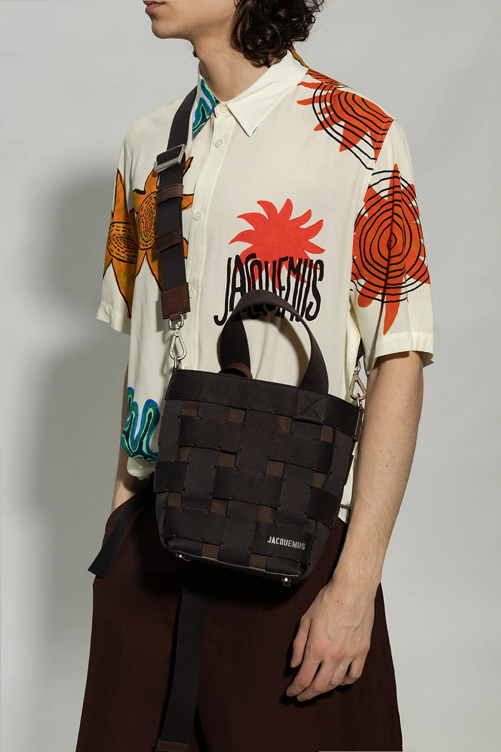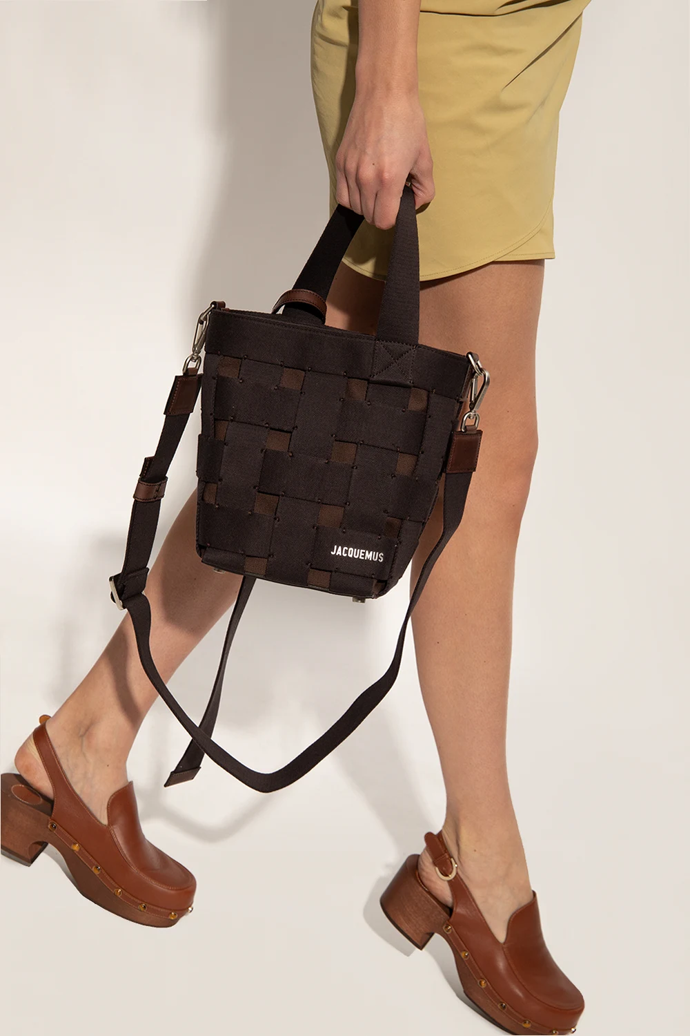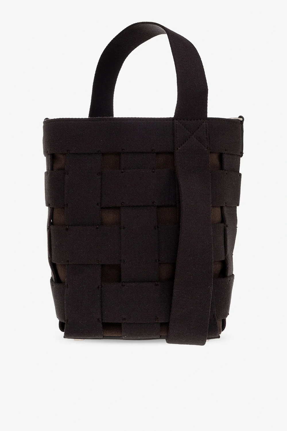 Black and brown ‘Le Seau’ bucket shoulder bag from Jacquemus. Crafted from canvas and trimmed with leather, this design secures with a lobster clasp and showcases a checked motif created by interlaced straps. It is complete with a metal logo plaque, short handle, detachable and adjustable shoulder strap, silver-tone metal hardware and one internal compartment with a zip pocket. Attached leather pendant with an embossed logo.