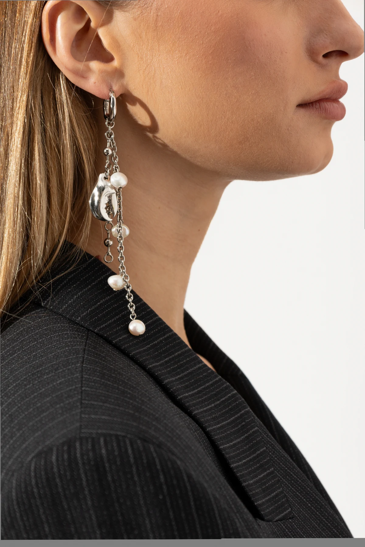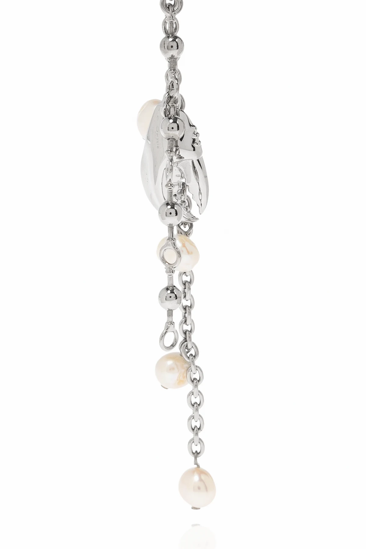 Presenting the Acne Studios Pearl Earring, a paragon of modern elegance and artistic flair. This exquisite piece is meticulously crafted from silver-toned metal, adorned with a cascade of lustrous pearls of varying sizes that gracefully dangle from a sleek chain. The design culminates in a round clasp, also in a refined silver hue, seamlessly blending sophistication with contemporary style. Inspired by the visionary philosophy of Acne Studios, this earring epitomizes the brand\'s commitment to premium quality and innovative design. Jonny Johansson\'s brand ethos shines through, offering a unique accessory that defies conventions and sets new fashion trends. The harmonious blend of Scandinavian minimalism and avant-garde aesthetics makes this piece a standout in any ensemble. Why Choose This Product? Luxurious materials – crafted from pearls and brass for an opulent touch. Distinctive modern artistry – a fresh interpretation of classic elegance. Versatile color scheme – complements a variety of outfits with its silver and white palette.
