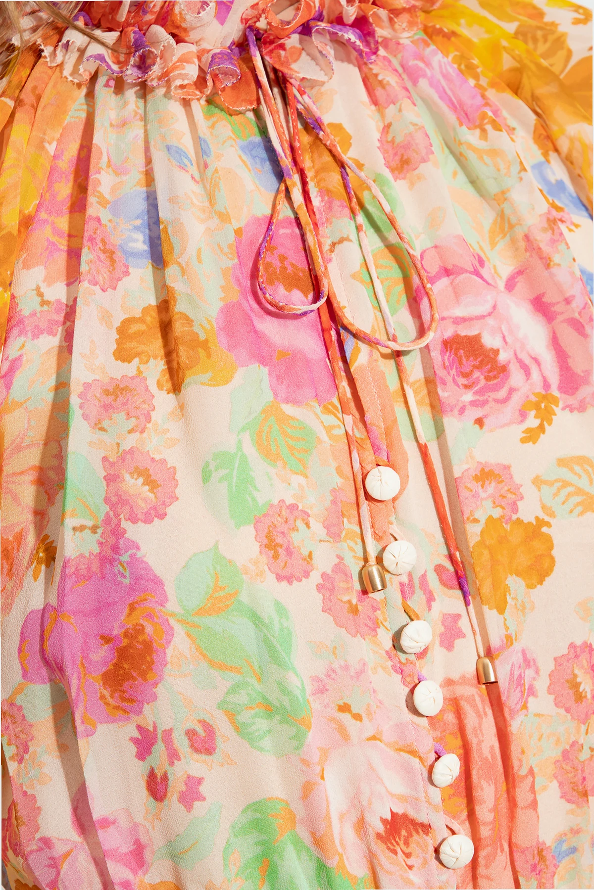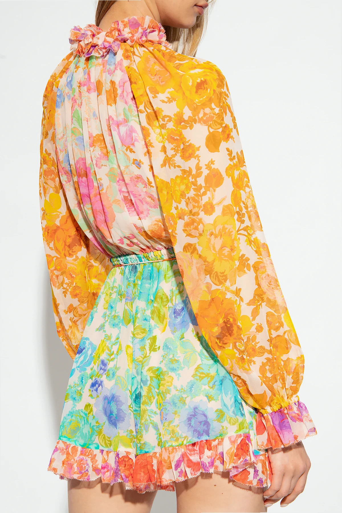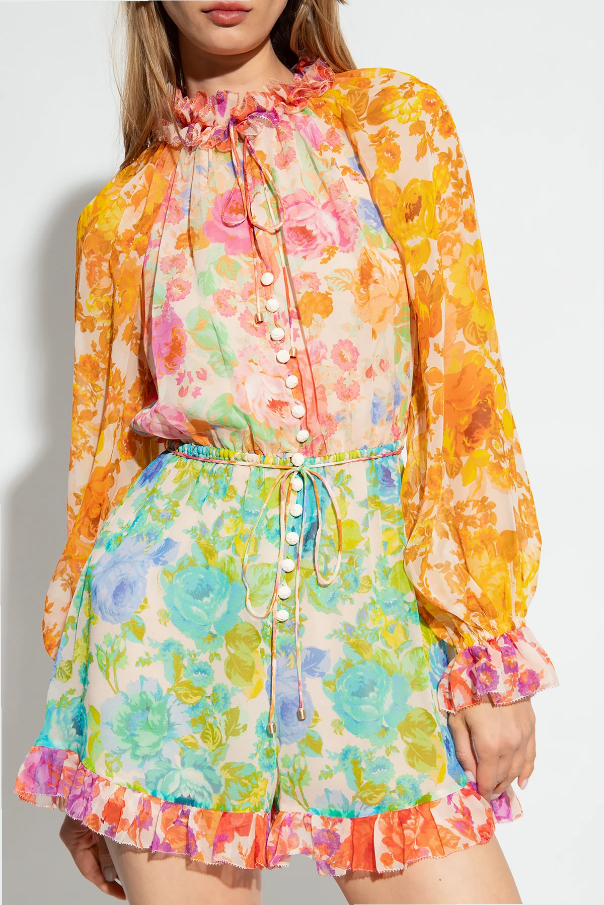 Multicolored playsuit from Zimmermann. Made from silk, this design features button fastenings on the front, a waist belt, ties at the neck, floral pattern, two slip pockets, stand collar, long puff sleeves, short legs and ruffle trimming.