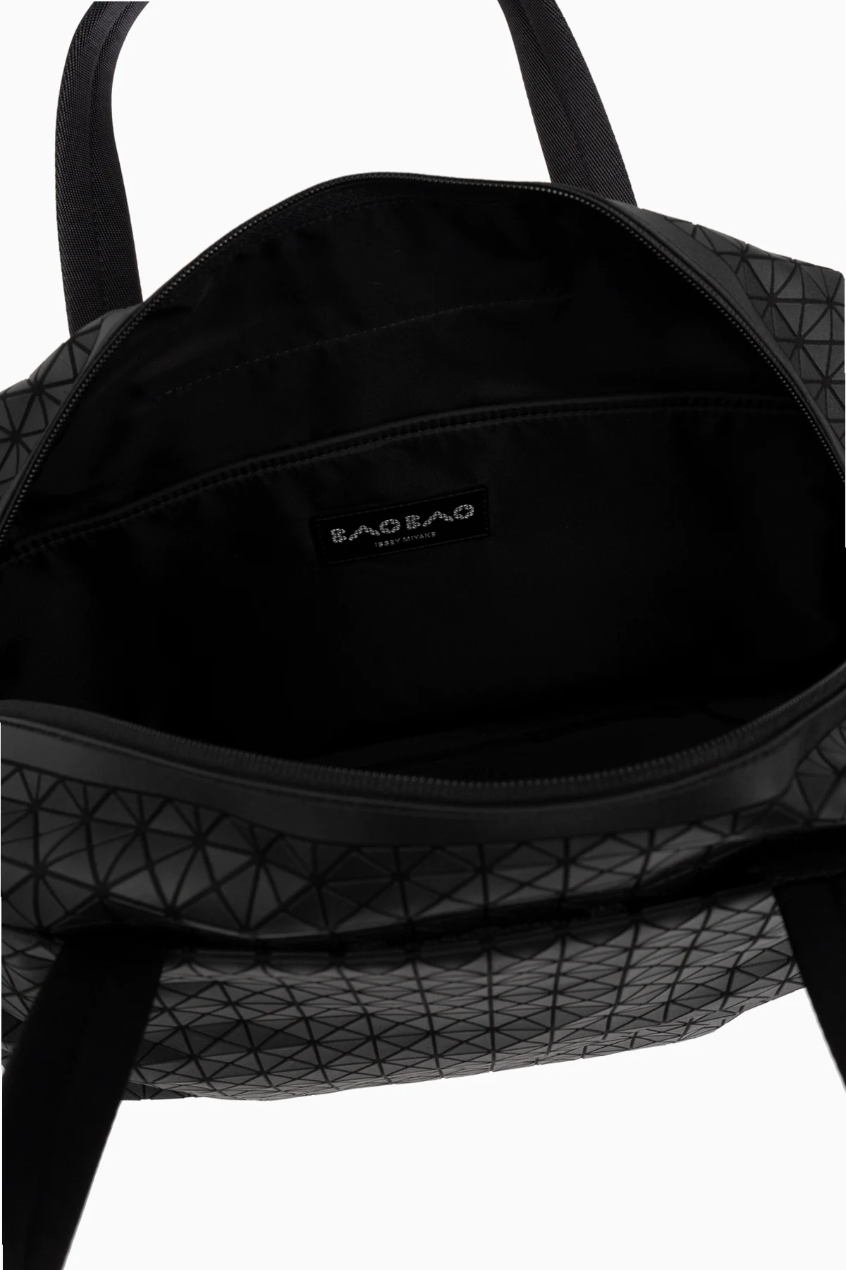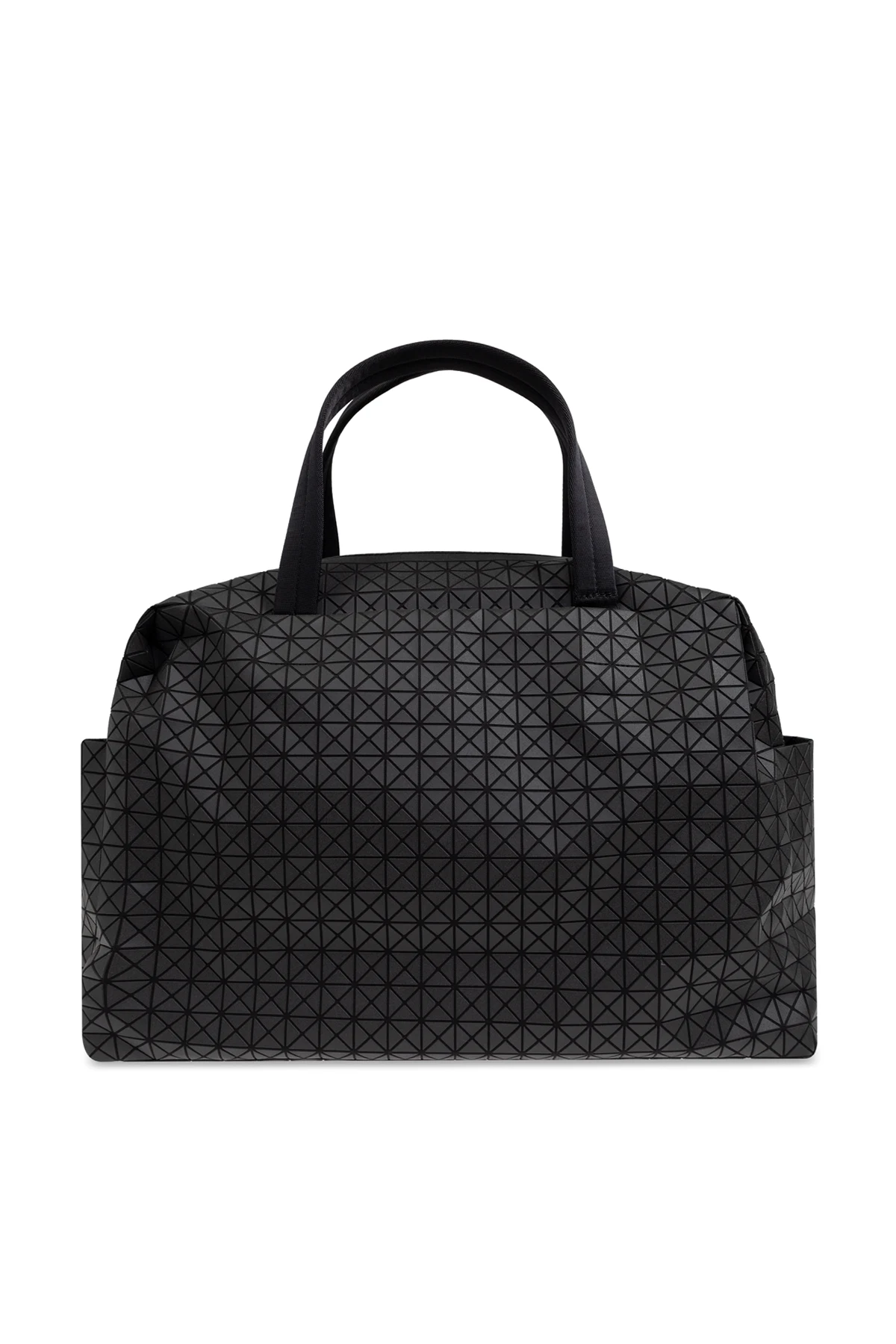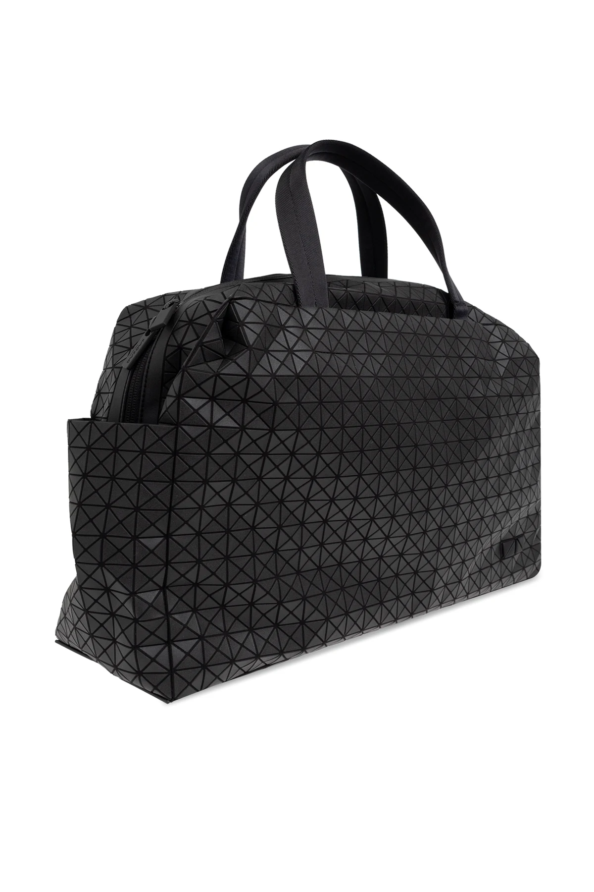 Discover the black duffle bag from the exclusive Bao Bao Issey Miyake collection, perfectly aligning with the global fashion standards. This unisex model, designed with travelers in mind, combines modernity and versatility. The bag impresses with its classic rectangular shape and a geometric pattern composed of small triangles, giving it a unique character. Made of smooth cotton and flexible polyurethane, it is likely waterproof, making it suitable for any conditions. Sturdy black handles ensure comfortable carrying, and the zipper guarantees easy access to the spacious interior. Additional side pockets enhance functionality, allowing for the storage of small items, and the \"BAO BAO\" logo tag highlights the product\'s prestigious nature. Why should you buy this product? Unique, modern design by Issey Miyake. Made from quality, likely waterproof materials. Spaciousness and functionality ideal for short trips. Additional side pockets for better organization.