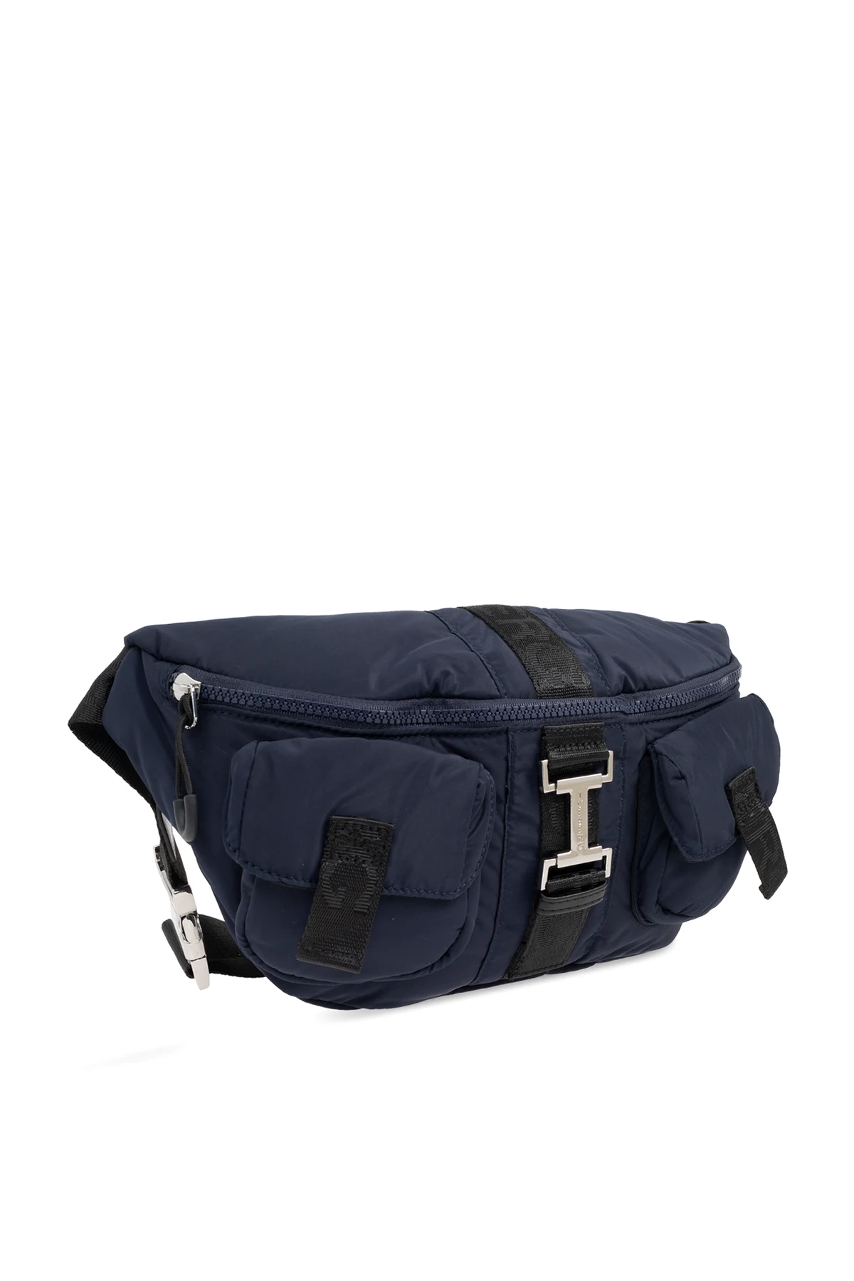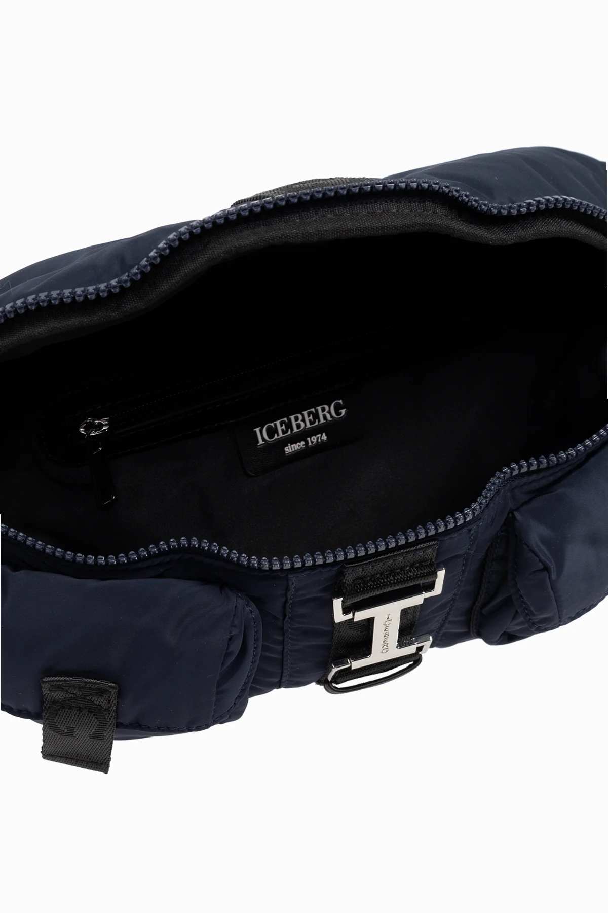 Introducing the Iceberg Belt Bag from an exclusive collection, a sublime fusion of style and practicality. This navy-blue and black masterpiece boasts a classic, rectangular silhouette with gracefully rounded edges, designed for the discerning individual. Crafted from durable synthetic material, it exudes elegance while ensuring resilience. The bag features two external flap pockets, secured with additional straps, and a top zipper closure for added security. The central metal accent, engraved with the iconic \"ICEBERG\" logo, adds a touch of sophistication. With a versatile adjustable strap, this bag can be comfortably worn on the hips or across the shoulder. Inside, discover a zipped pocket and spacious compartment that enhance its functionality for everyday use. Why Choose This Product? Elegant and durable design. Adjustable strap for versatile wear. Ample storage with three secure pockets. Emblematic \"ICEBERG\" logo accent. Ideal for daily adventures.