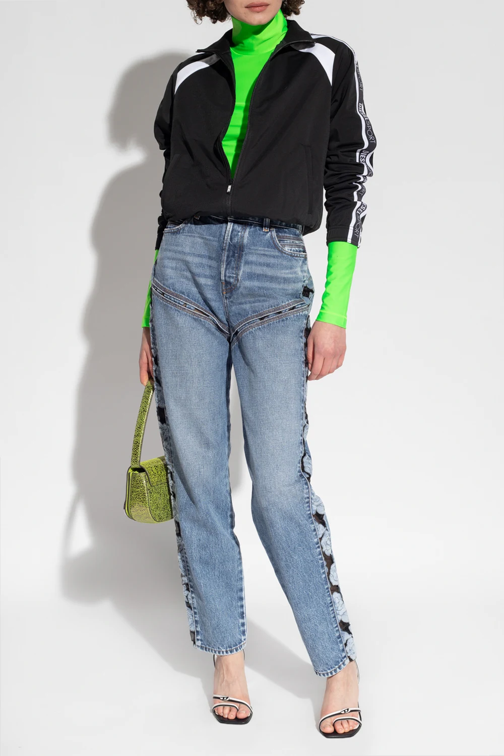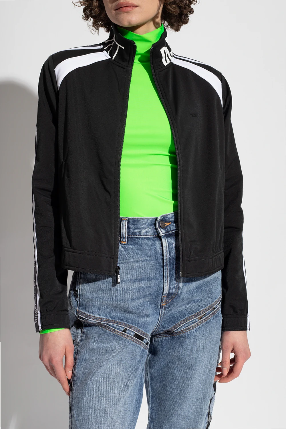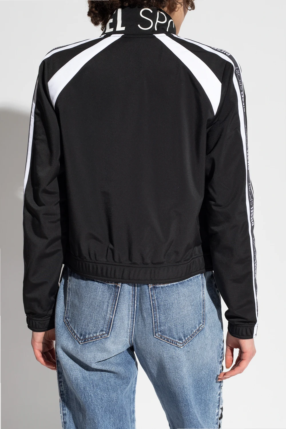 Black and white \'AWST-EMERA-HT36\' sweatshirt from Diesel, the ‘DIESEL SPORT’ collection. Enriched by branded tapes on the long sleeves, this style features a zip fastening, two frontal slip pockets and elasticated trims on the bottom hem and cuffs.