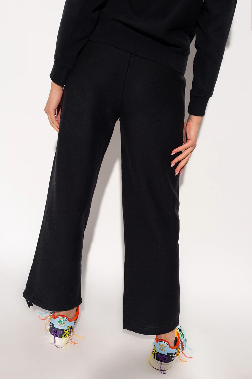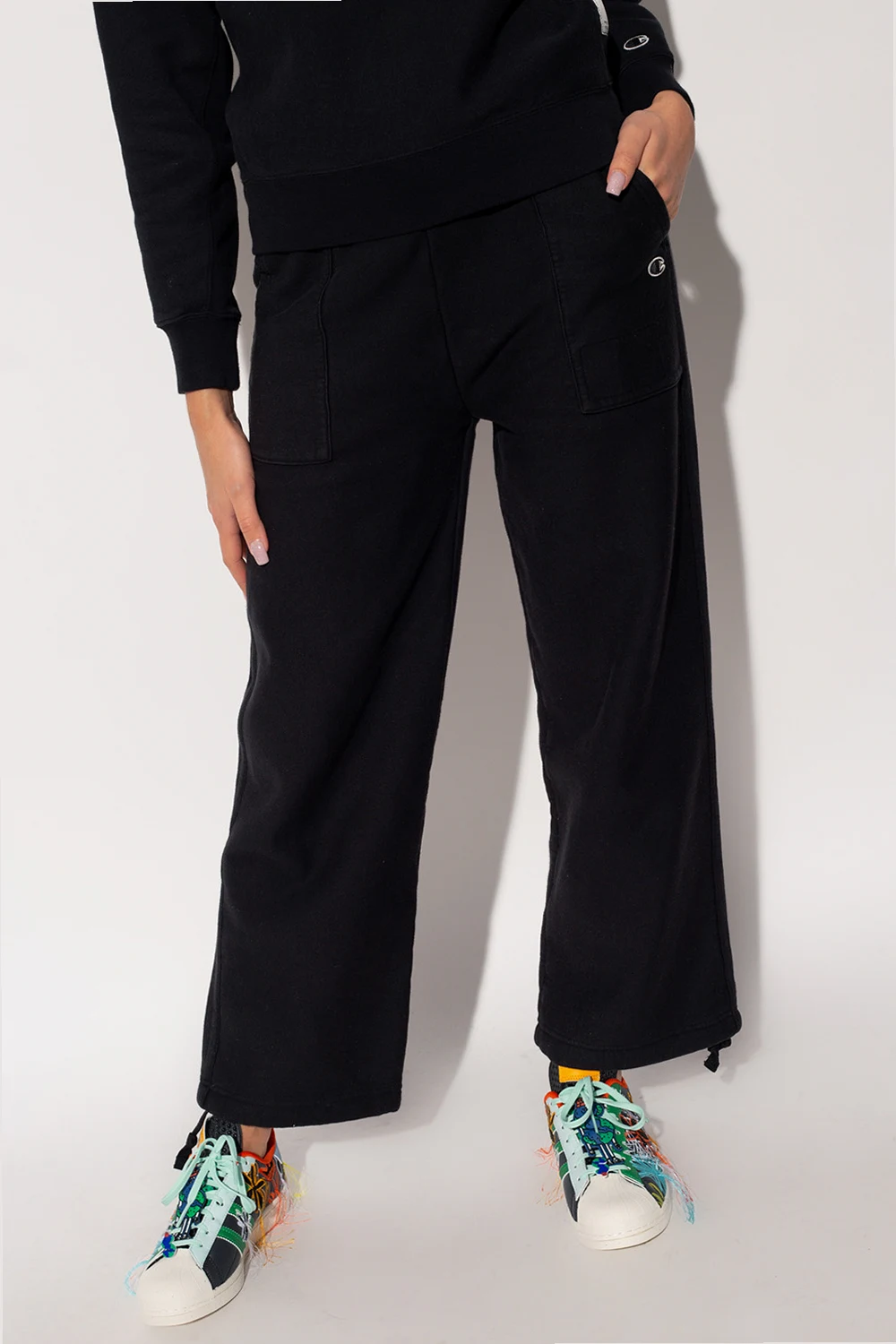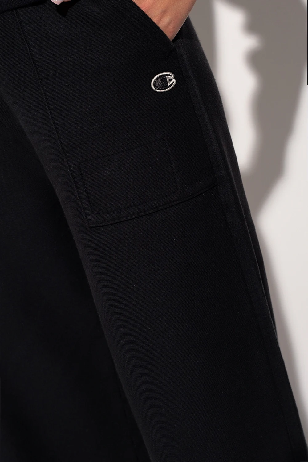 Black sweatpants from Champion. Crafted from cotton, this pair falls with wide legs and features an elasticated waistband, drawstring cuffs and two slip pockets accompanied by a logo patch on the front.