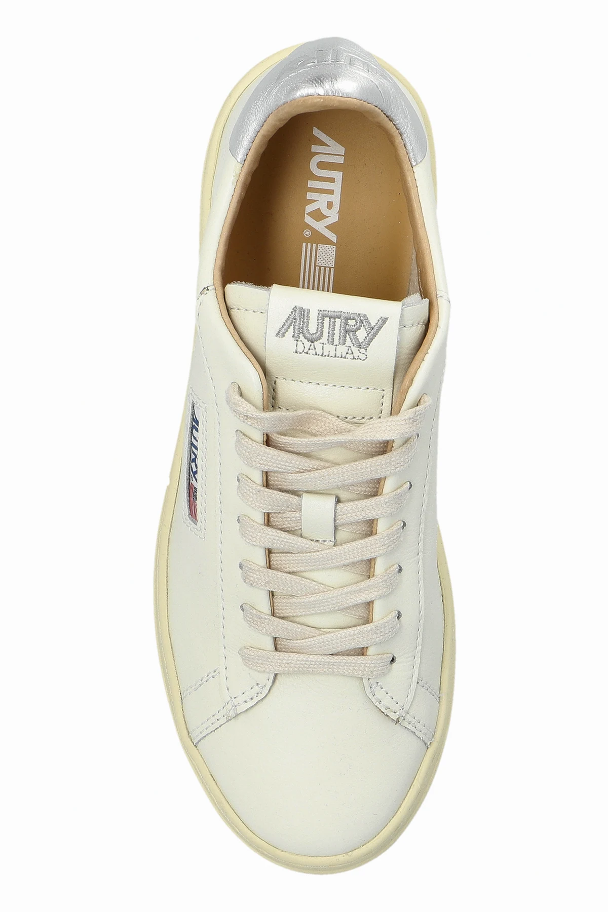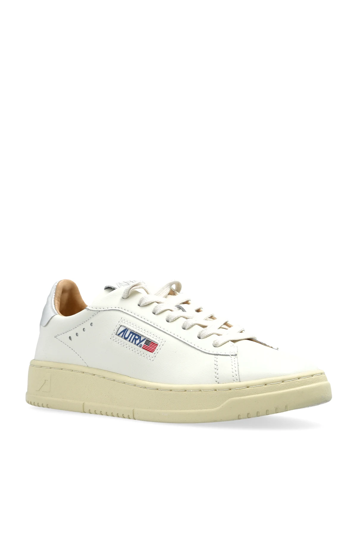 Introducing the Medalist Low sneakers from the exclusive AUTRY collection, a sublime fusion of sport and elegance. Crafted from smooth leather in a distinguished cream hue, these sneakers epitomize sophistication and casual style. Featuring the iconic AUTRY logo with a flag on the side, these low-top sneakers boast a classic silhouette, ensuring a sleek and modern look. The cream-colored sole perfectly complements the overall design, while the silver detailing at the heel adds a touch of contemporary elegance. Inside, the branded AUTRY DALLAS insole offers an extra layer of luxury and comfort. These sneakers are a testament to the brand\'s rich heritage, established by Jim Autry in 1982, and are designed to meet the demands of today\'s urban lifestyle. Why Choose This Product? Exquisite cream leather exterior for a refined appearance. Iconic branding details with AUTRY logo and flag. Timeless low-top design suitable for versatile styling. Sleek silver accents for a modern touch. Unparalleled comfort and quality synonymous with the AUTRY legacy.