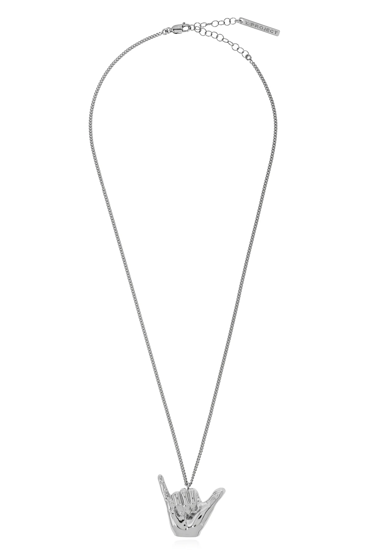 Introducing the Silver Necklace with Charm from the exclusive collection by Y/Project. This distinguished piece features a pendant in the form of a hand displaying the iconic \"hang loose\" gesture, resonating with the spirit of surfing culture. Crafted from a delicate, simple chain, this necklace is equipped with multiple clasp loops, allowing for adjustable lengths to suit your preference. The necklace embodies an elegant and minimalistic design, characteristic of contemporary men\'s jewelry. Made entirely from premium brass, it boasts a sleek silver finish that enhances its sophisticated allure. Y/Project, established in 2010 by Moroccan designer Yohan Serfaty and creatively led since 2013 by Glenn Martens, is renowned for its avant-garde approach. Martens, a Royal Academy of Fine Arts Antwerp alumnus, infuses individuality and independence into his designs, merging street-style vigor with provocative details. Why Choose This Product? Exquisite design with cultural inspiration Adjustable length for personalized comfort High-quality brass with a refined silver finish Designed by the innovative Glenn Martens