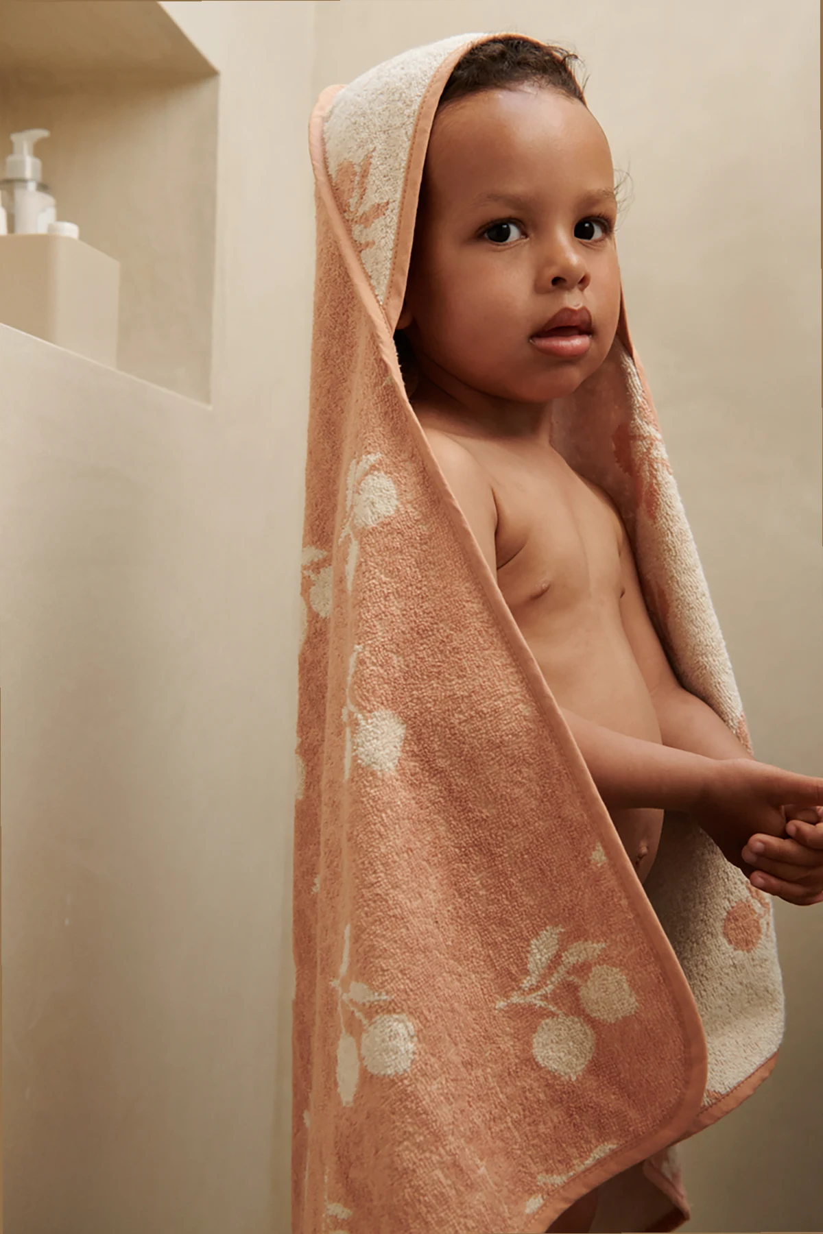 Introducing the Children\'s Hooded Bath Towel by the esteemed designer Liewood, a paragon of luxurious comfort and practicality. This exquisite towel is a harmonious blend of style and functionality, crafted from sumptuous 100% organic cotton. Adorned in a sophisticated orange hue with a delicate floral pattern, this towel exudes an air of elegance. The floral motifs, rendered in a lighter shade, enhance its aesthetic allure. The towel\'s ingenious square design incorporates a hood seamlessly sewn into one corner, allowing for effortless wrapping and warmth post-bath. Meticulously stitched edges further accentuate its superior quality. Why Choose This Product? Crafted from soft, absorbent terry for unparalleled comfort. Features a stylish hood for added warmth. Designed in a chic gray-orange color palette. Perfect for providing cozy, post-bath snuggles.