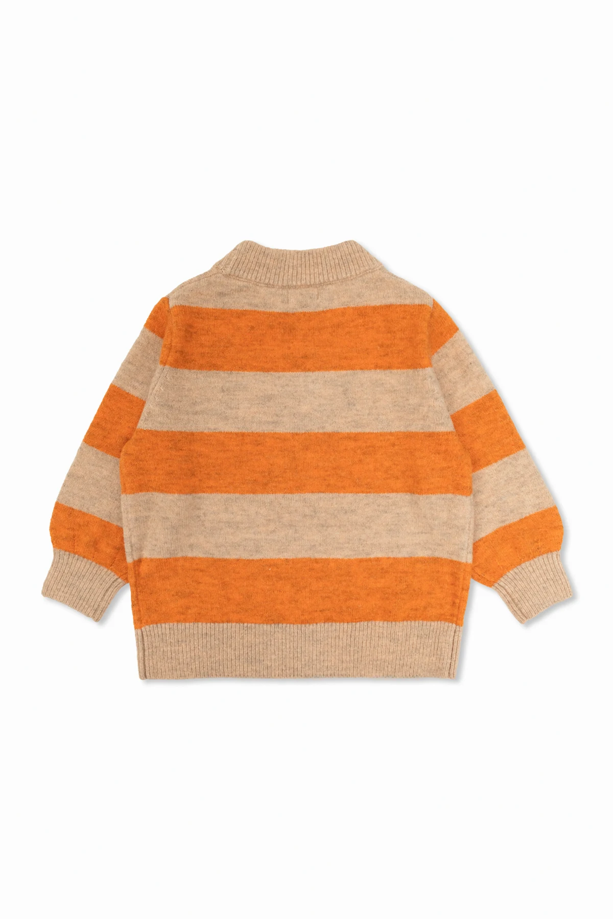 Introducing the exquisite Logo Sweater from the exclusive children\'s collection by Tiny Cottons. This sophisticated sweater boasts a classic, simple cut with long sleeves and a round neckline, perfect for both casual and special occasions. The ribbed cuffs and hem provide a snug fit, ensuring unparalleled comfort. Adorned in a striking orange hue interspersed with wide beige stripes, the sweater features a prominent \"TINY\" inscription in a soft cream color on the front, adding a distinctive touch. The material, a luxurious blend of acrylic, polyamide, wool, polyester, and elastane, feels delightfully soft against the skin, making it ideal for cooler days. Crafted with meticulous attention to detail, this high-quality garment is designed for boys aged 4 to 14, embodying the modern, casual style that Tiny Cottons is renowned for. Established in 2012 in Barcelona by Barb Bruno and Gerard Lazcano, this brand draws inspiration from the vibrant city, enchanting stories, and travels, bringing functional and stylish designs to young wardrobes. Why Choose This Product? Elegant and timeless design with a modern twist High-quality craftsmanship Comfortable and soft material suitable for cooler weather Perfect for both everyday wear and special occasions Distinctive and stylish with the \"TINY\" logo