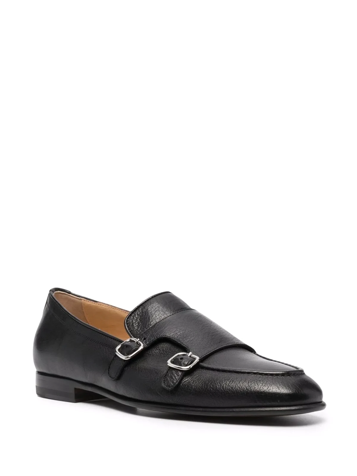 black calf leather side buckle fastening almond toe slip-on style flat leather sole branded insole