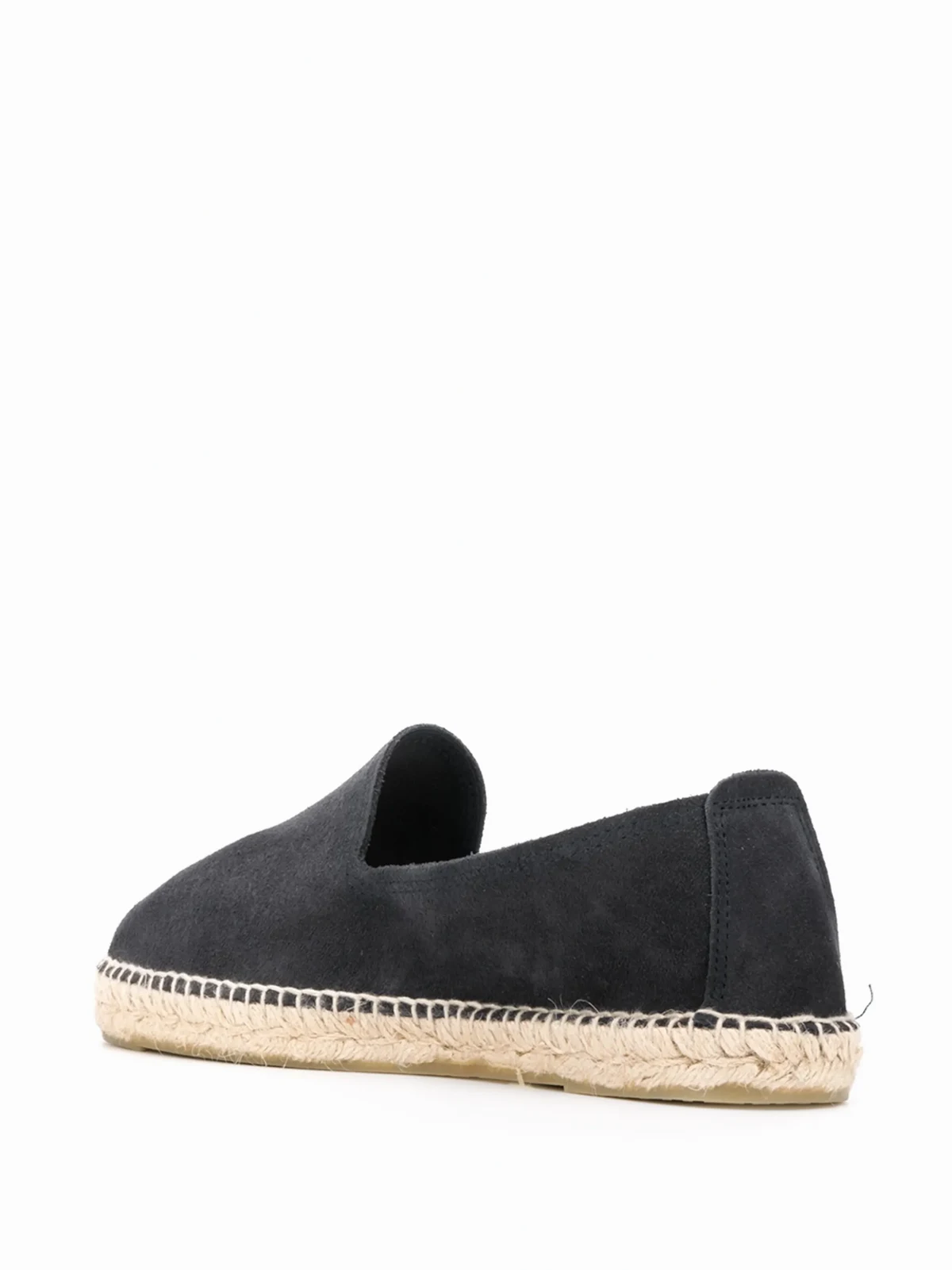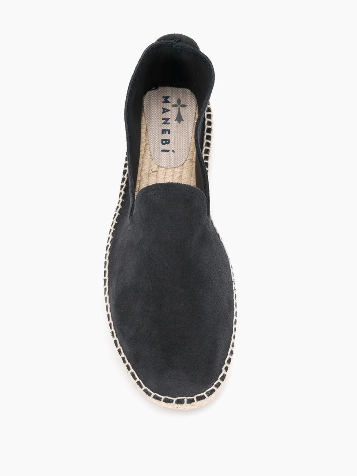 Navy suede slip-on espadrilles from Manebi featuring a round toe, a branded insole, a back embossed logo stamp and a flat sole.