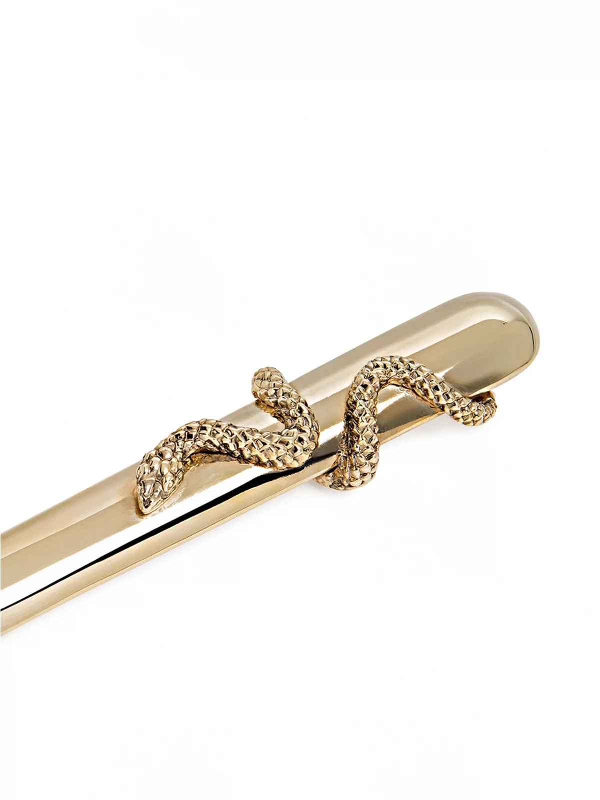 Gold-tone brass Snake letter opener from L’Objet featuring a polished finish and a serpent wrapped around the base of its widened handle.