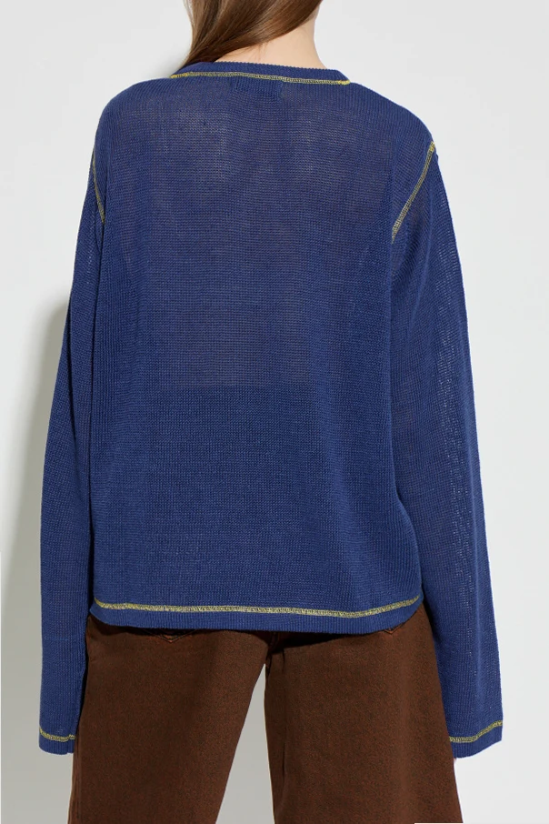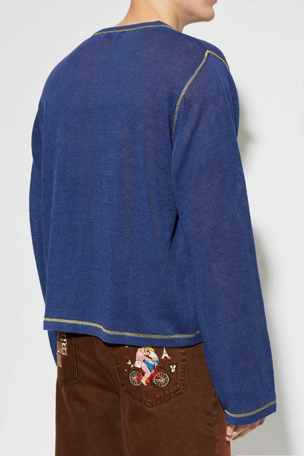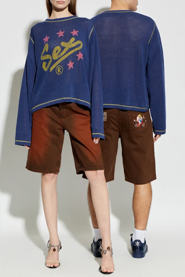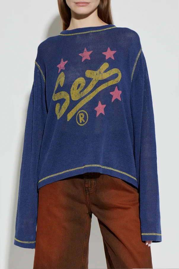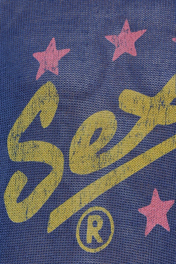 Expertly fashioned from a refined blend of linen and cotton, this lightweight, delicately translucent knit exudes airiness and comfort, perfectly suited for any season. The distinct mesh texture beautifully contrasts with a commanding yellow logo-inspired print on the front, boldly encircled by six vibrant pink stars and accented by a signature ® symbol.
