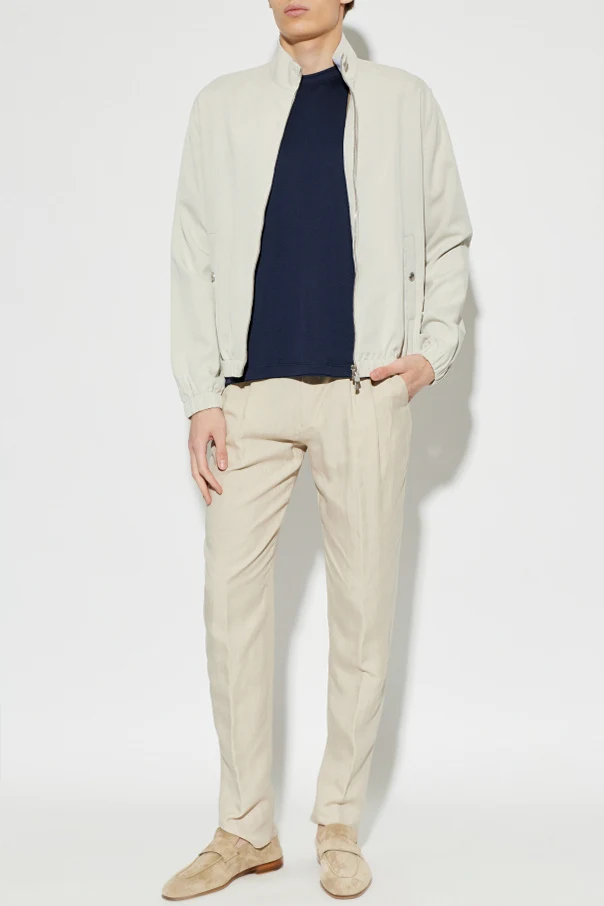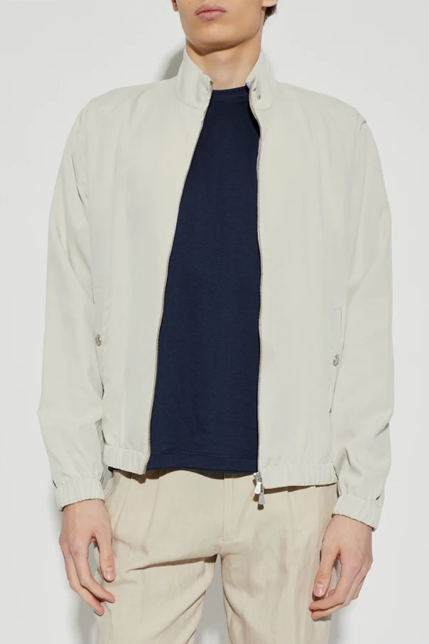 Elevate your outerwear collection with this Silk Stand Collar Jacket by Eleventy , a refined embodiment of minimalist sophistication. Crafted from smooth, subtly lustrous silk, this jacket offers unparalleled softness and a weightless drape for a truly elevated wearing experience. Its thoughtfully tailored silhouette features gently contoured shoulders, a classic straight sleeve, and an elasticized hem and cuffs for a modern yet slightly sporty appeal.