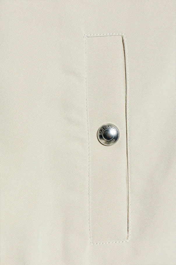 The signature short stand-up collar lends a contemporary, clean-lined look, while a full-length central zipper with polished metal accents underscores the piece’s elegant character. Two side pockets, each finished with a silver snap fastener and a bespoke metal-branded button, add both functionality and unique detail—subtly affirming the jacket’s exclusivity and craftsmanship.