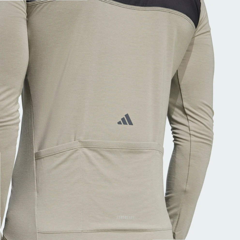Adventurous days on the bike require versatile gear. This adidas cycling jersey is purpose-built with the demands of mixed-surface and adventure rides in mind. AEROREADY manages sweat to keep you feeling dry and comfortable through extended efforts, while a windproof zone on the upper chest and shoulders cuts the chill on descents while letting your core breathe. A quarter-zip lets you vent or zip in warmth as needed, and an overall soft, stretchy knit lets you bend and twist on and off the bike without restriction. A traditional three-pocket design across the back puts ride essentials within easy reach, and reflective 3-Stripes add low-light visibility.Made with a series of recycled materials, and at least 70% recycled content, this product represents just one of adidas' solutions to help end plastic waste.