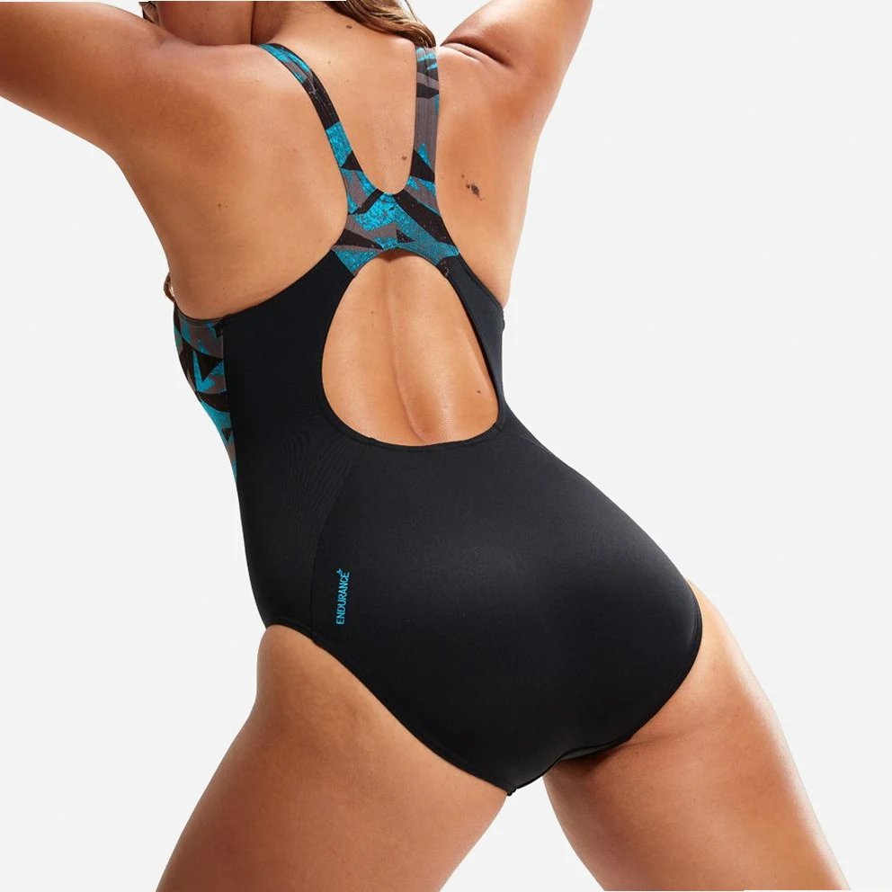 Make a statement in Boom logo prints. Celebrating the Speedo brand, this sporty Muscleback features flattering shaped side panel splices of our shattered Boom logo print in vivid shades of blue and navy. The muscleback design and medium leg offer flexibility and freedom of movement, so you can rock your workout in comfort. Designed to be durable and better for the environment, the suit features our new ECO Endurance+ fabric which is 100% chlorine resistant, quick-drying and made from 50% recycled materials.