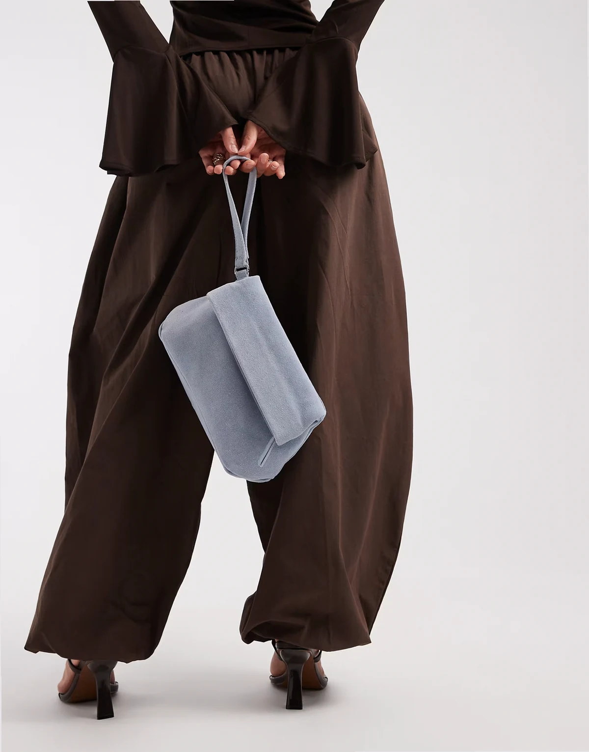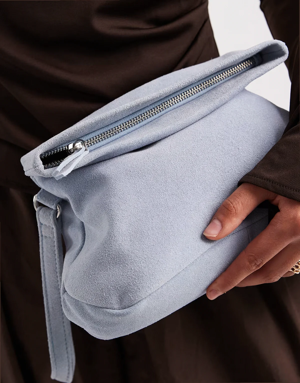 suede clutch bag with fold corner detail and detachable crossbody strap in dusty blue